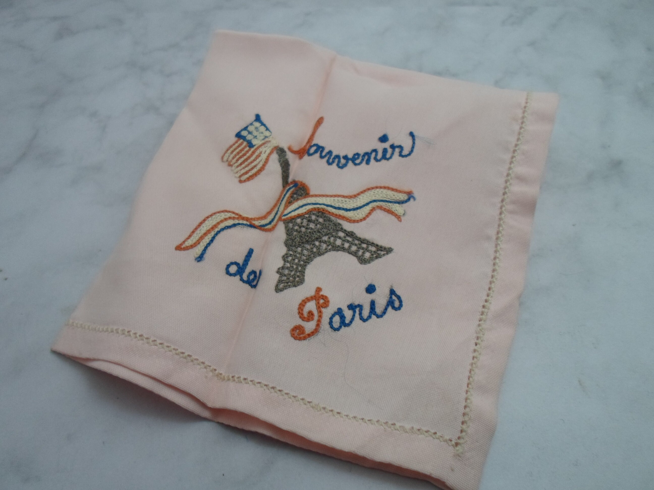 Vintage Souvenir of Paris Pink Silk Handkerchief Embroidered WWI Early American Flag Eiffel Tower