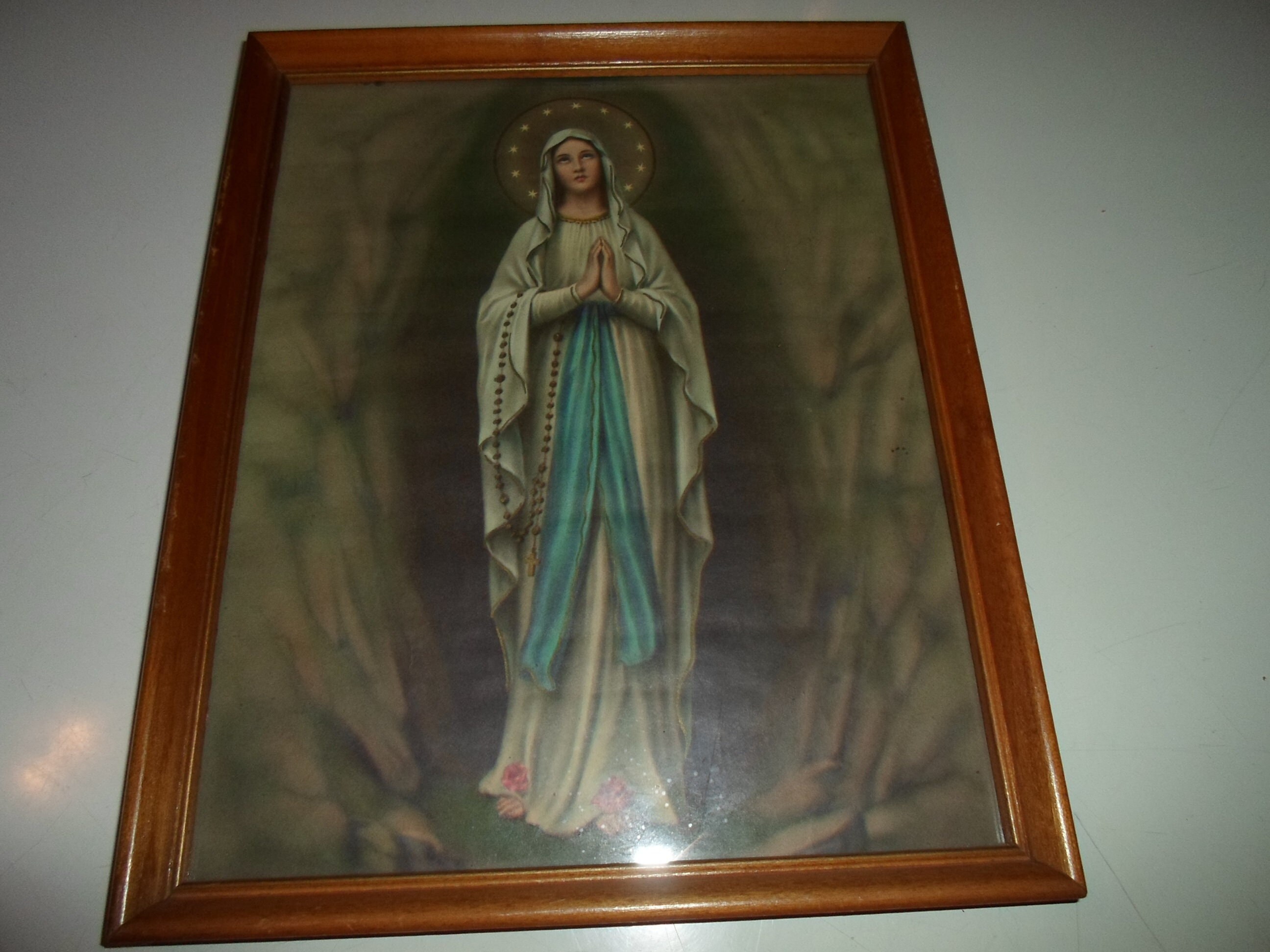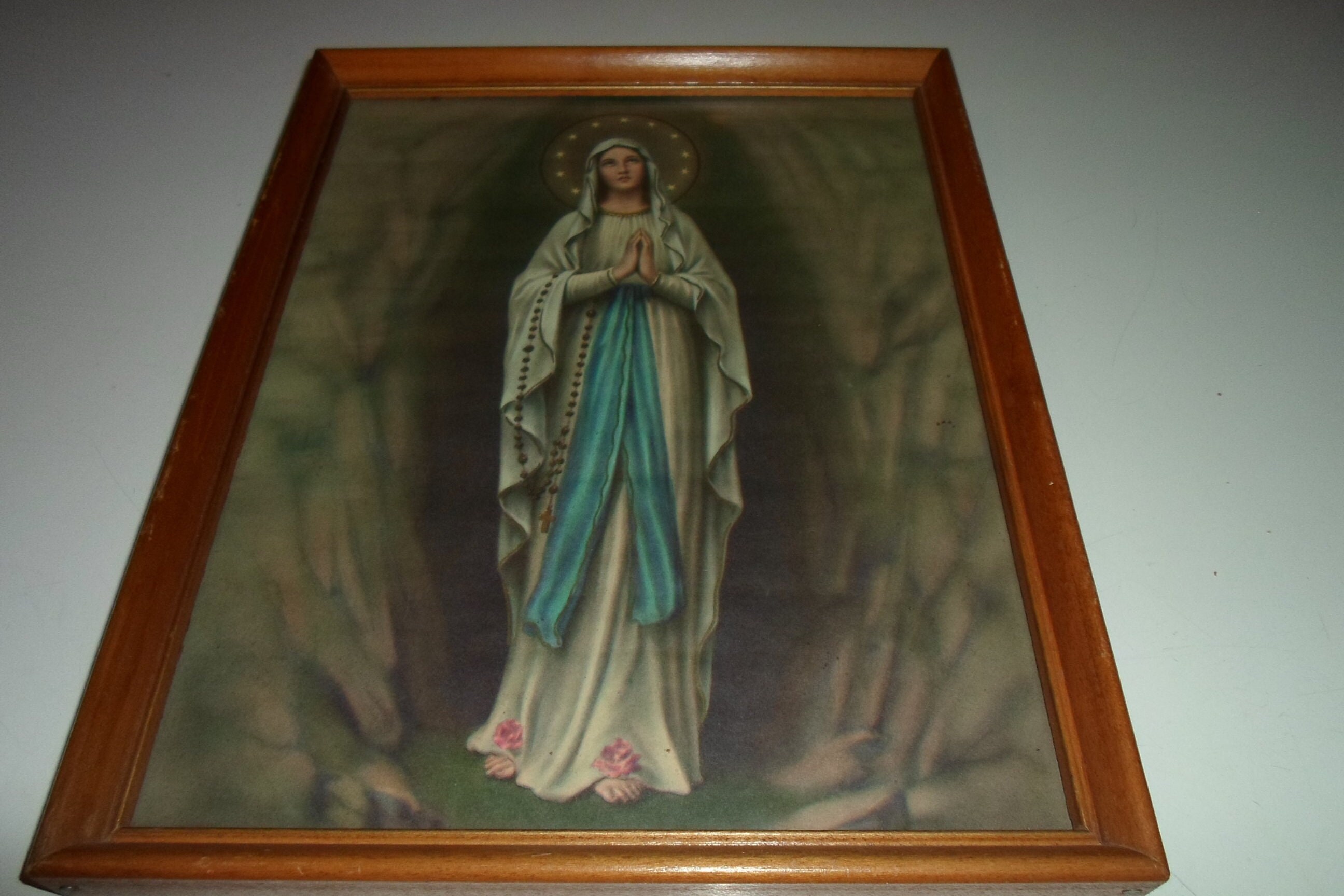Vintage Blessed Virgin Mary Madonna Print in Wood Frame Star Halo Holding Rosary Roses At her Feet 1950's
