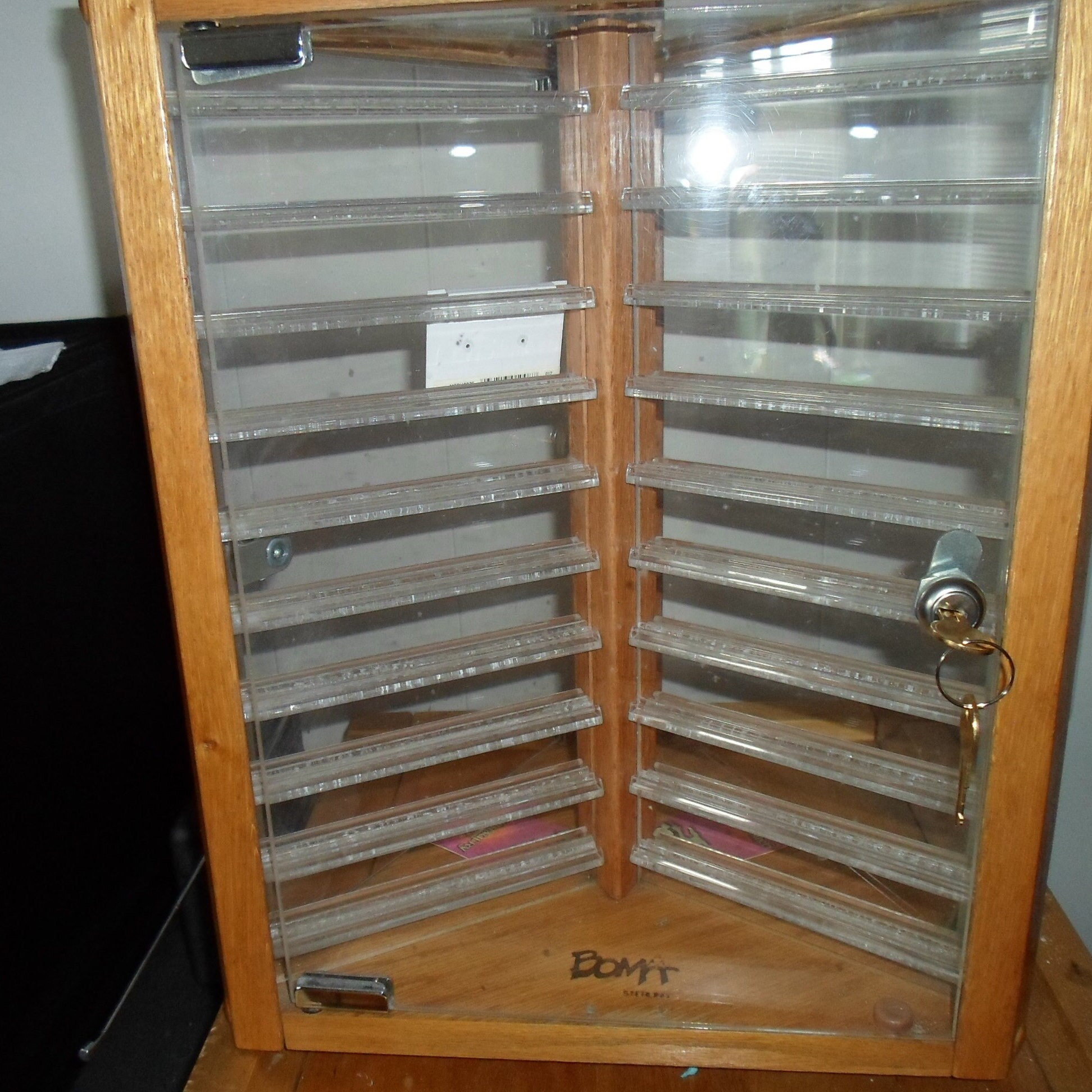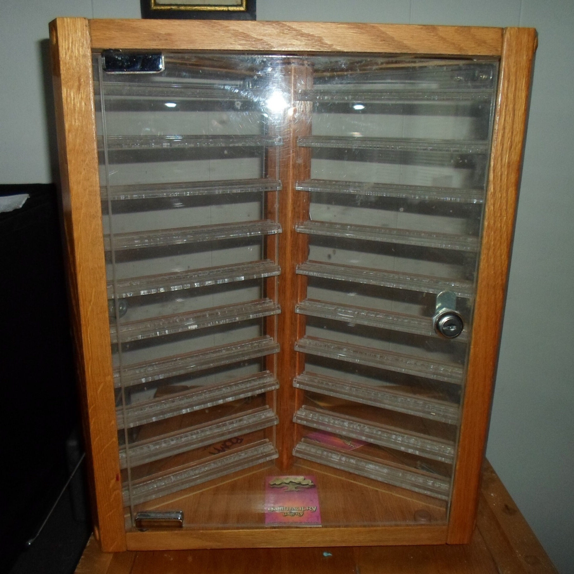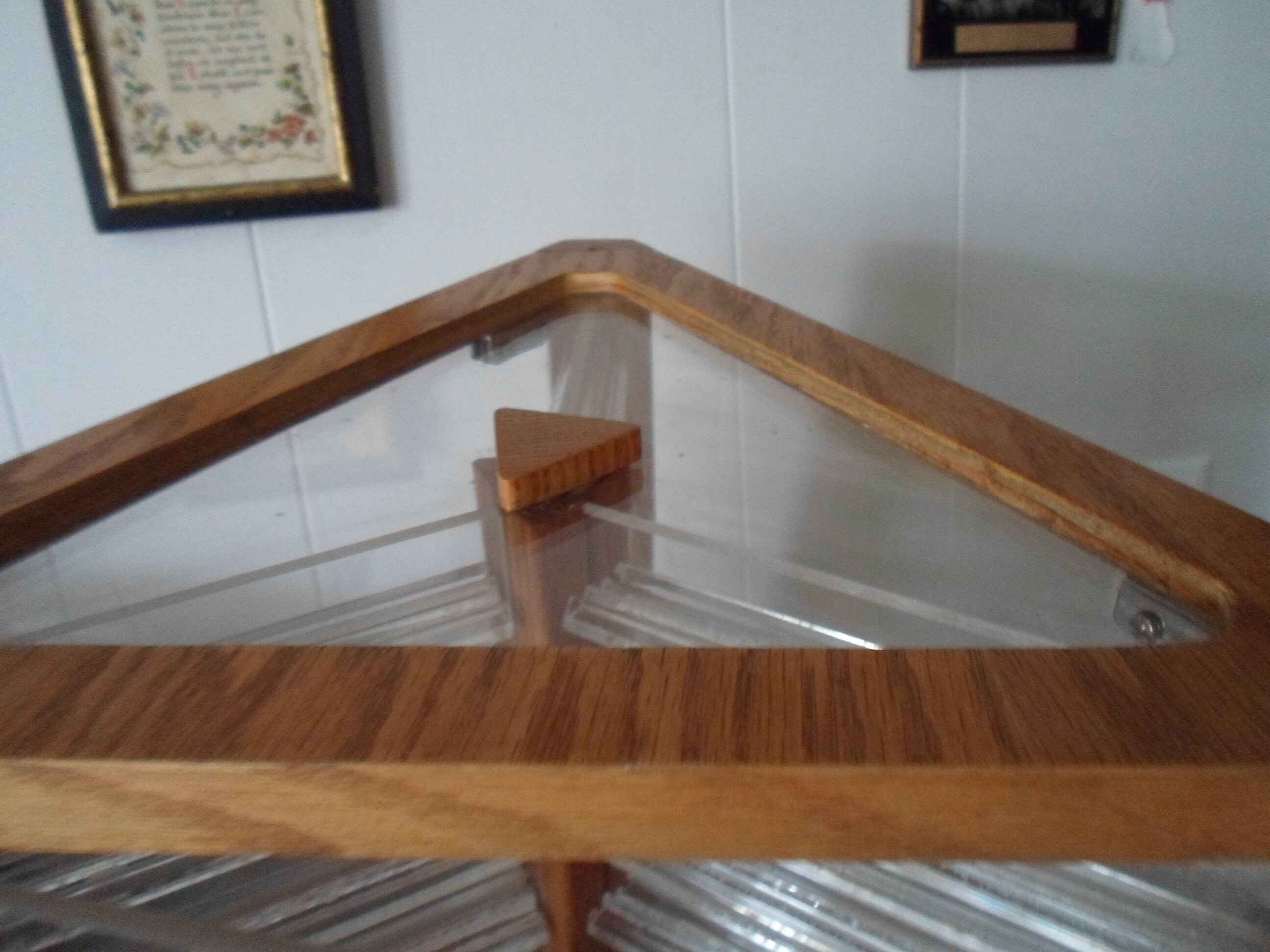 Vintage Spinner Showcase All Oak Wood and Lucite with 2 Keys and Locks Great Size Triangle Shape
