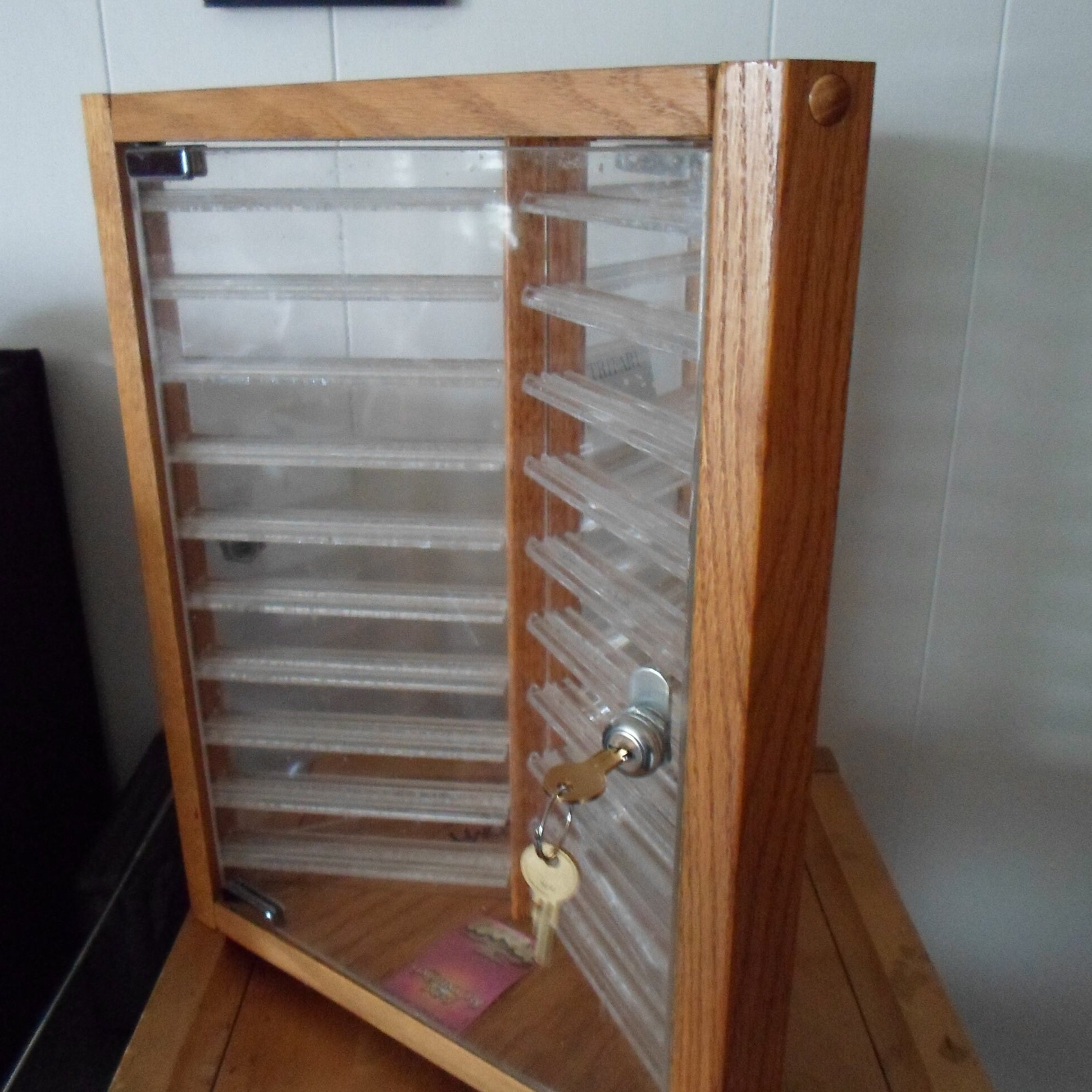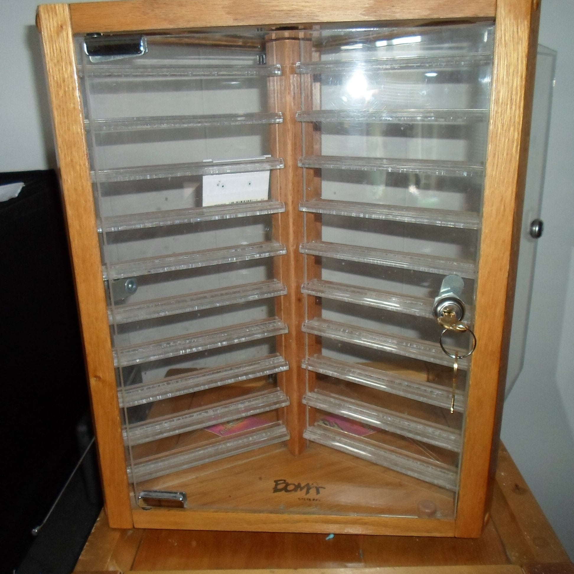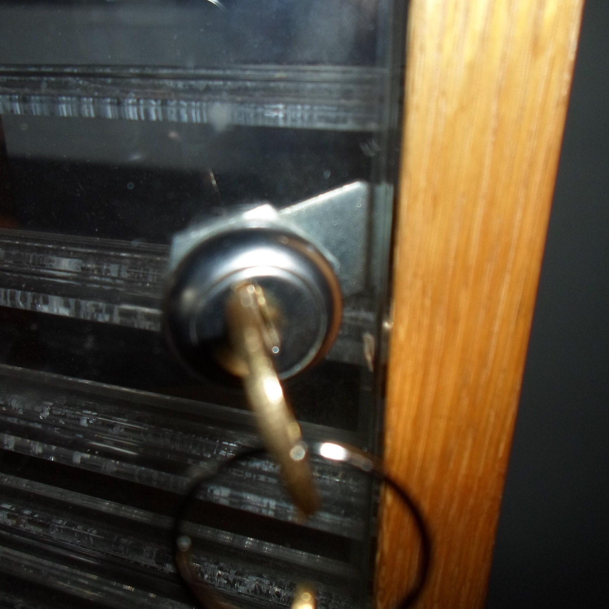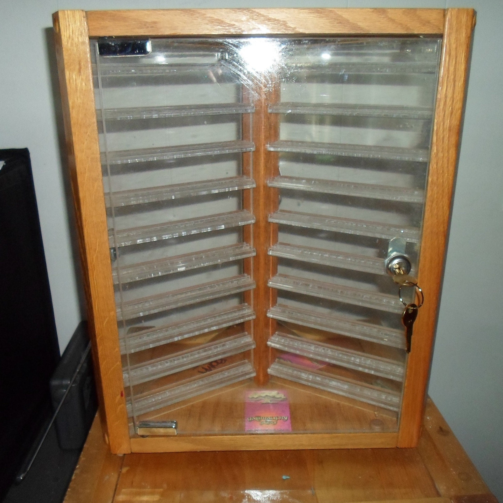 Vintage Spinner Showcase All Oak Wood and Lucite with 2 Keys and Locks Great Size Triangle Shape