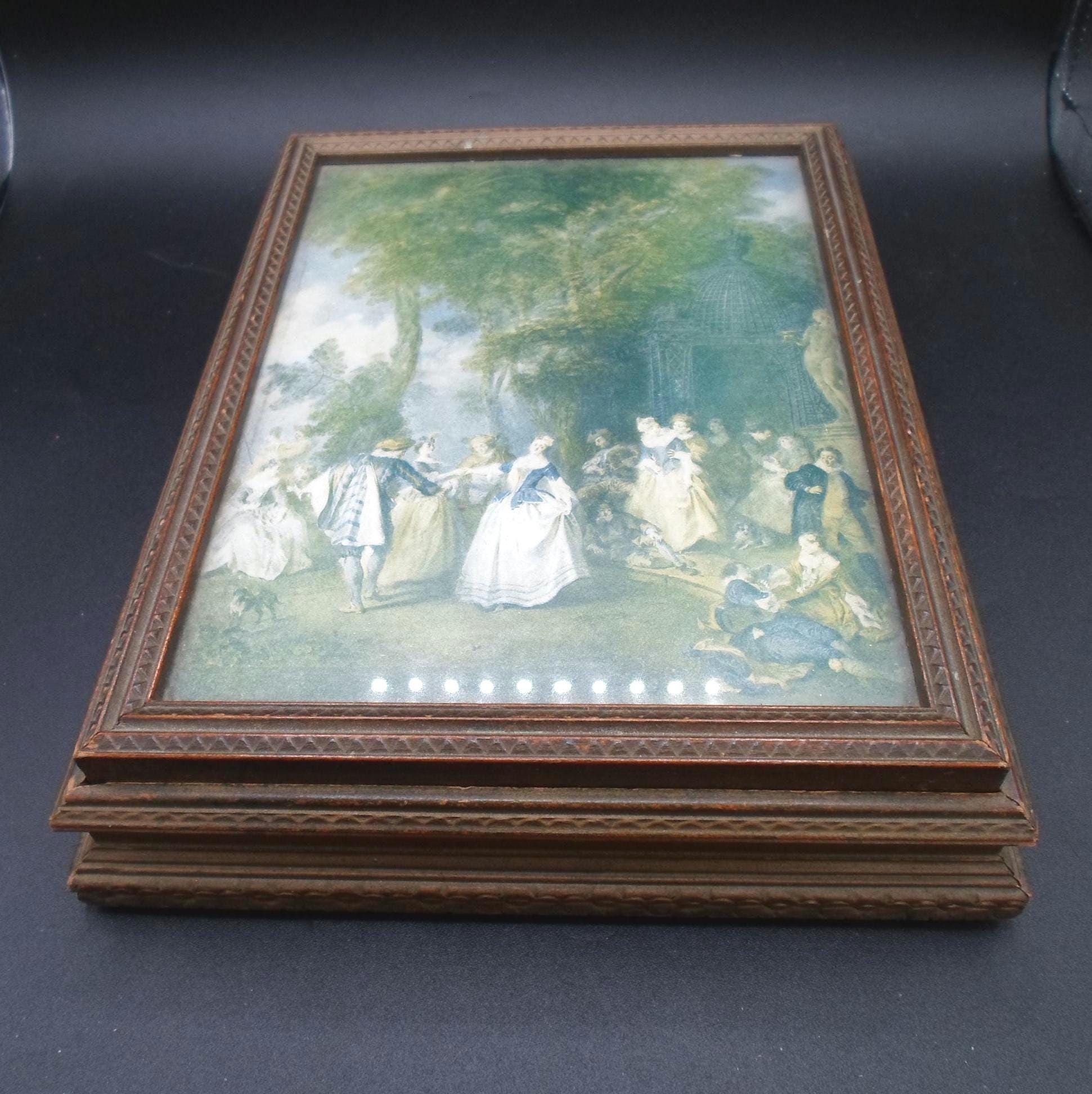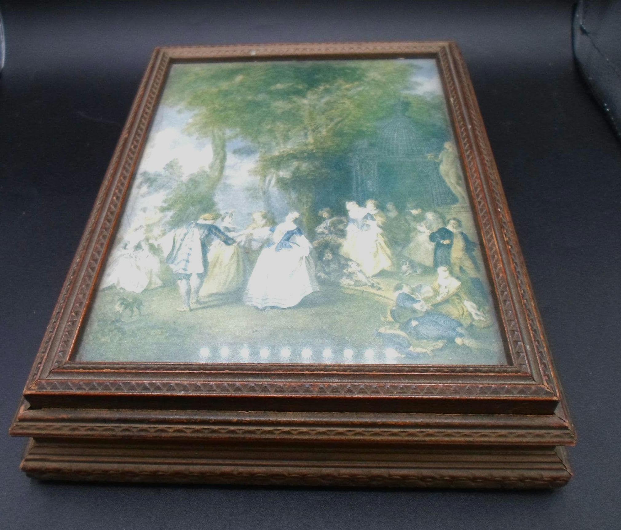 7"w x 9"h x 2d" Stepped wood frame box with glass top covering beautiful French style picture. Inside is Glass lined with Foil Mirror and divided sections. Good Vintage condition note photos. Top wiggles a bit when opened. Beautiful 1940's quality era.