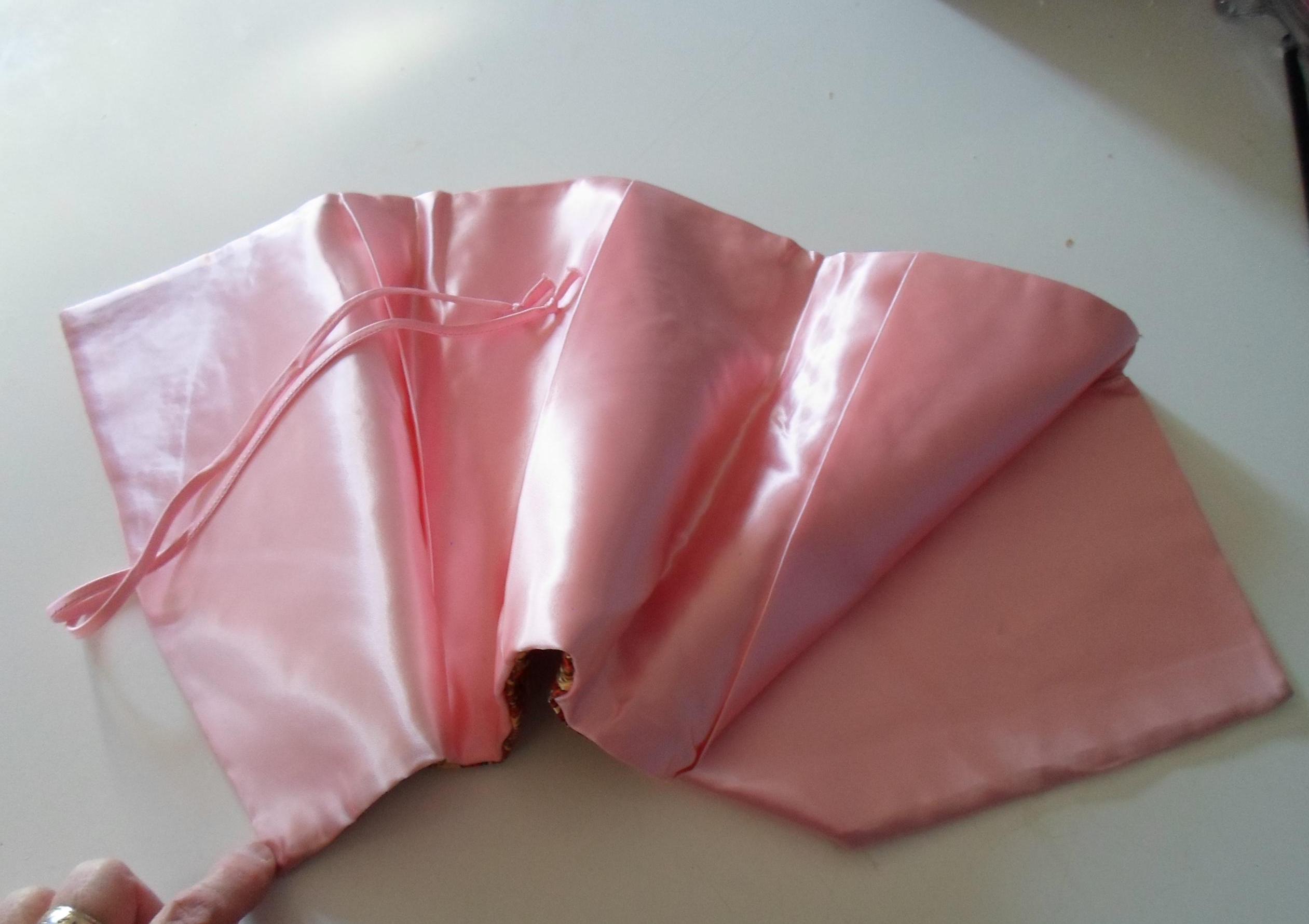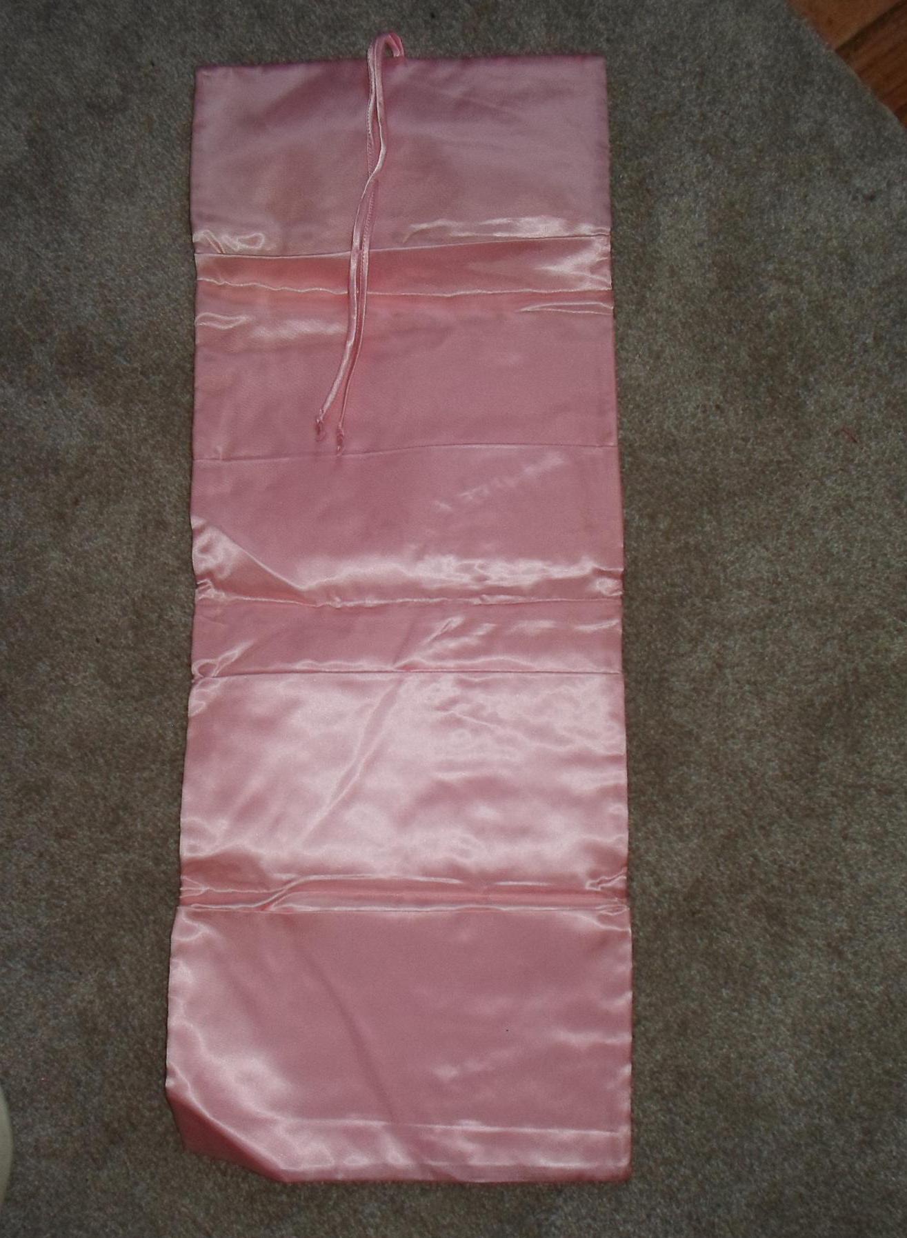 15"wide when opened it it 27"long. Fold to close and tie. 4 soft satin pockets for undies cash, stockings etc.