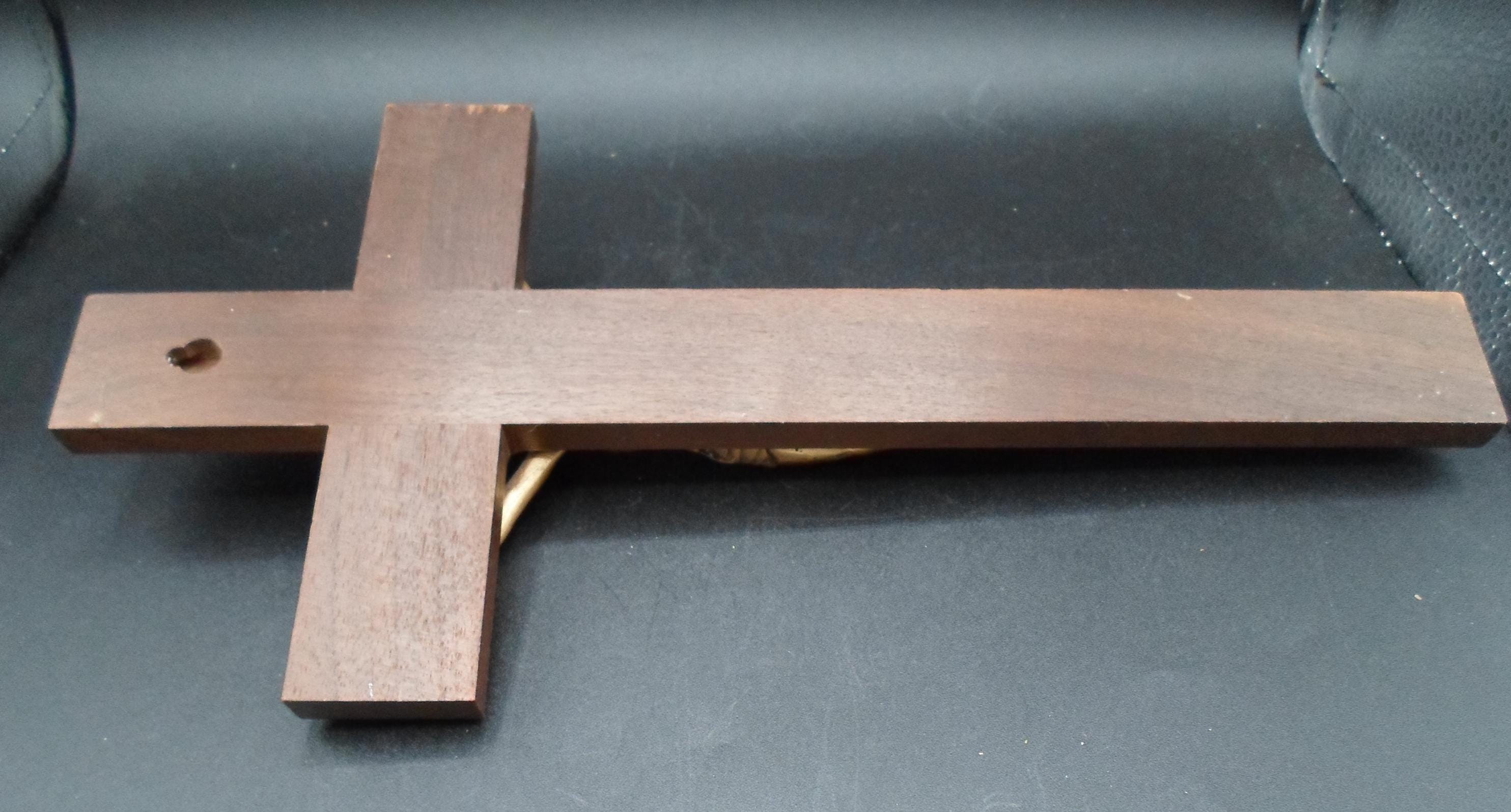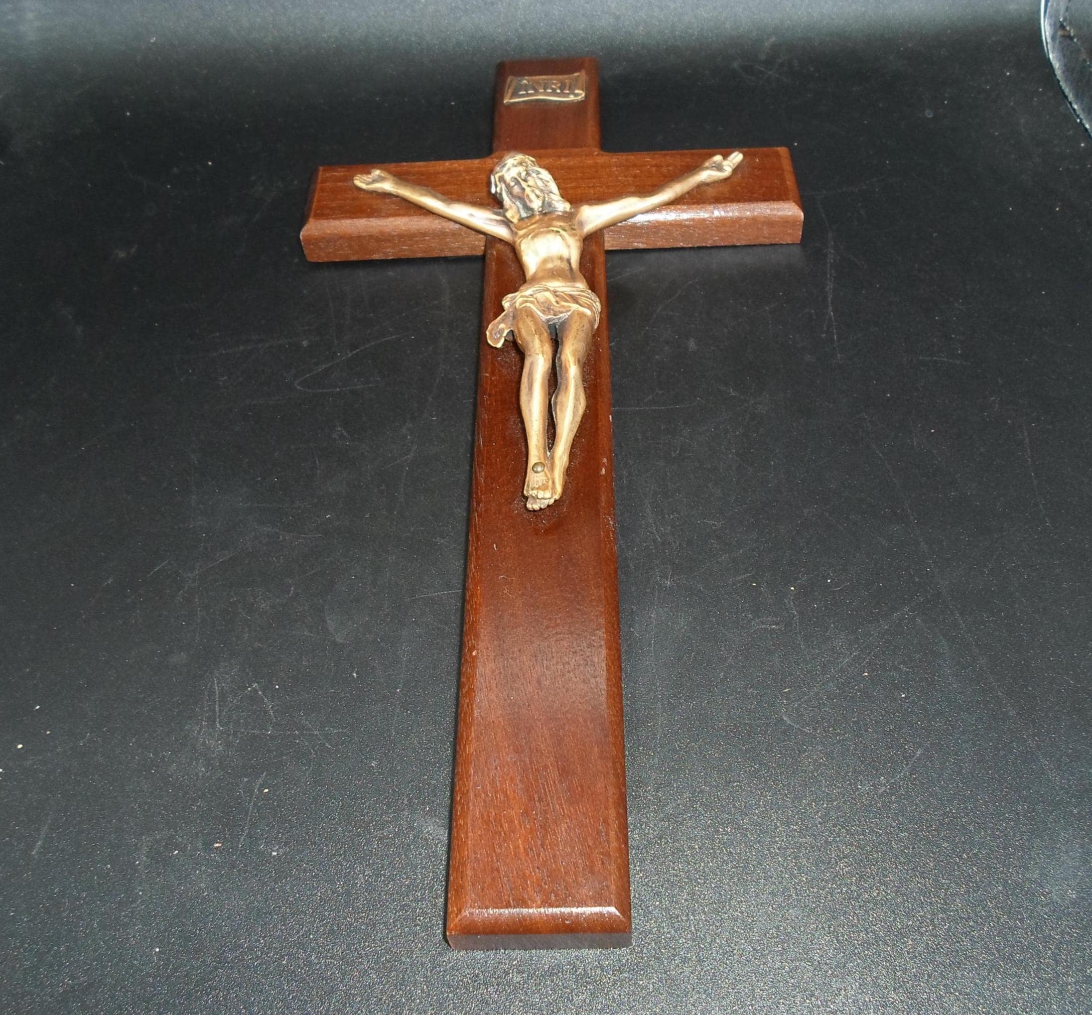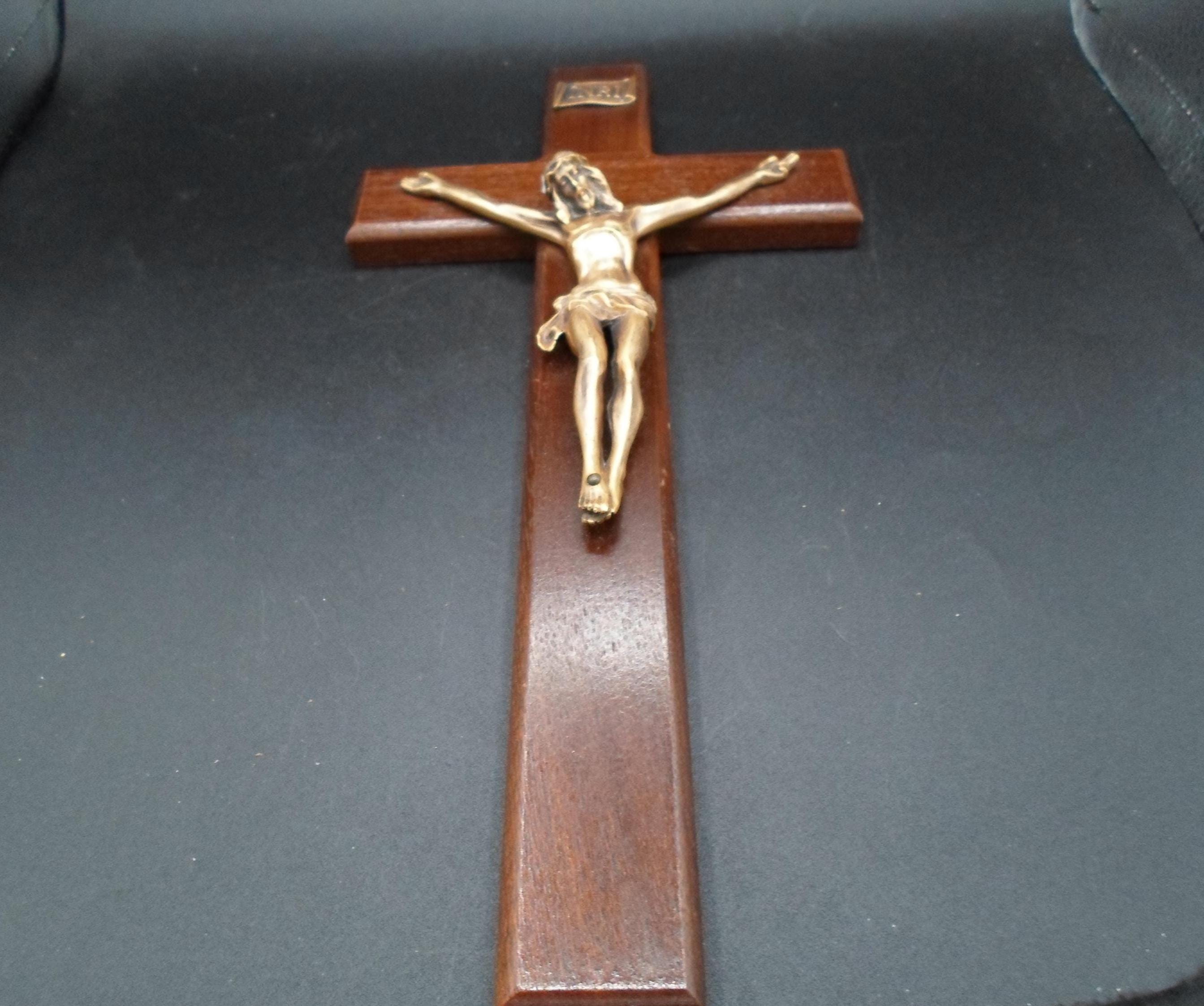 12"Long 6"Wide .25"Thick Mahogany Cross with beveled edges. Stunning Brass Gold Leaf Figure of Jesus Christ and the INRI Symbol above his head. Quality old world item not found today. 1950's/60's era.