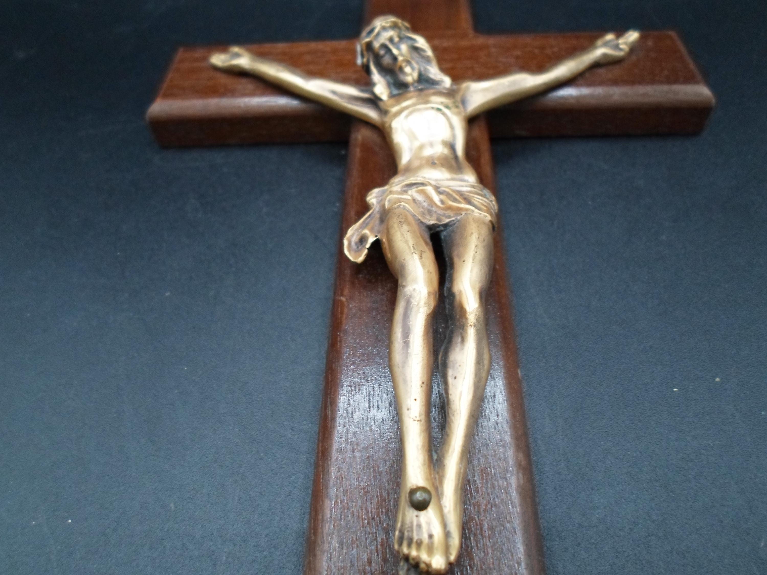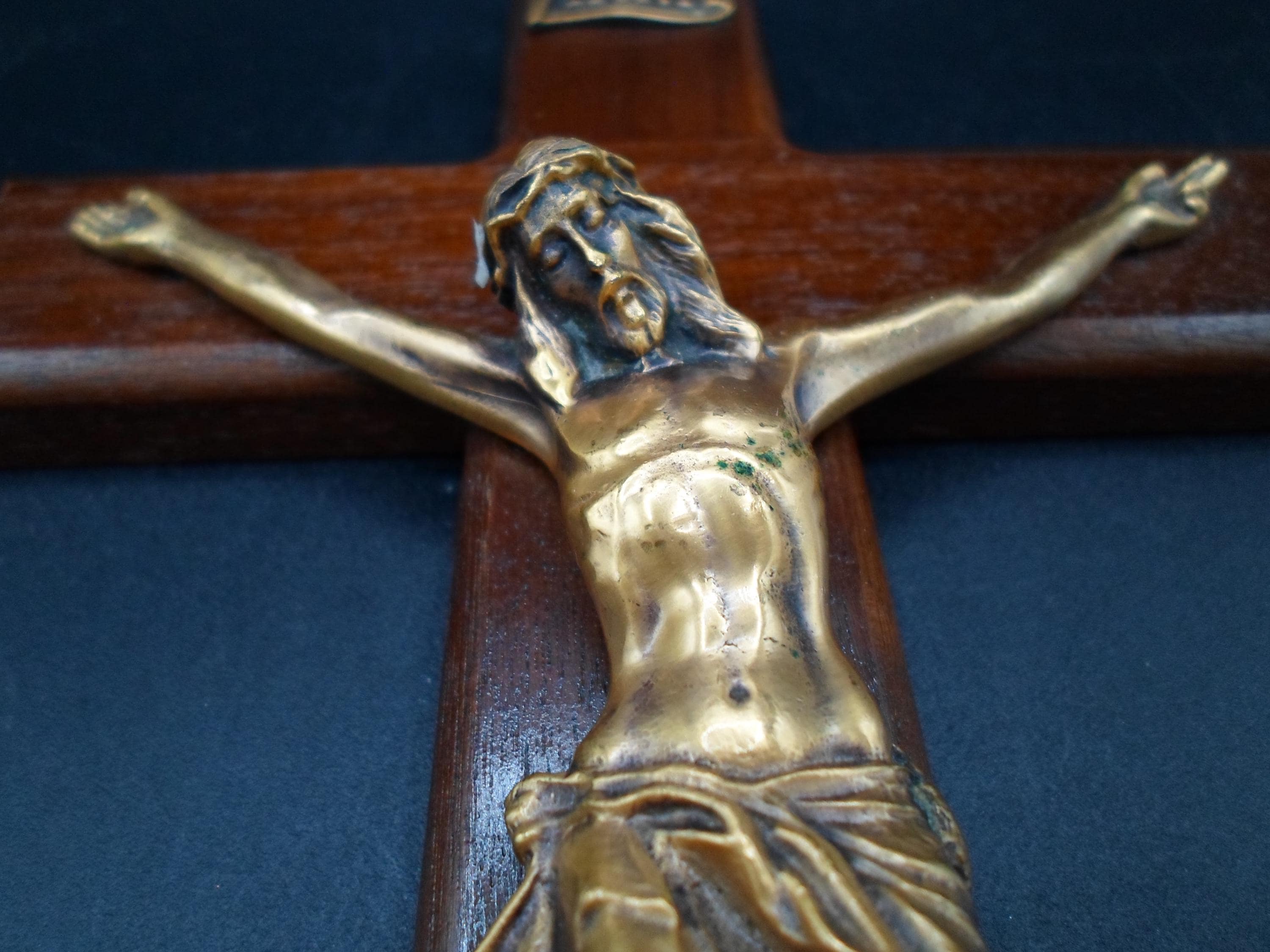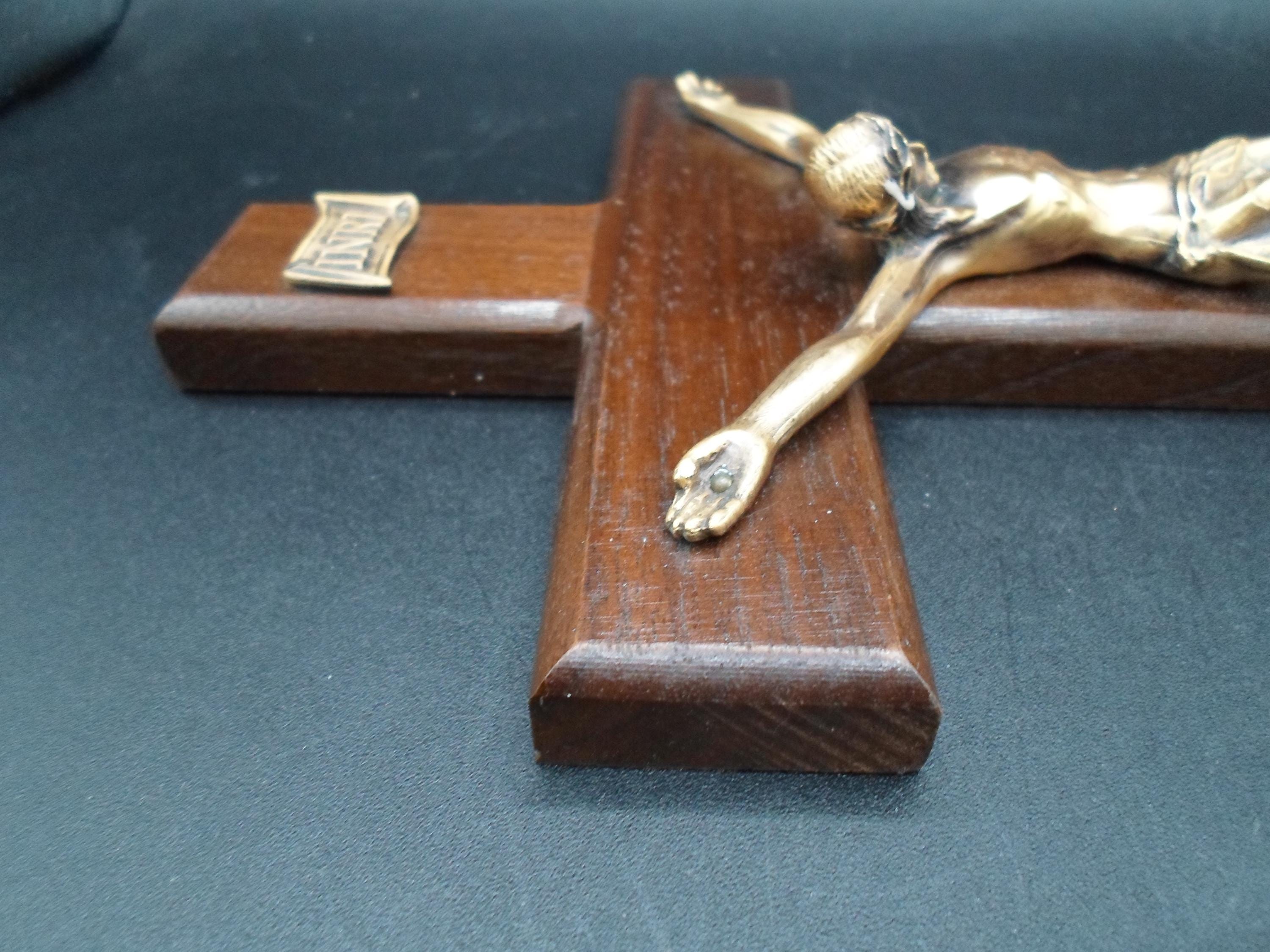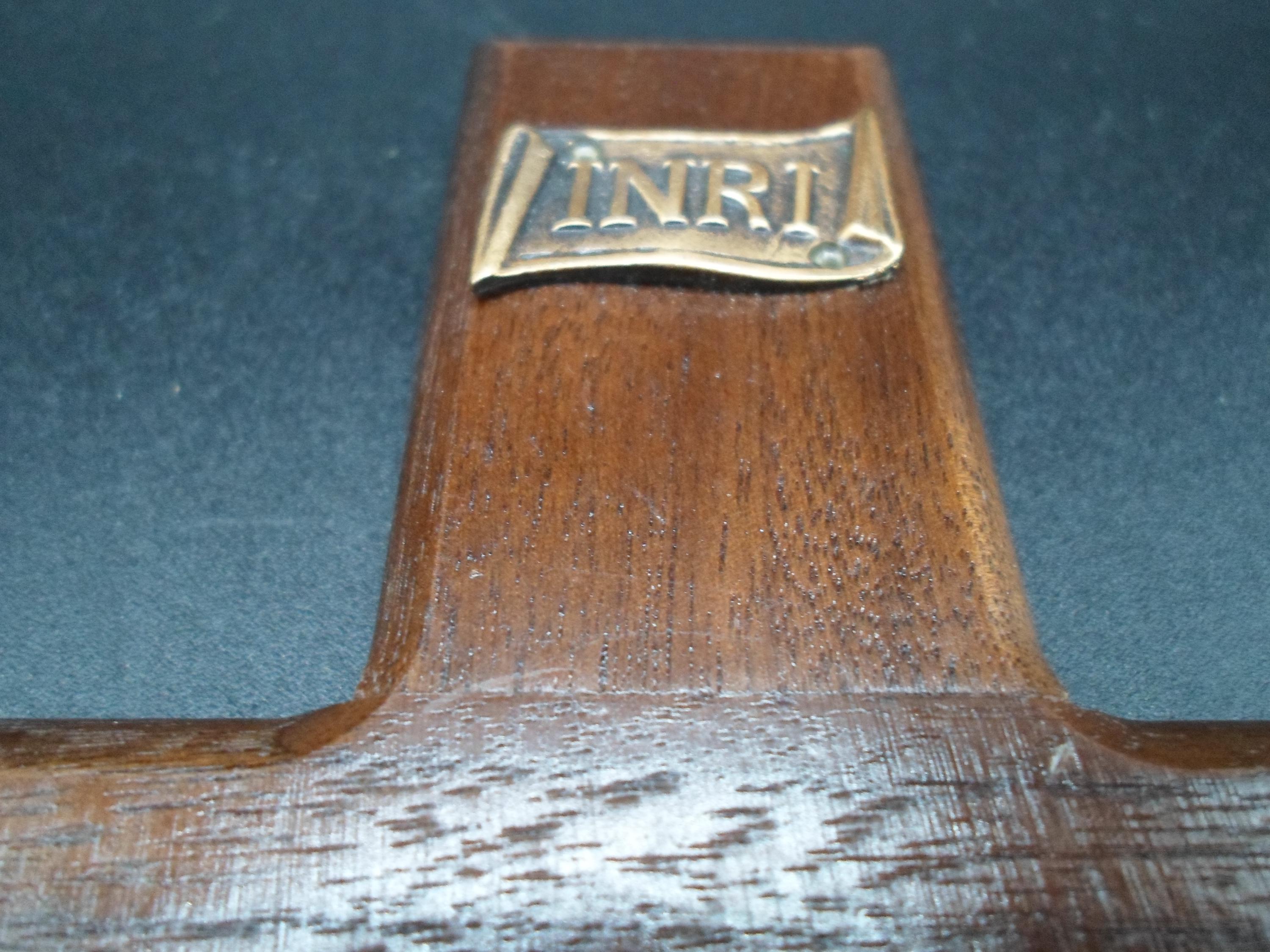 Vintage Mahogany Crucifix with Polished Brass Figure, INRI