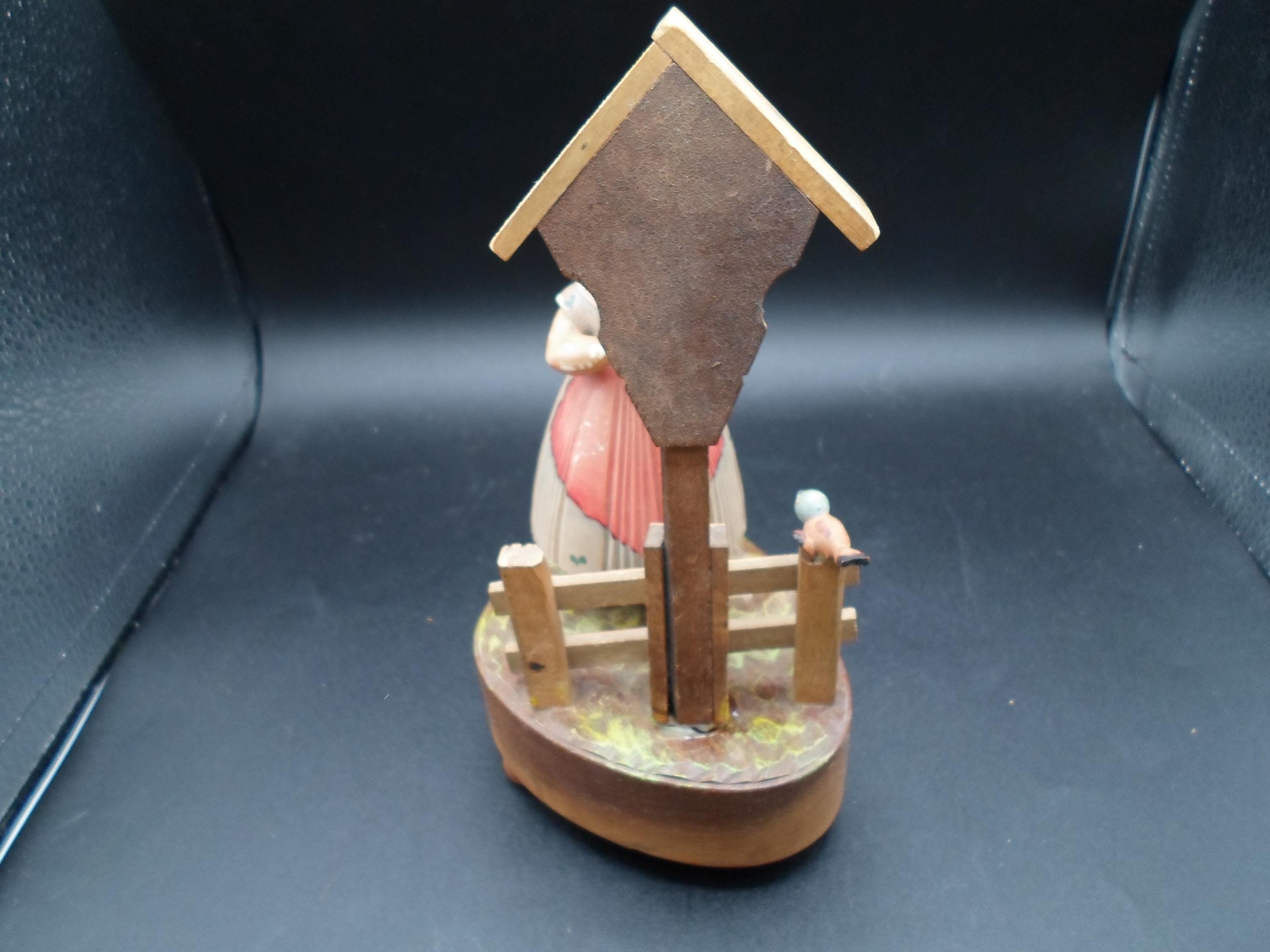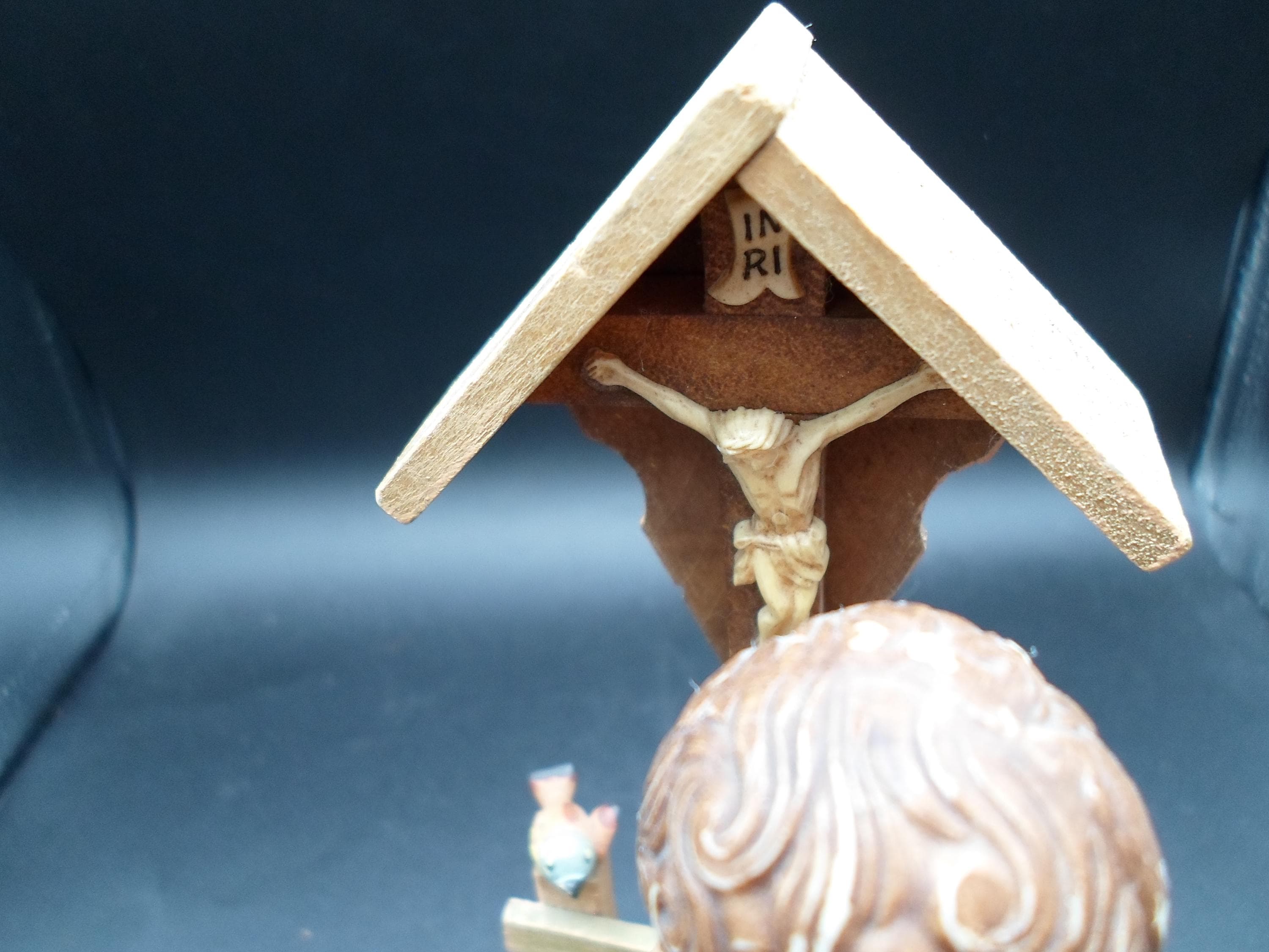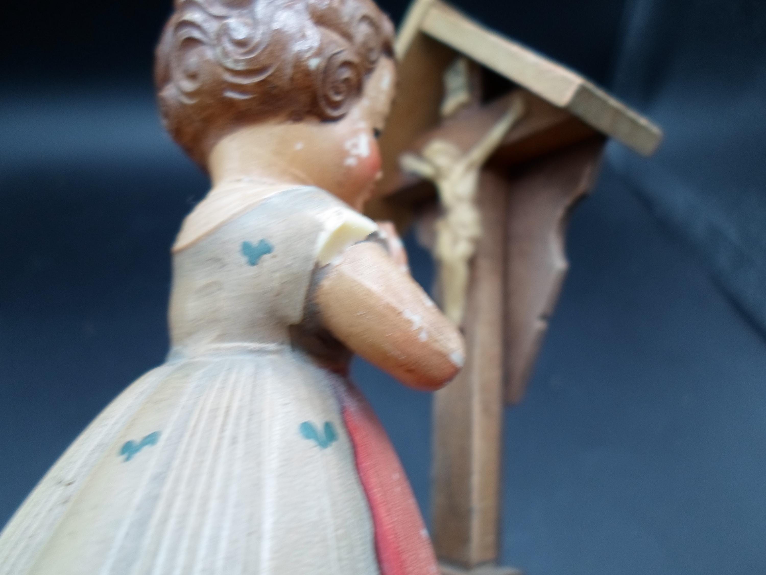 8"h x 4"w Girl praying at a wayside stand crucifix. There is a place for a music box which is missing. Some light chips but sturdy and really an Adorable Vintage item. Possibly Andre Rouge.
