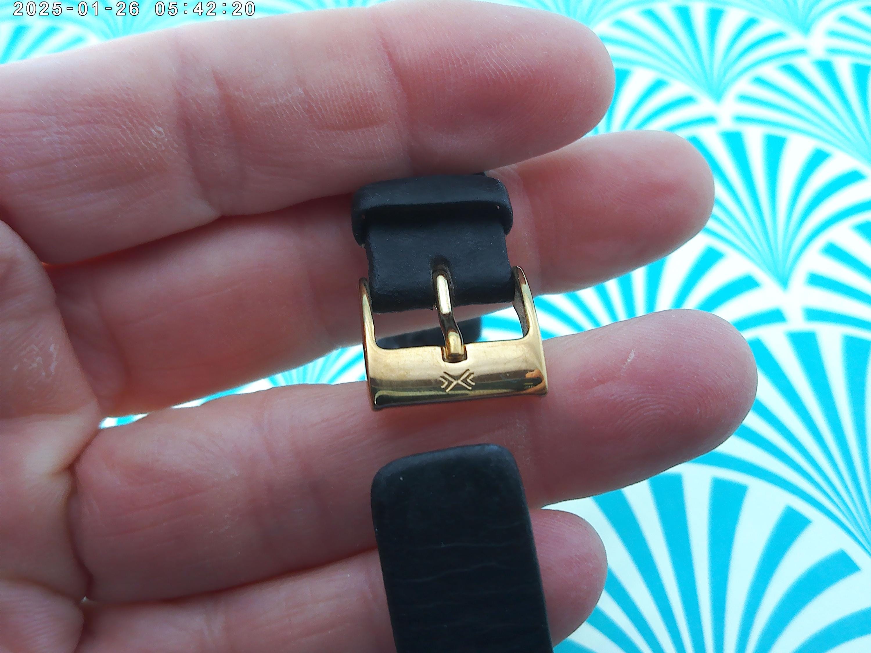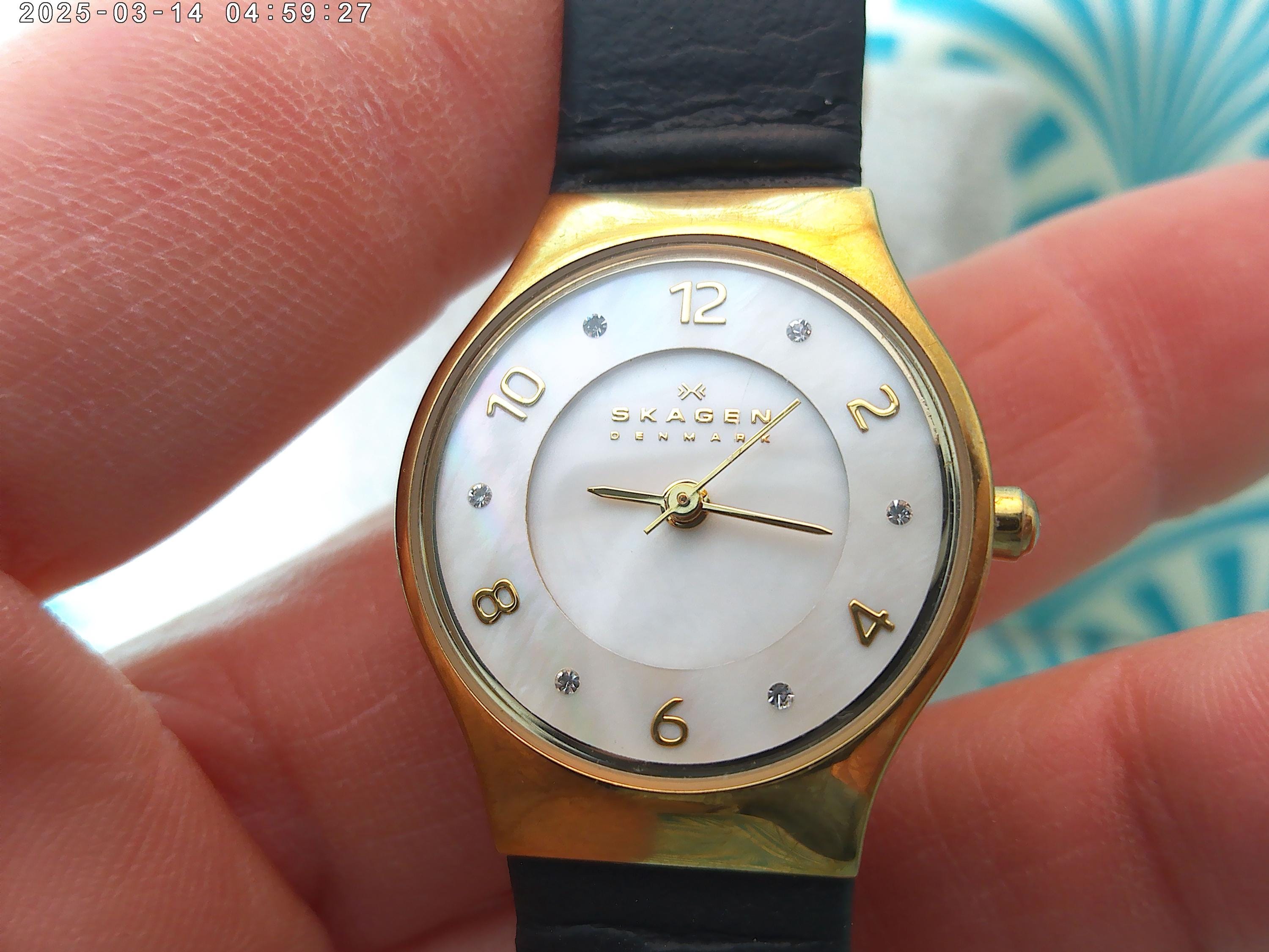 Vintage Skagen Denmark watch for women SKW2209 gold tone, black leather band pearl tone face, crystal details Works. beautiful and classic