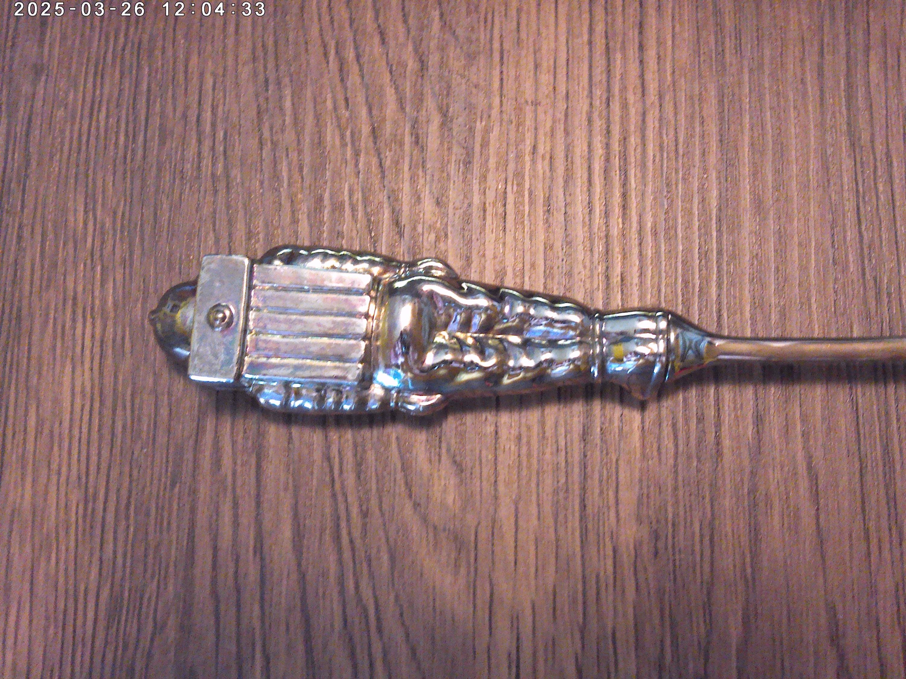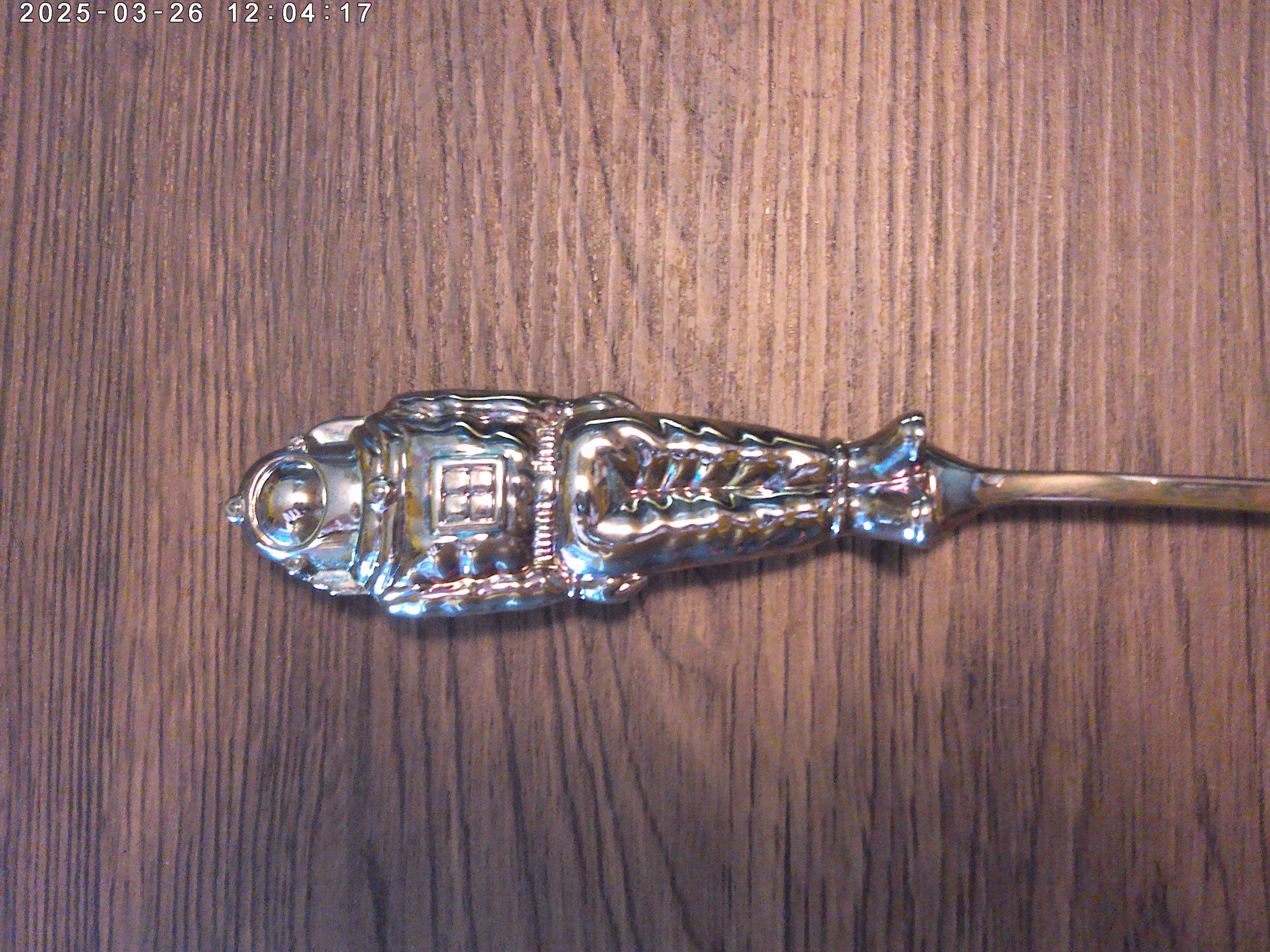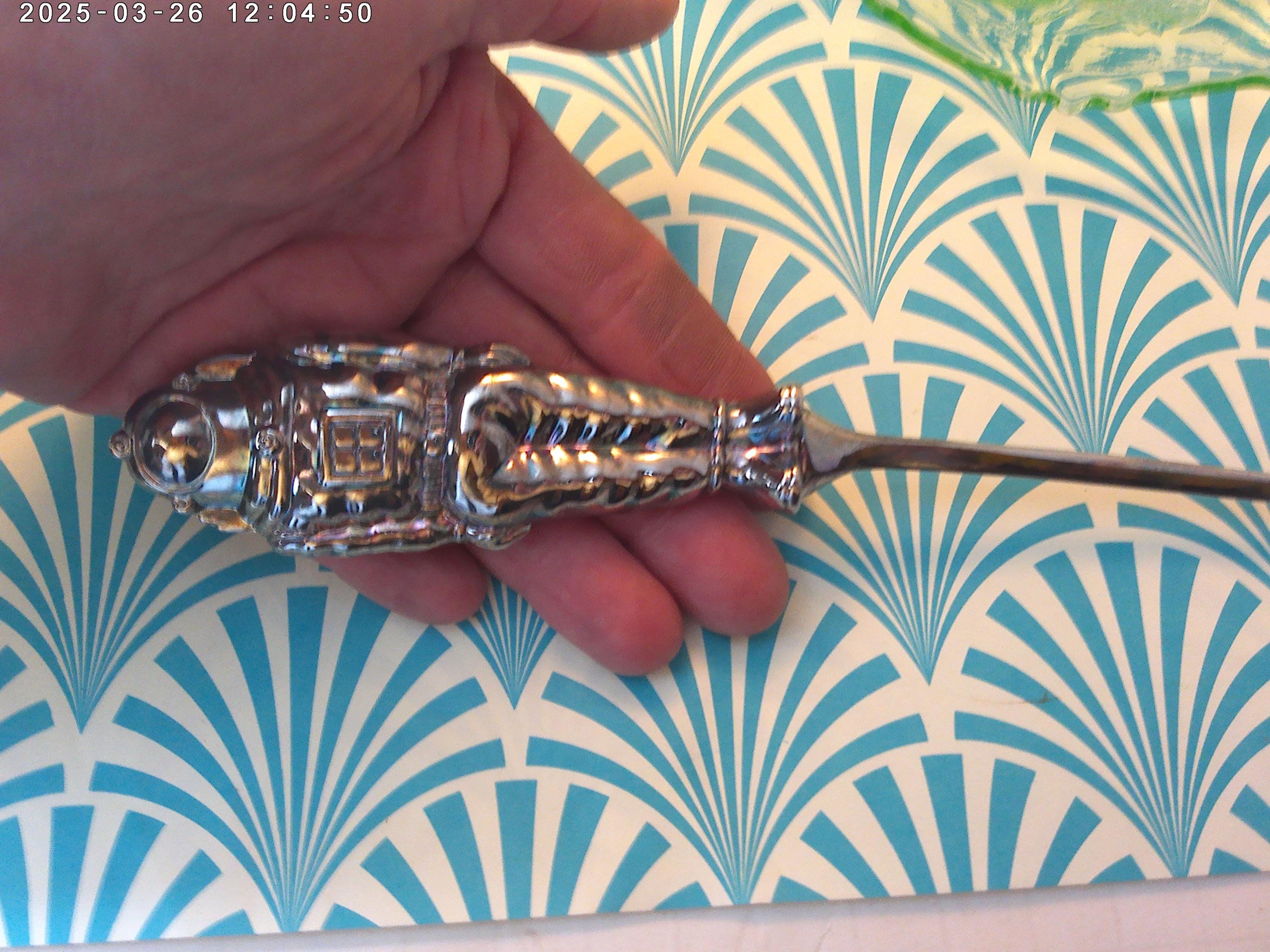 Astronaut is the handle, measures: 4" (astronaut only) full spoon is 9" it is silver plated and can be polished to your taste, heavy or with some antique patina that brings out the details.