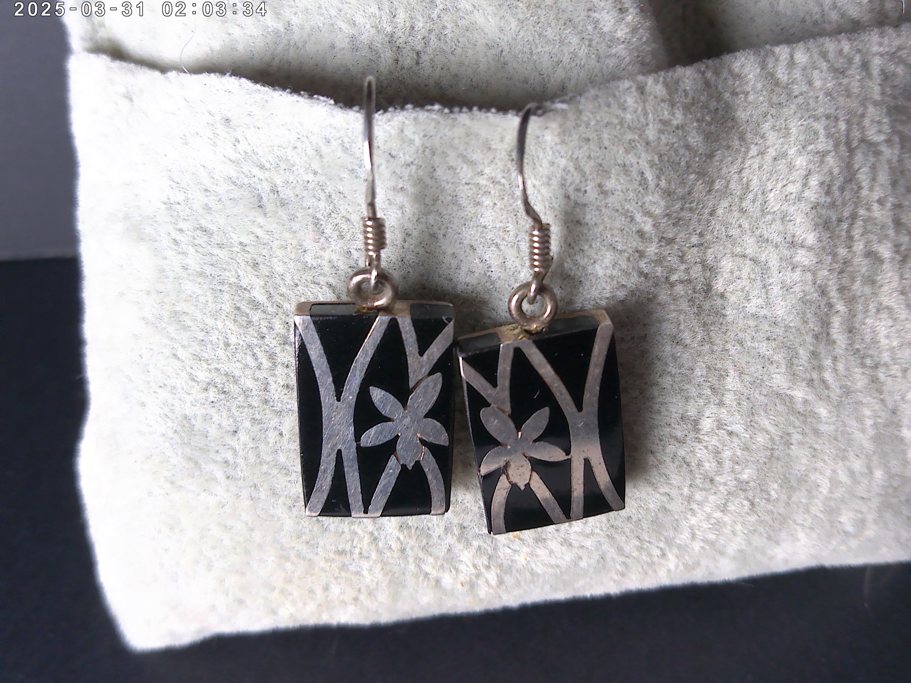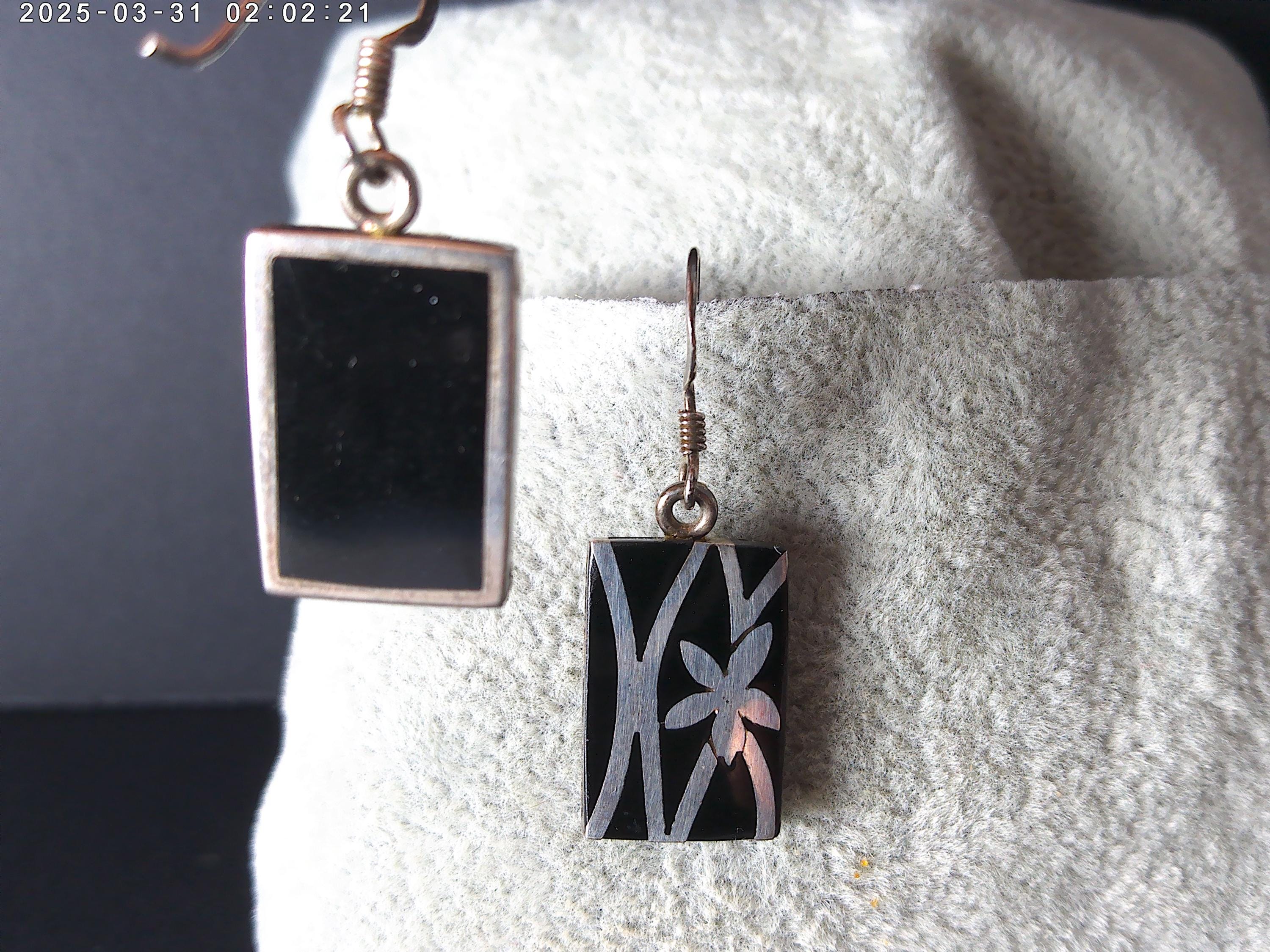 Vintage 90's dangle earrings, Sterling silver and onyx Bamboo design