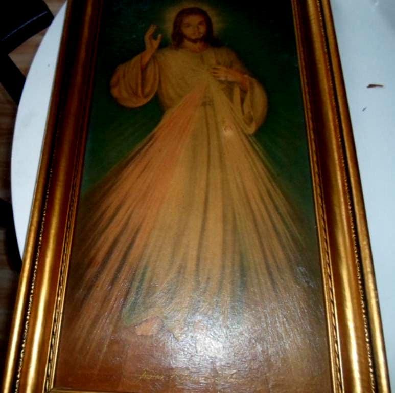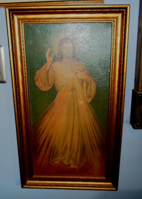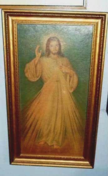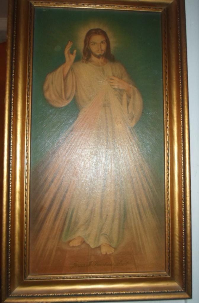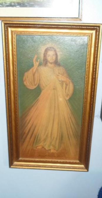 25"x15" Long Full body Christ Radiating Sacred Heart Deep Piercing Eyes inscribed at bottom Jesus I Trust Thee. Golden Wood Shadow Frame. Hand written on back reads From Grandma Kapustas to Betty. About the 40's or 50's. Hard to Find Somewhat Rare. Very good Vintage Condition, One spot below hand over heart.