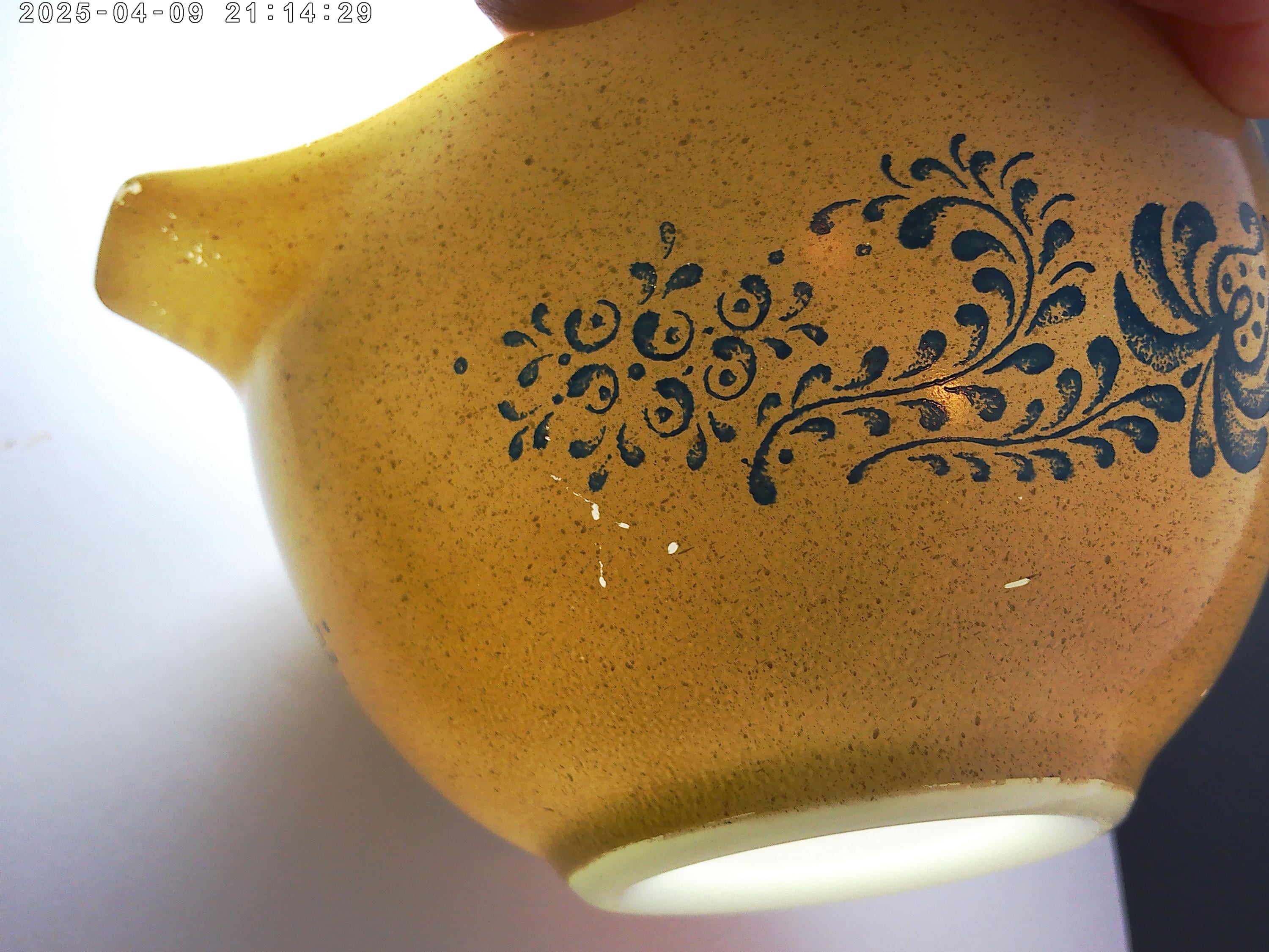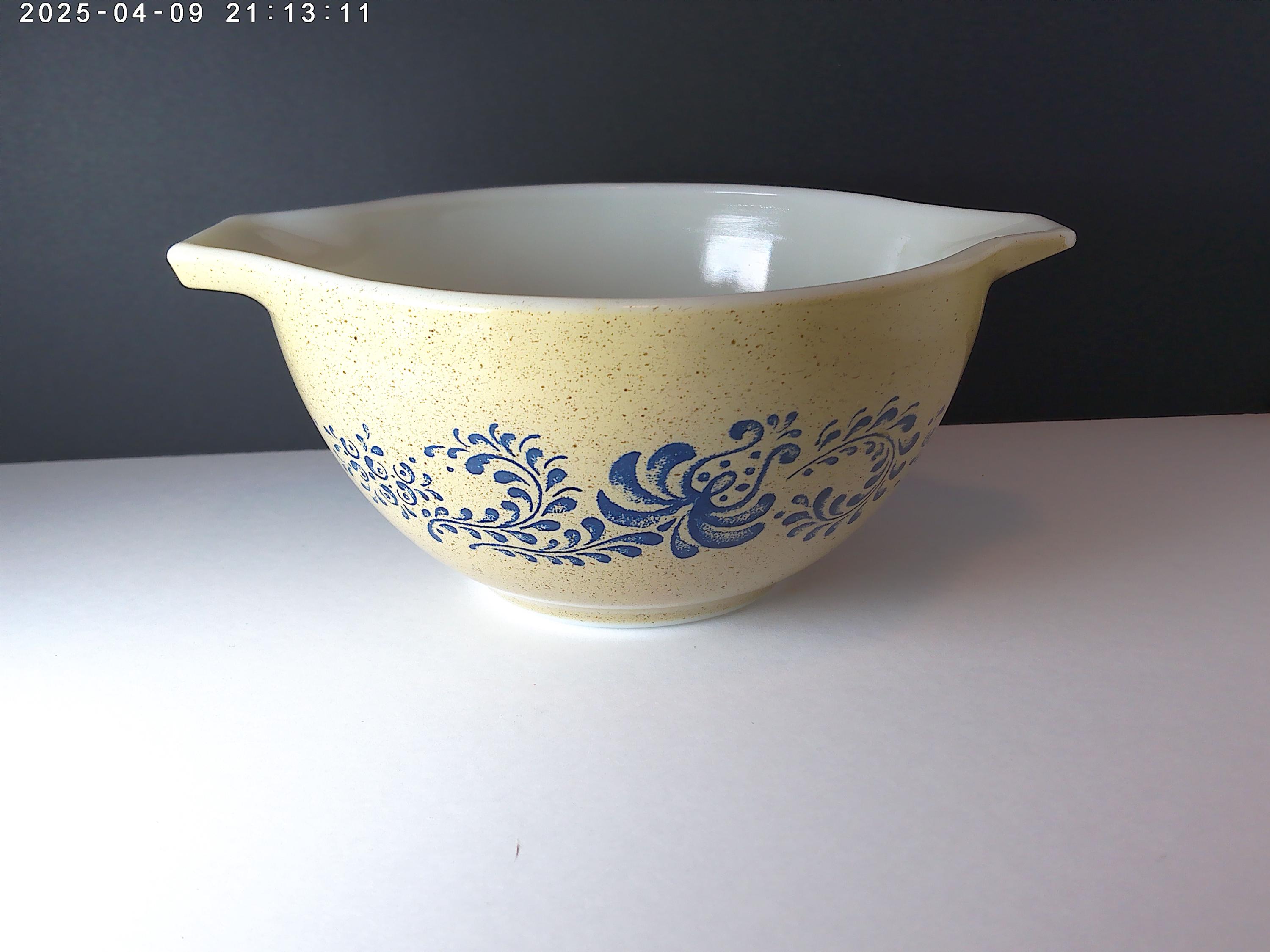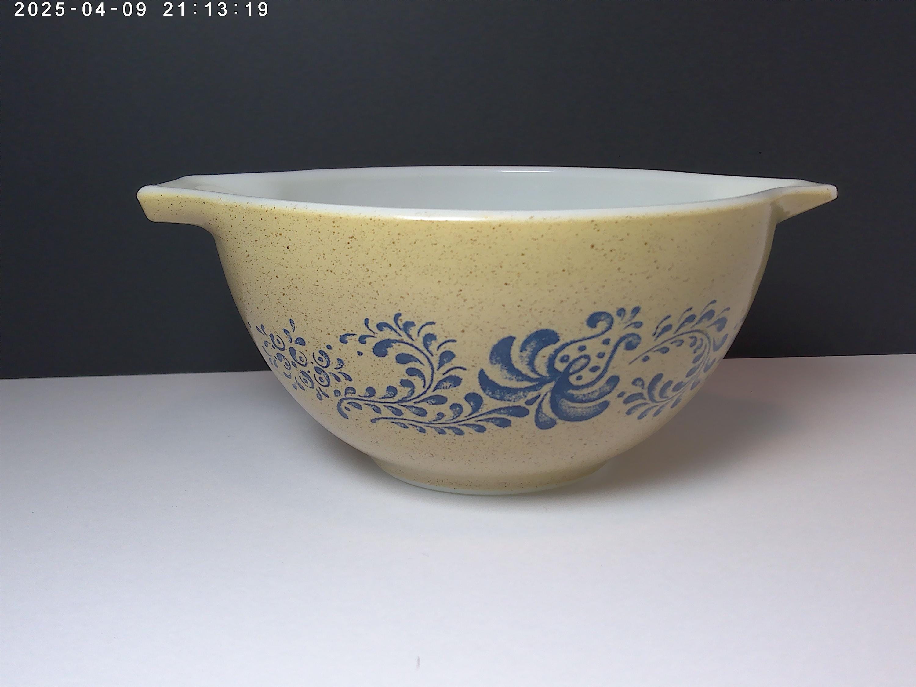 Vintage 70's PYREX 1.5QT bowl Homestead design 76-80 era speckled tan, blue flowers