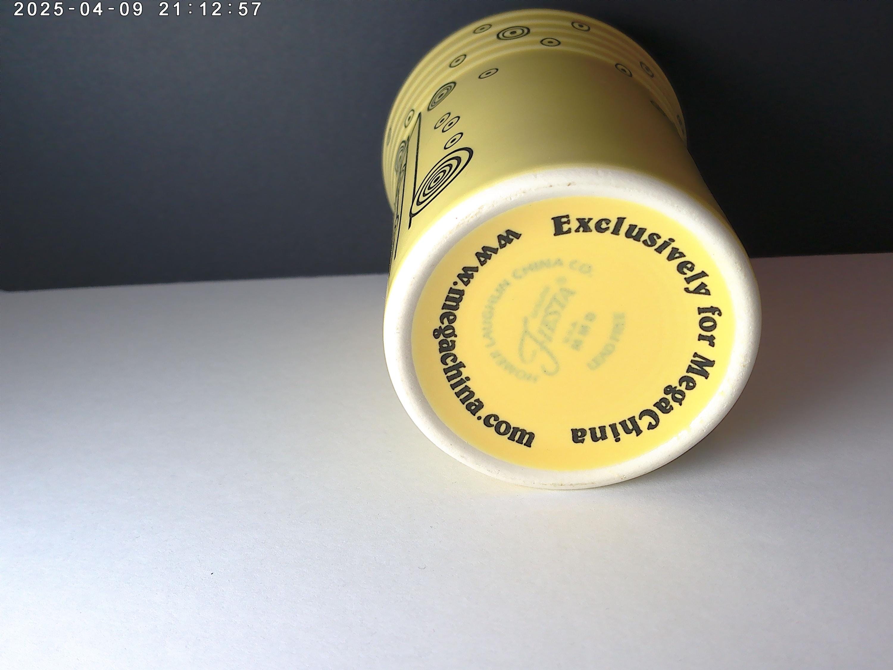 pale yellow painted mug with no handle or cup.