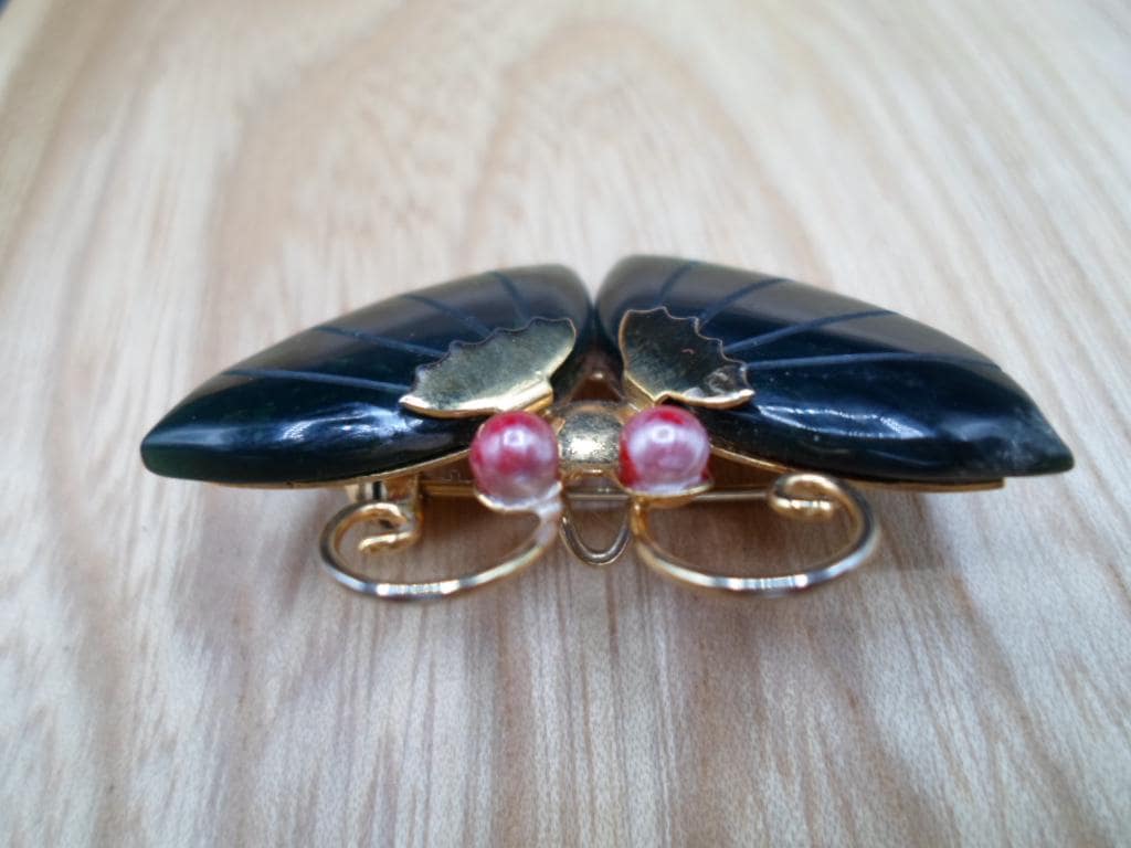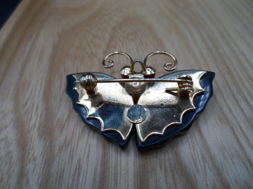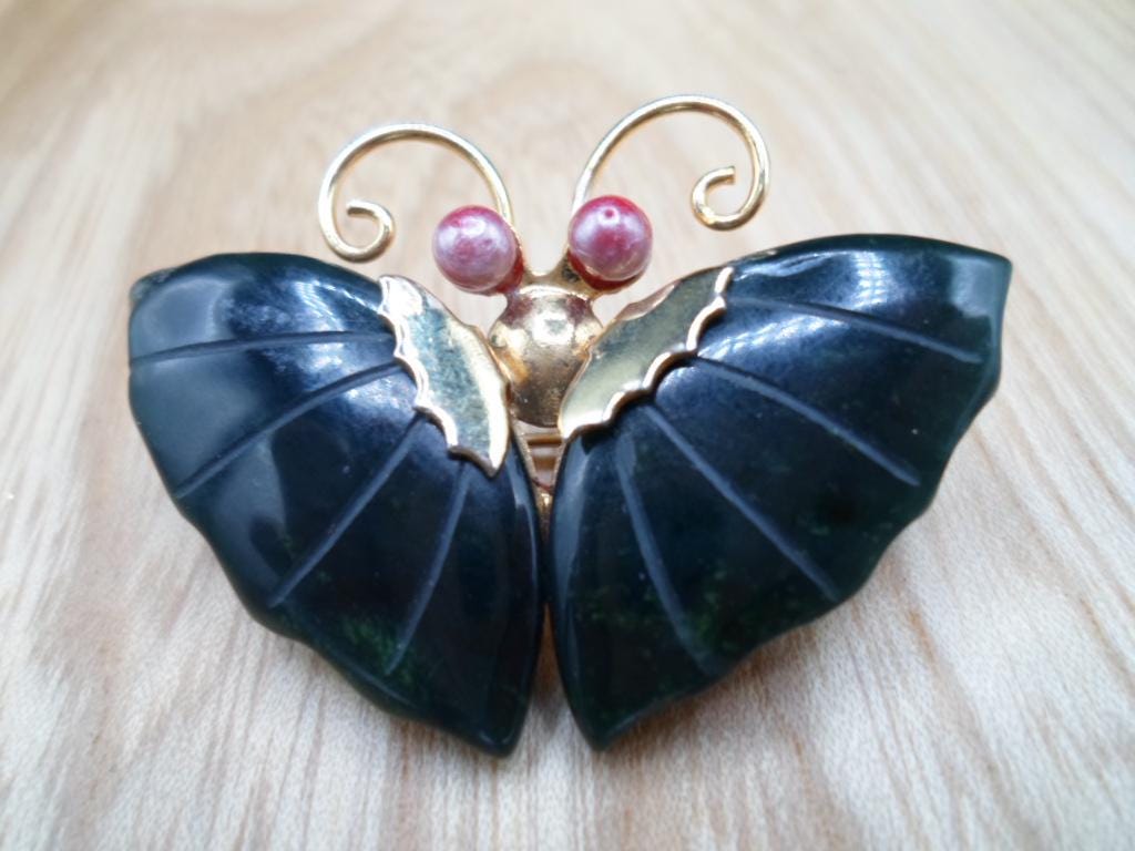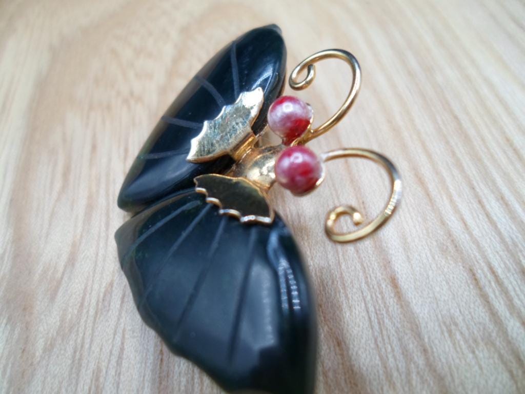 Vintage Black Nephrite Black Jade Butterfly Pendant Brooch Red Coral Eyes Gold Tone Body