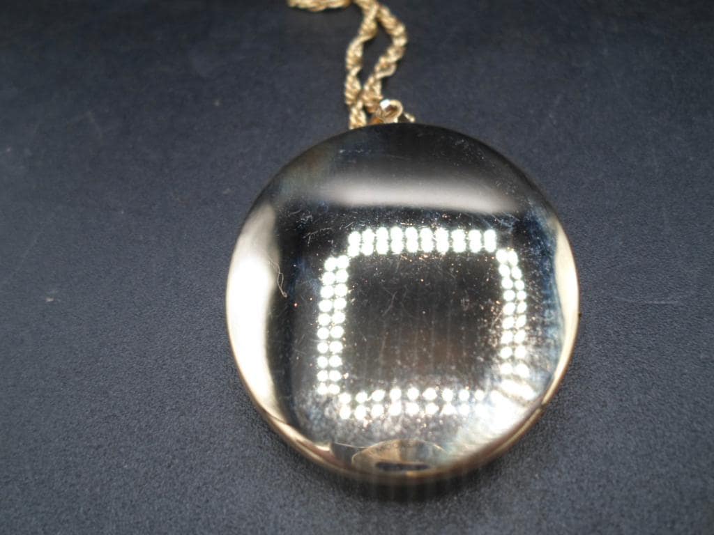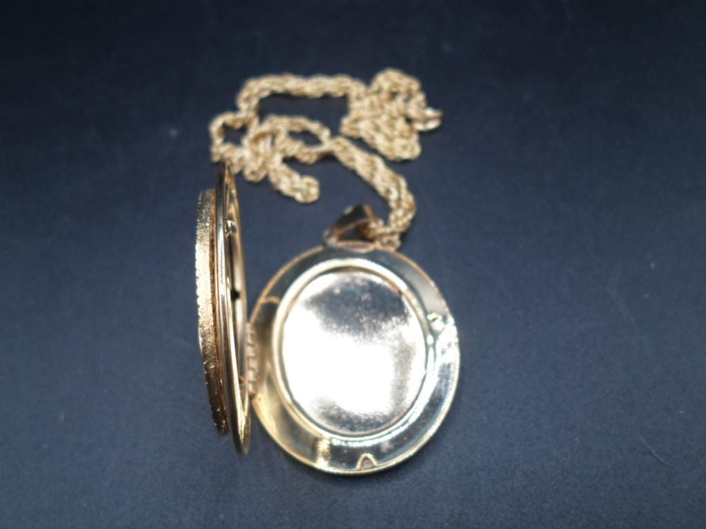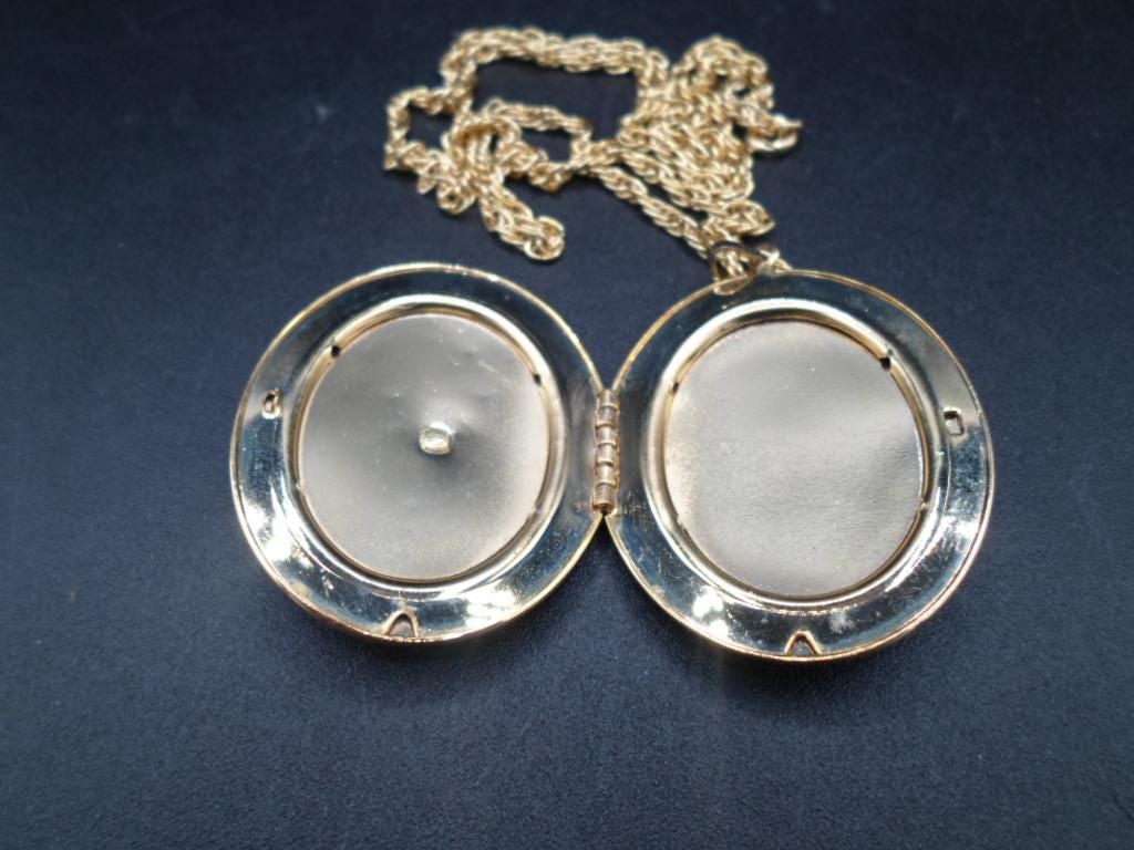 2" locket nice for photos 24"chain. Very good Vintage condition. Photo on back reflects lighting but all Very nice. Chain itself is as beautiful as the locket.