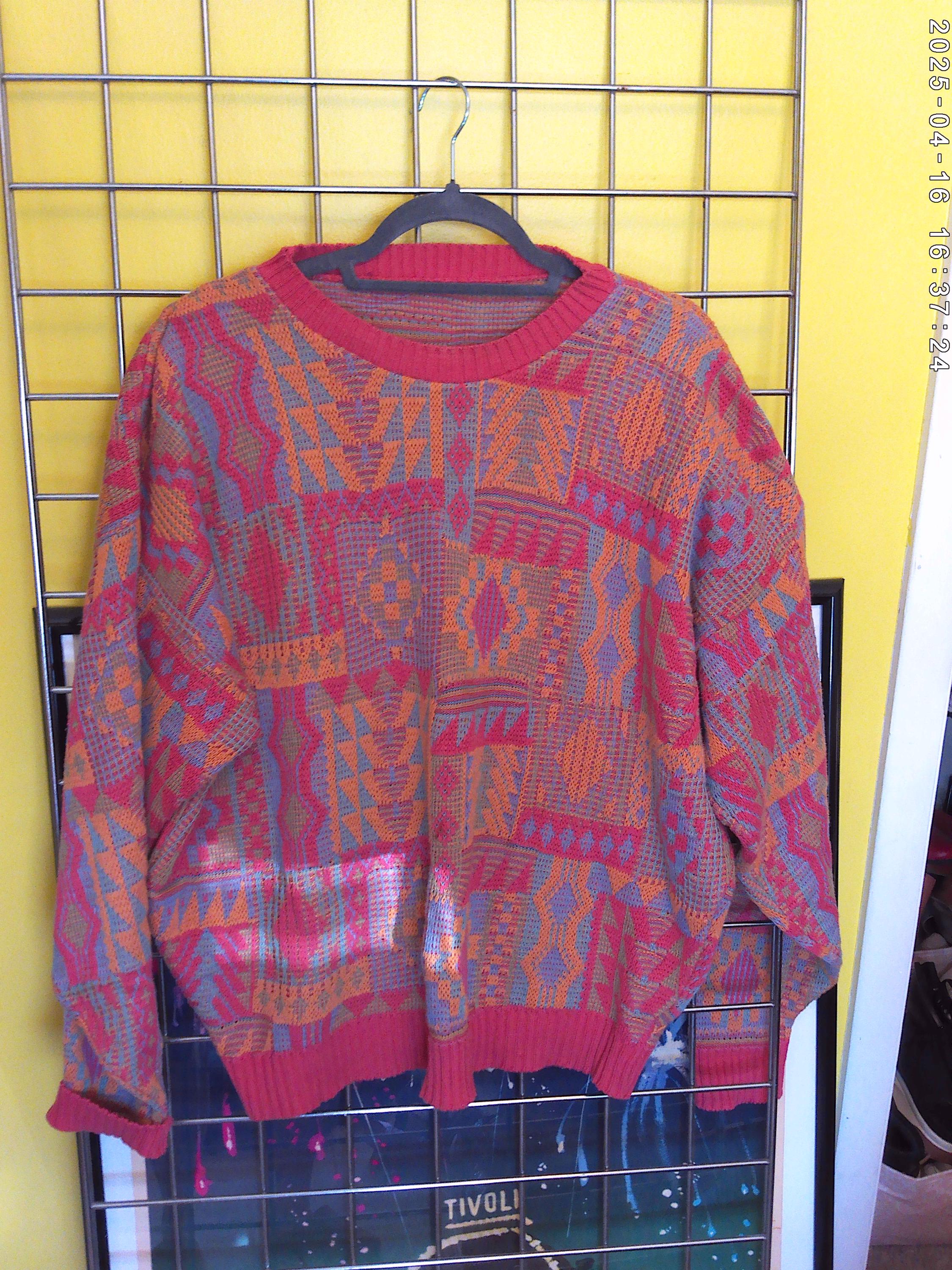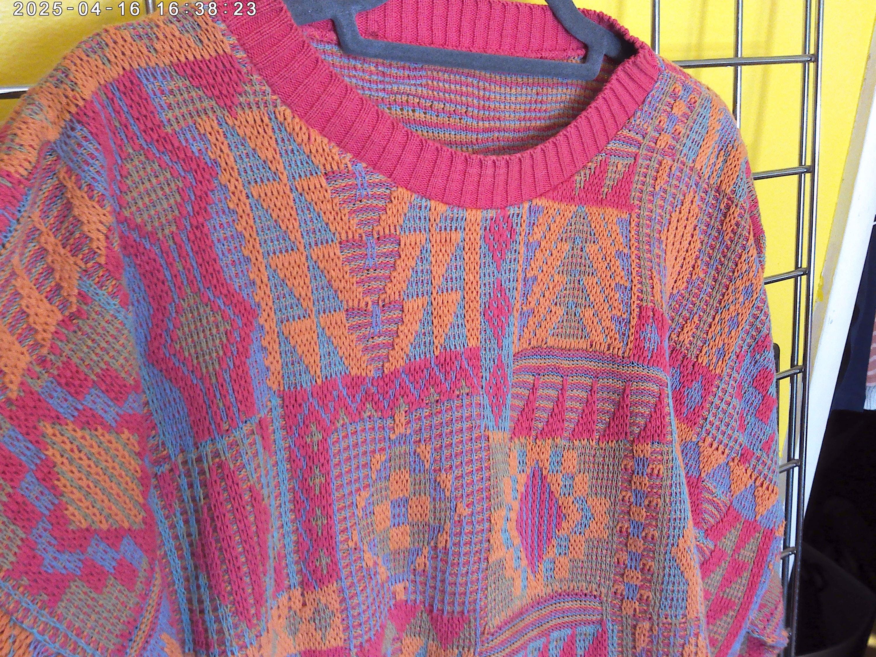 Vintage 80's Peter Jon cotton sweater lilac dusty peach melon golden yellow Aztec print 46 XL
