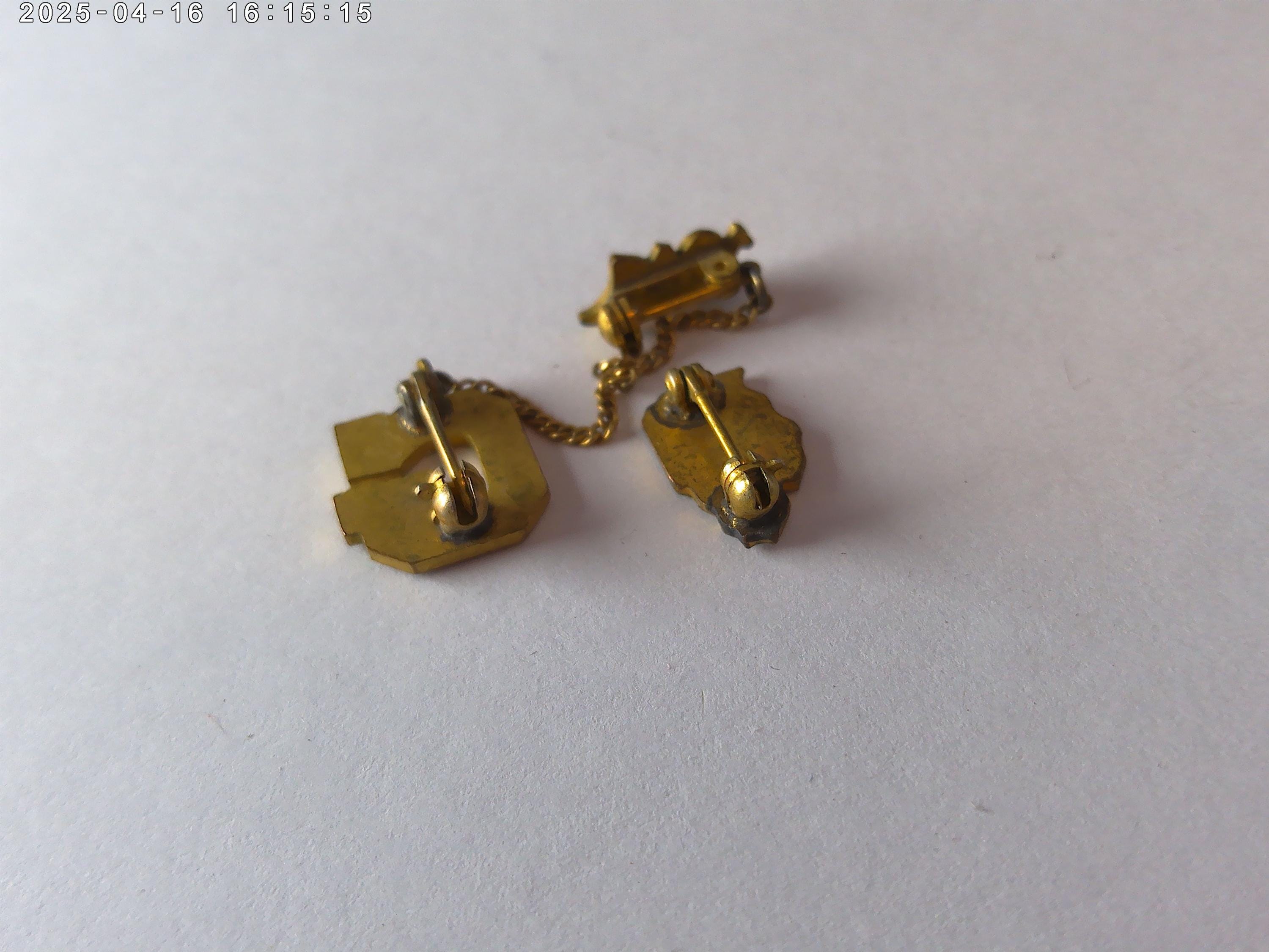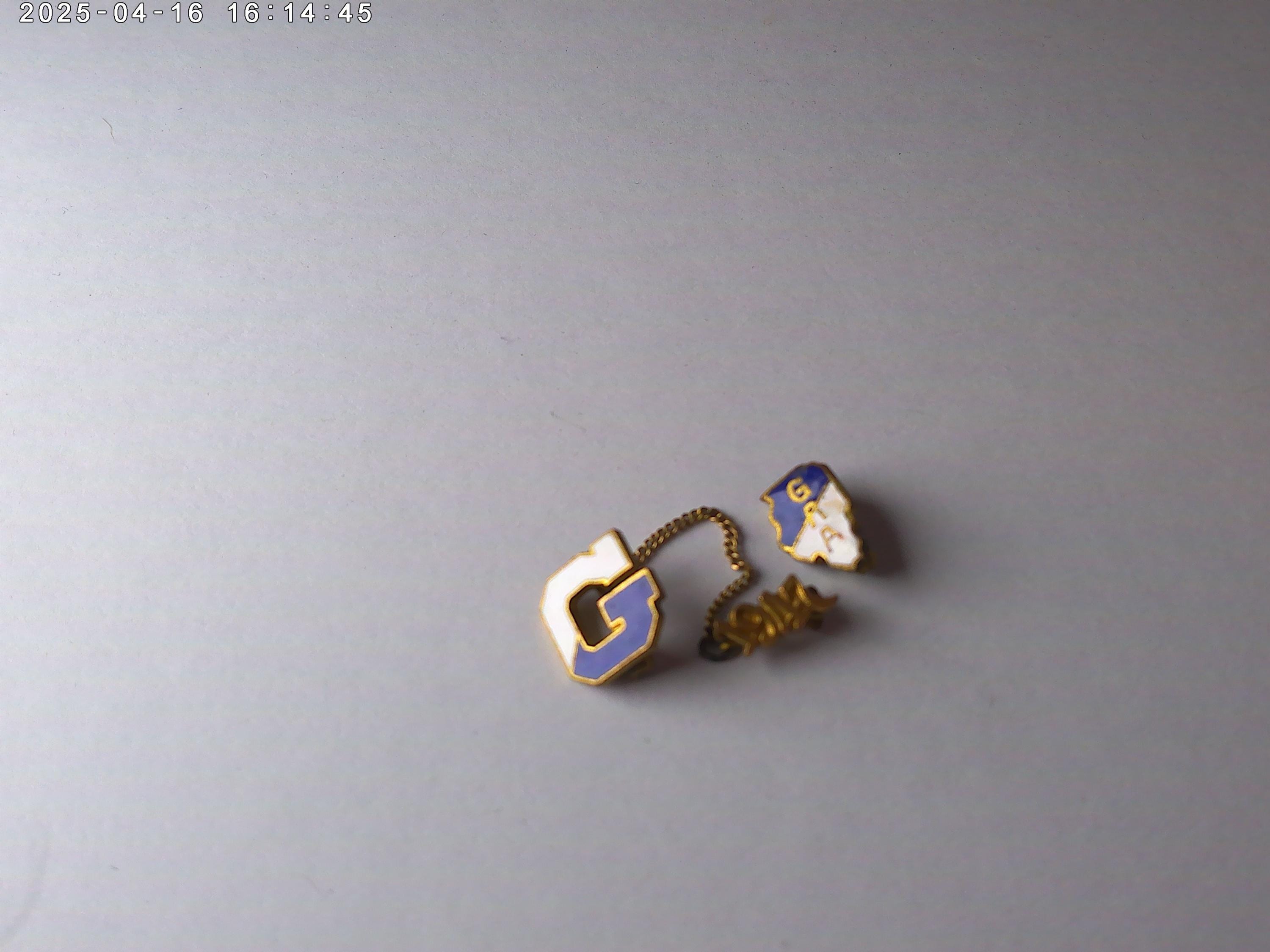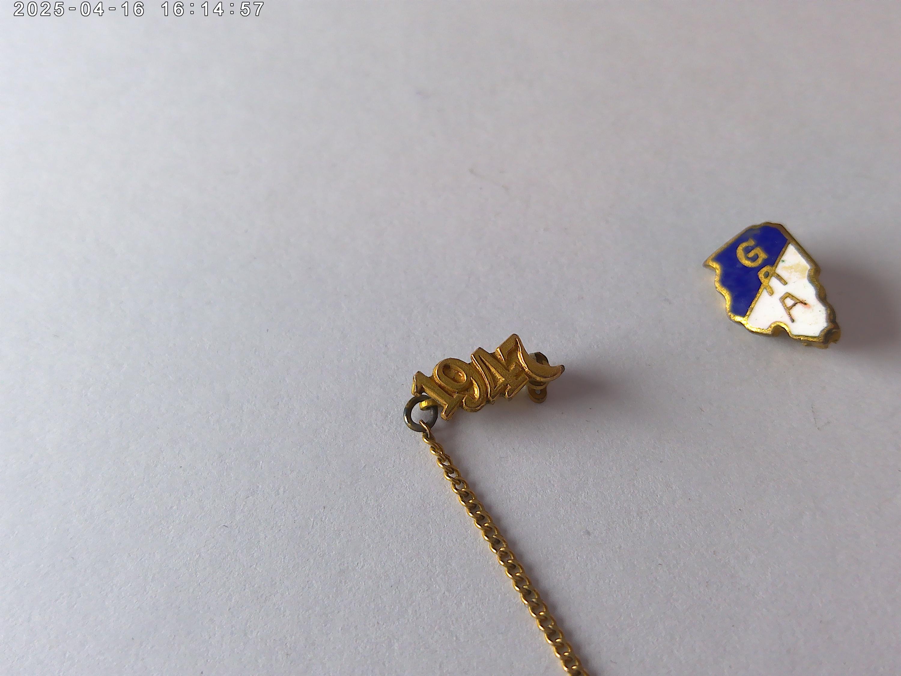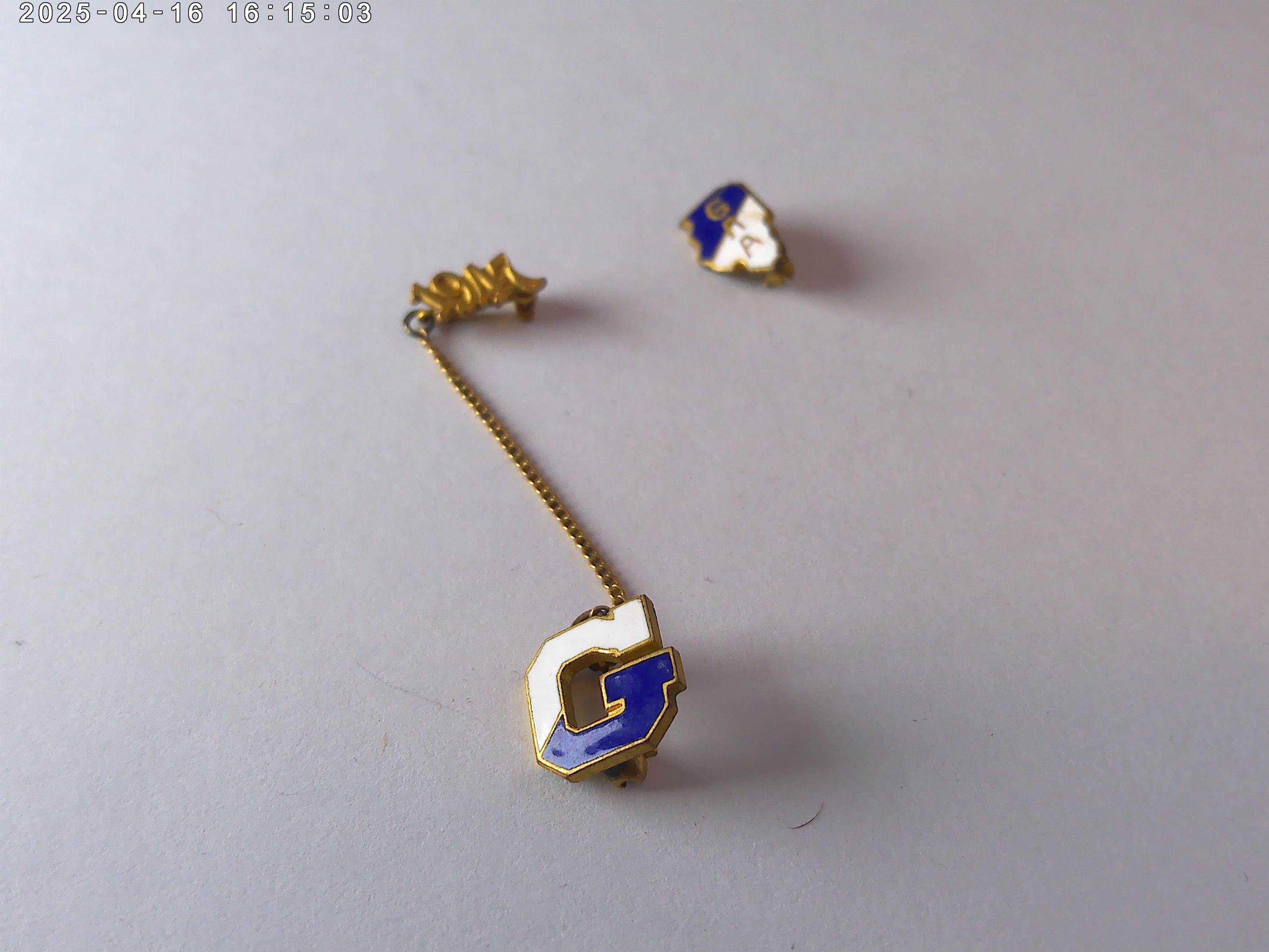 half inch letter G pin in blue and white (brass metal) with 1947 graduation date on chain, plus a half inch brass with blue and white Illinois shape GAA That's Illinois Girls Athletic Association from a Chicago School. Really cool items decorate your jean jacket, hat, or sweaters, just really cool find!