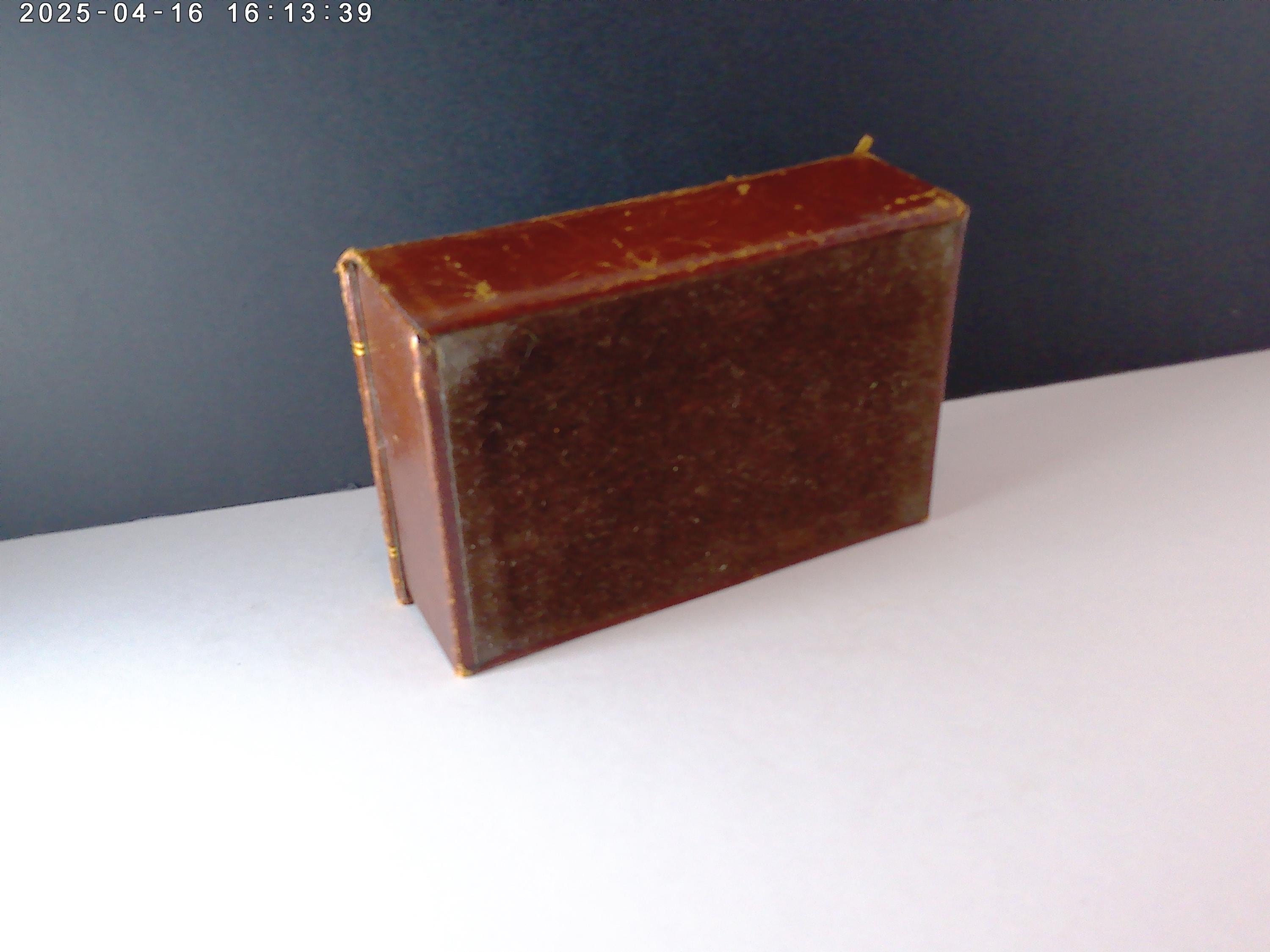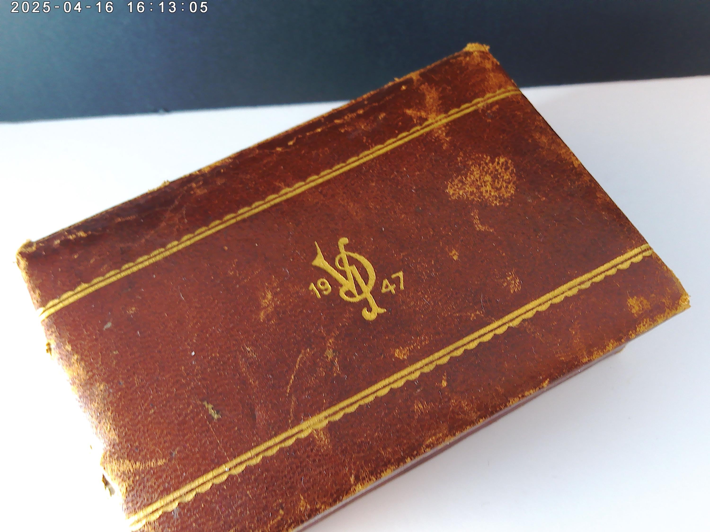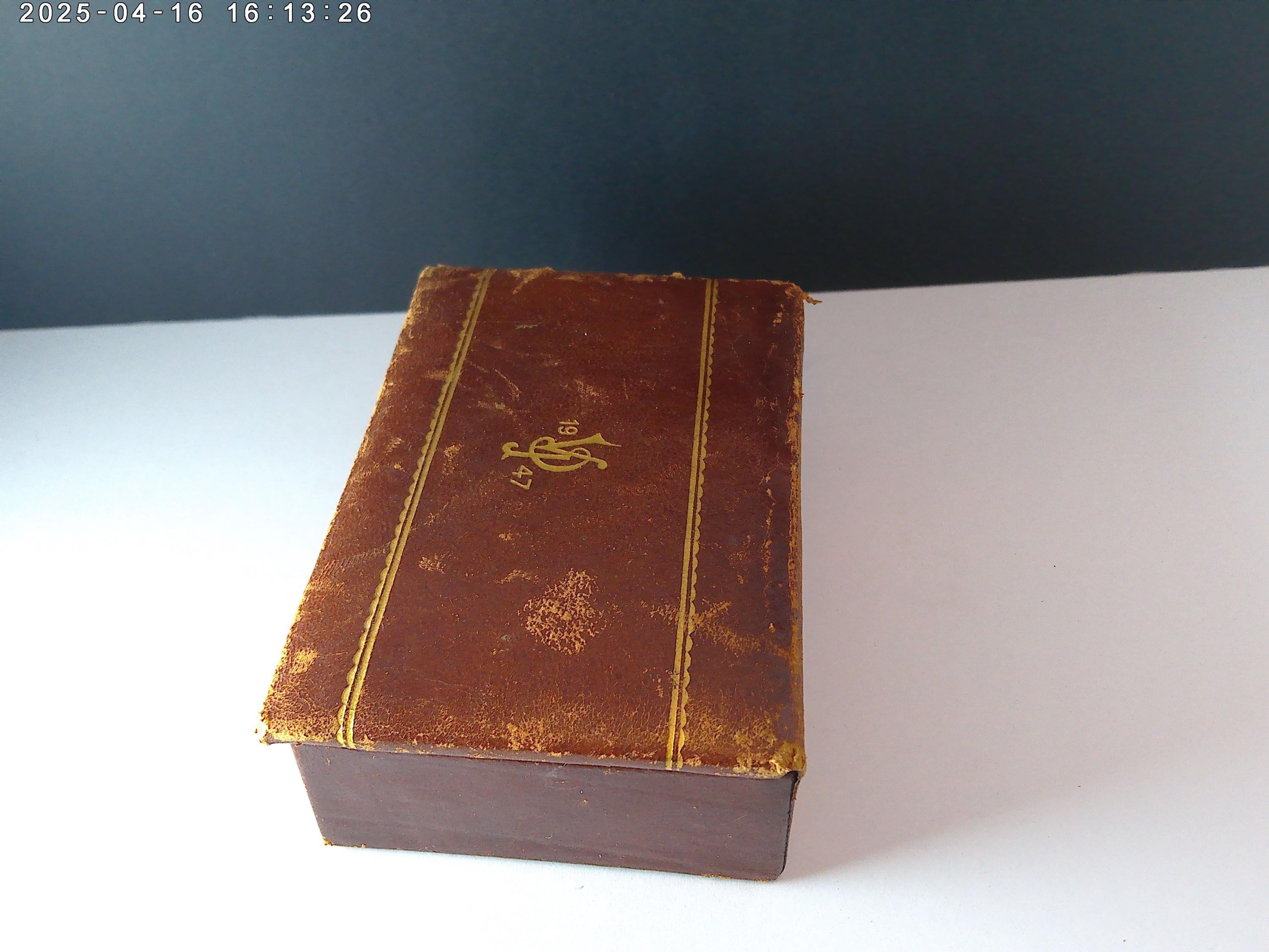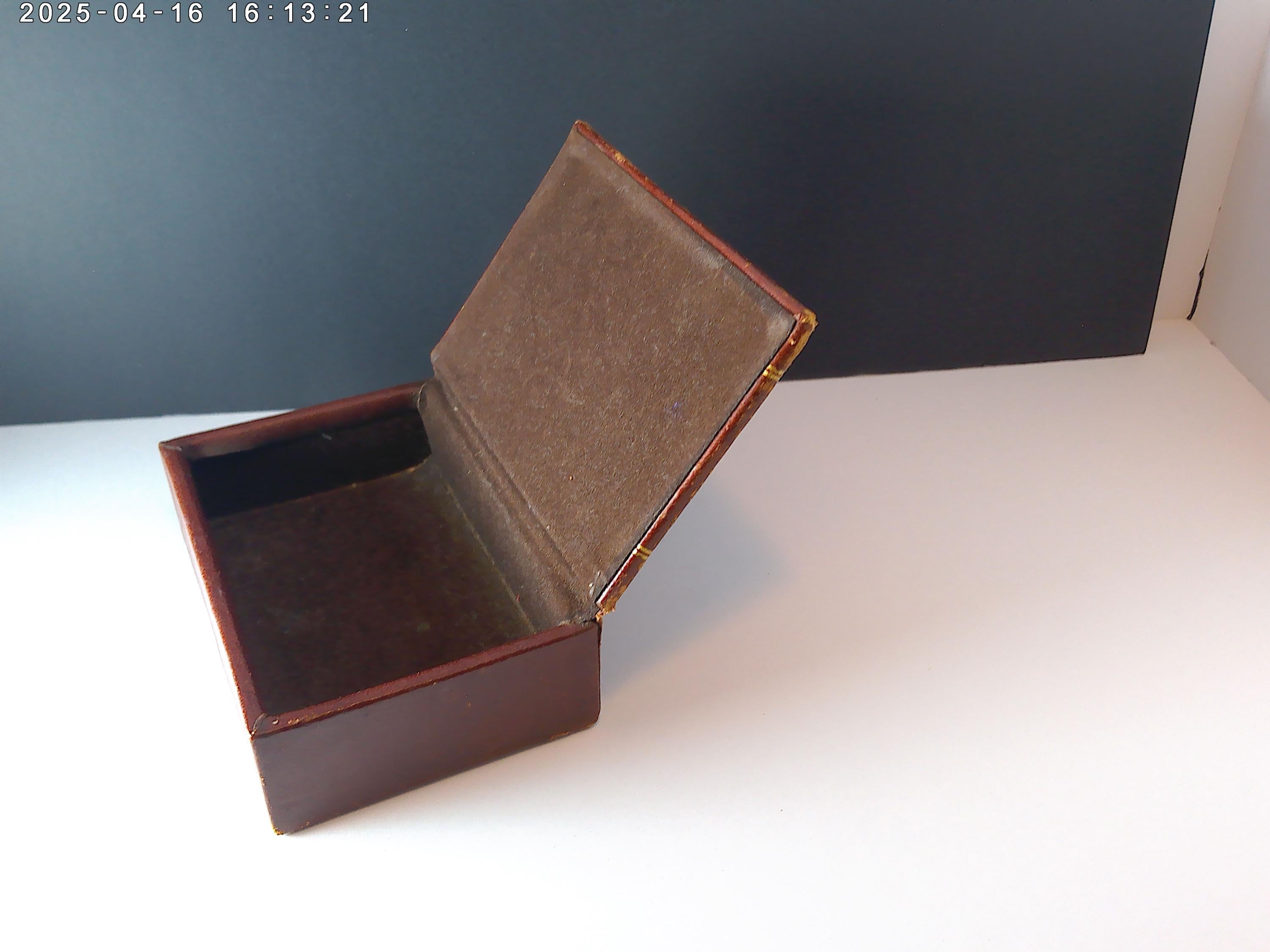 Antique leather box lined in brown velvet material, gold leaf details on the box like the date and letters VP, Leather is soft brown with scuffs and wear, see photos, looks nice with the character of age.