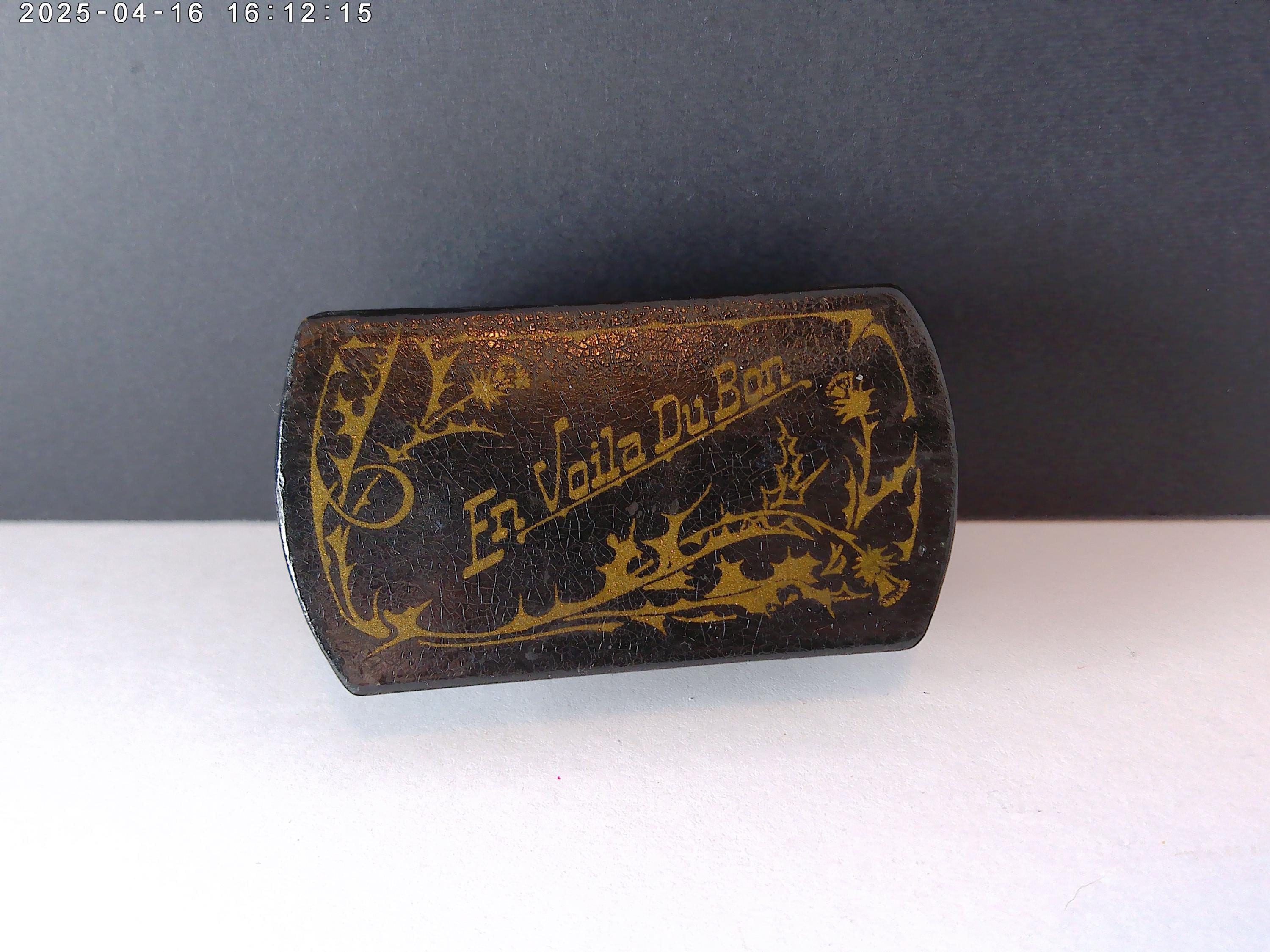 in gold lettering is says an old late 19th century French saying En Voila Du Box