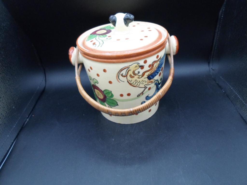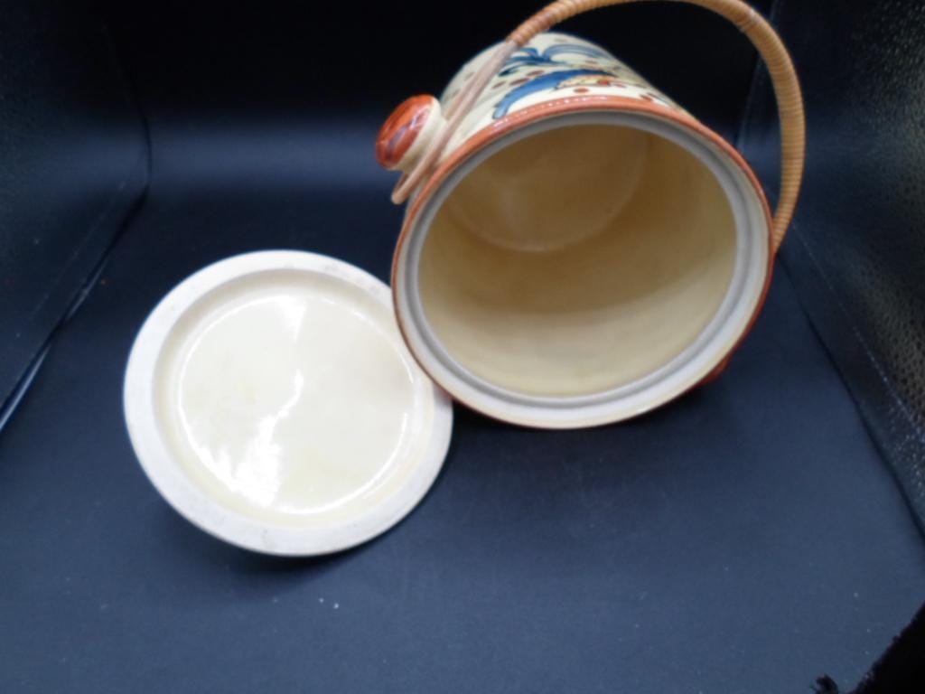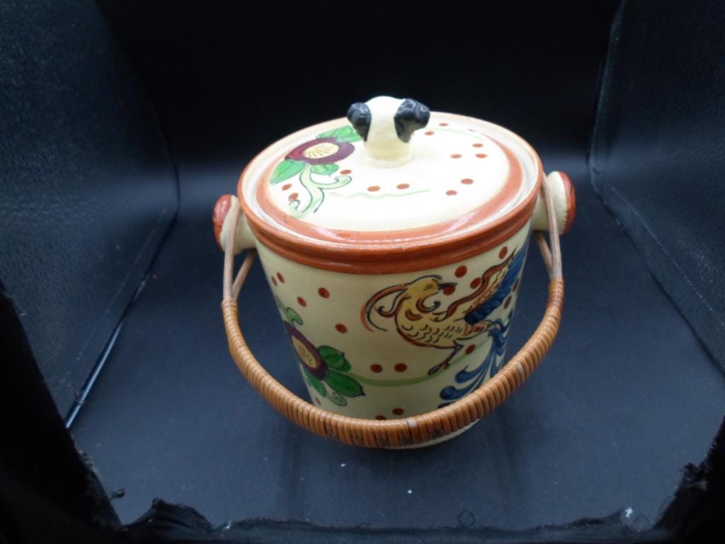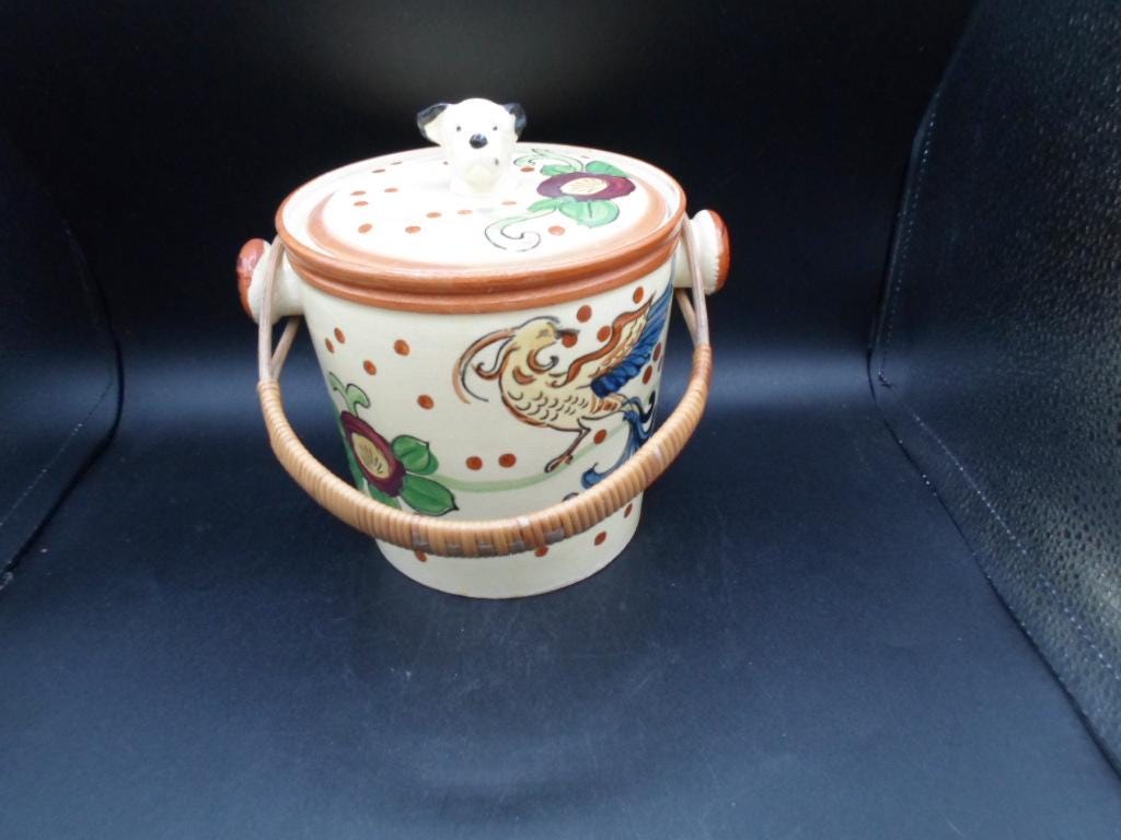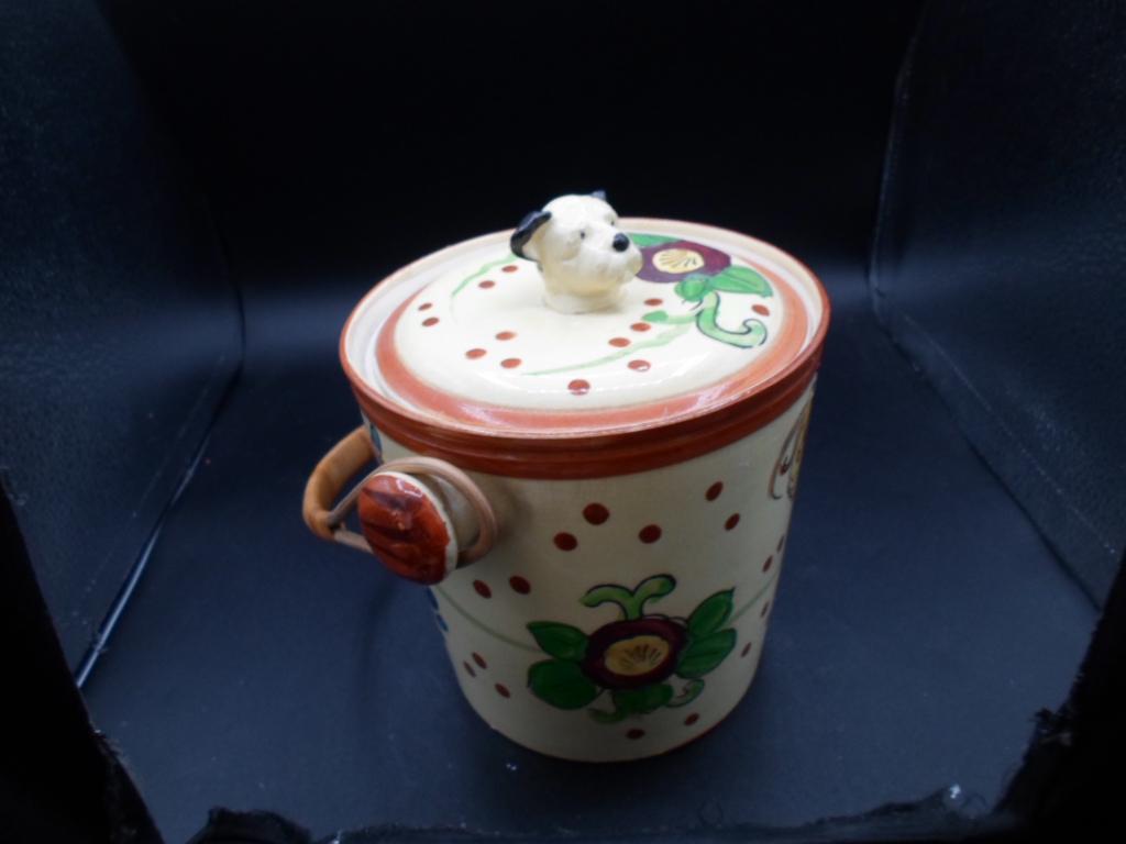 Art Deco Dog Head Biscuit Cookie Jar Hand Painted Willow Handle 1930's Japan Excellent