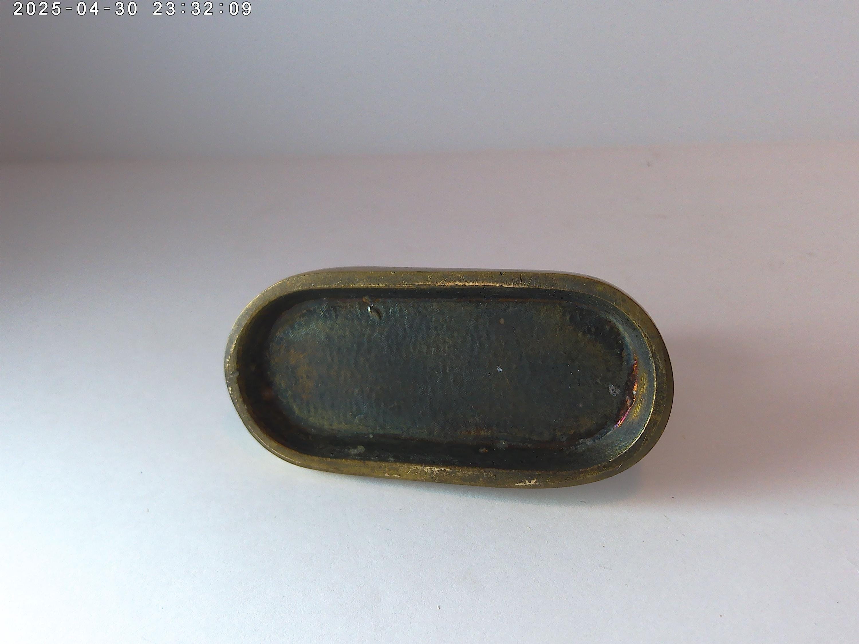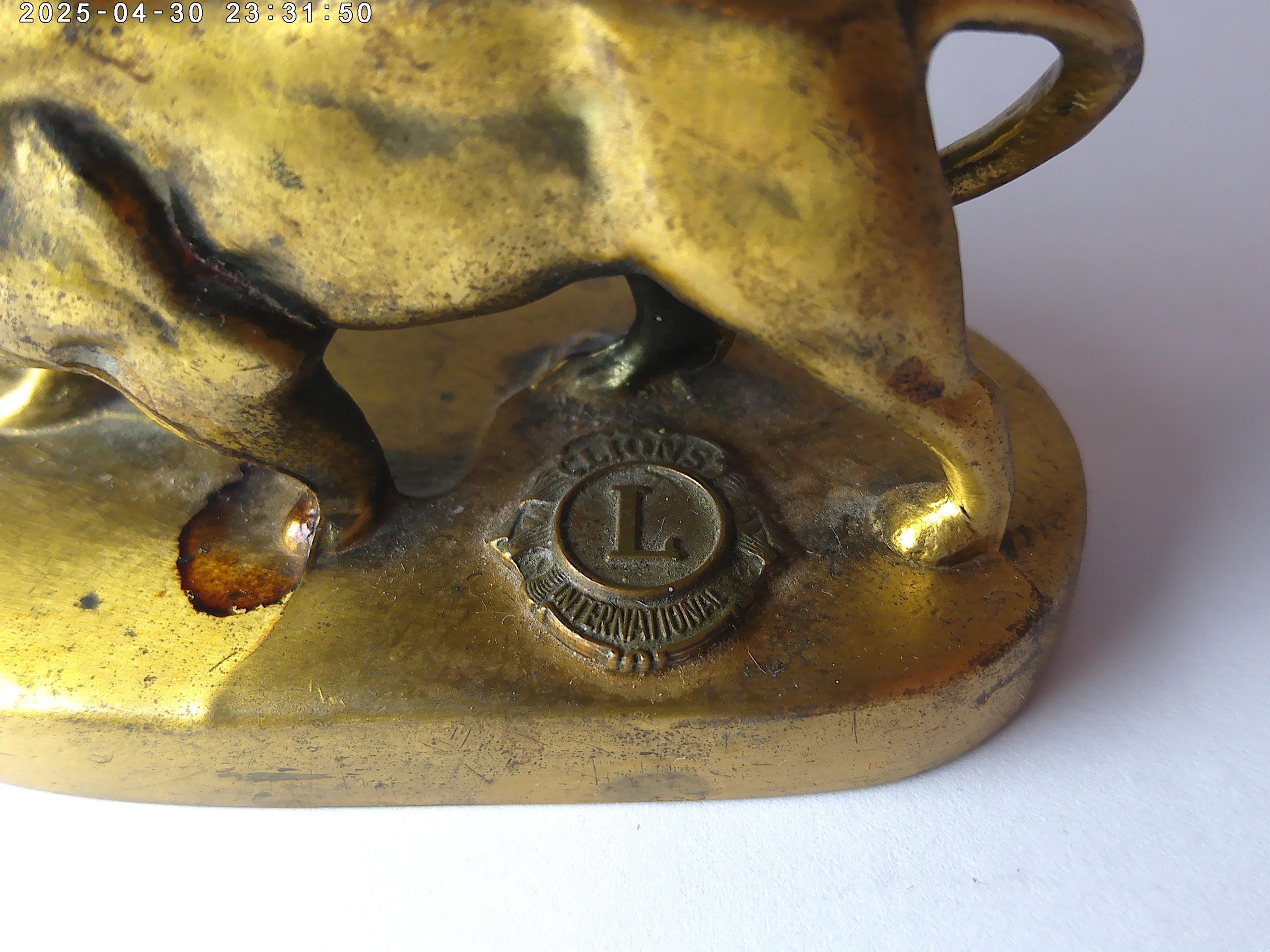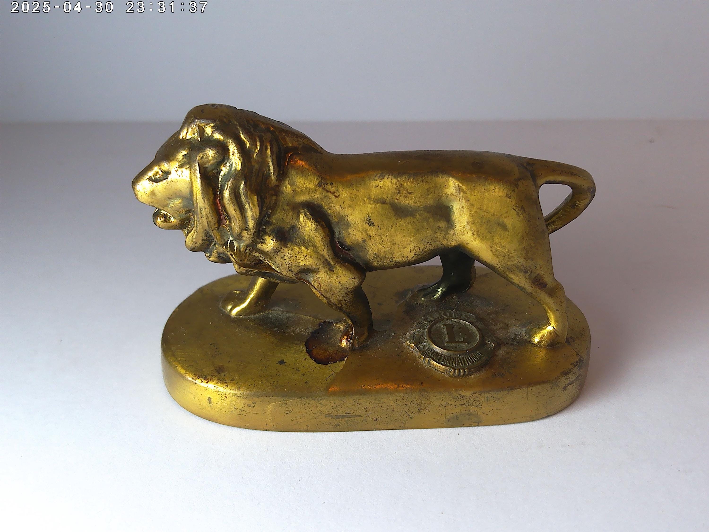2" by 3" long brass metal lion on platform with lion's club badge
