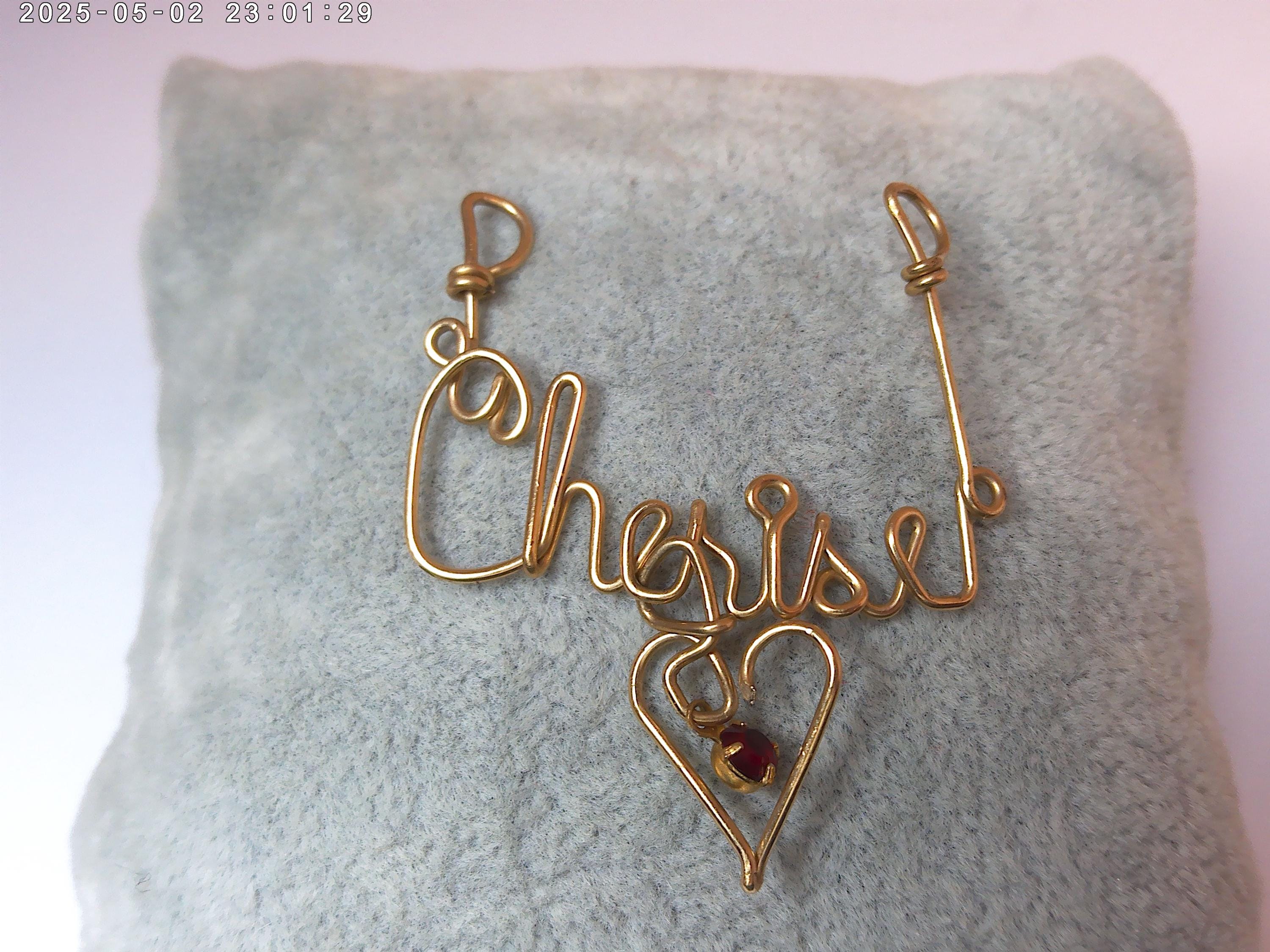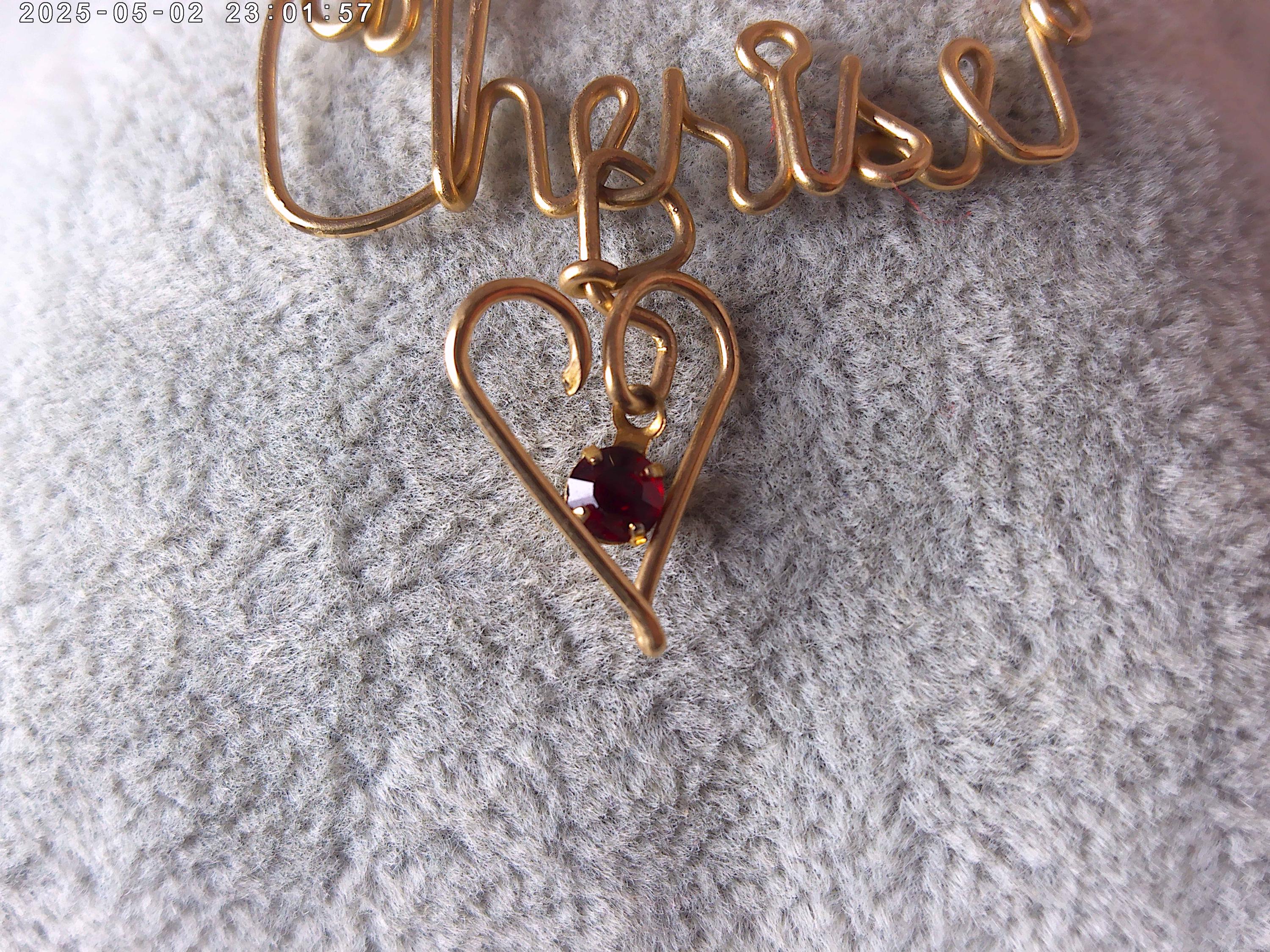 Gold tone wire Cherise with dangle heart and red stone drop