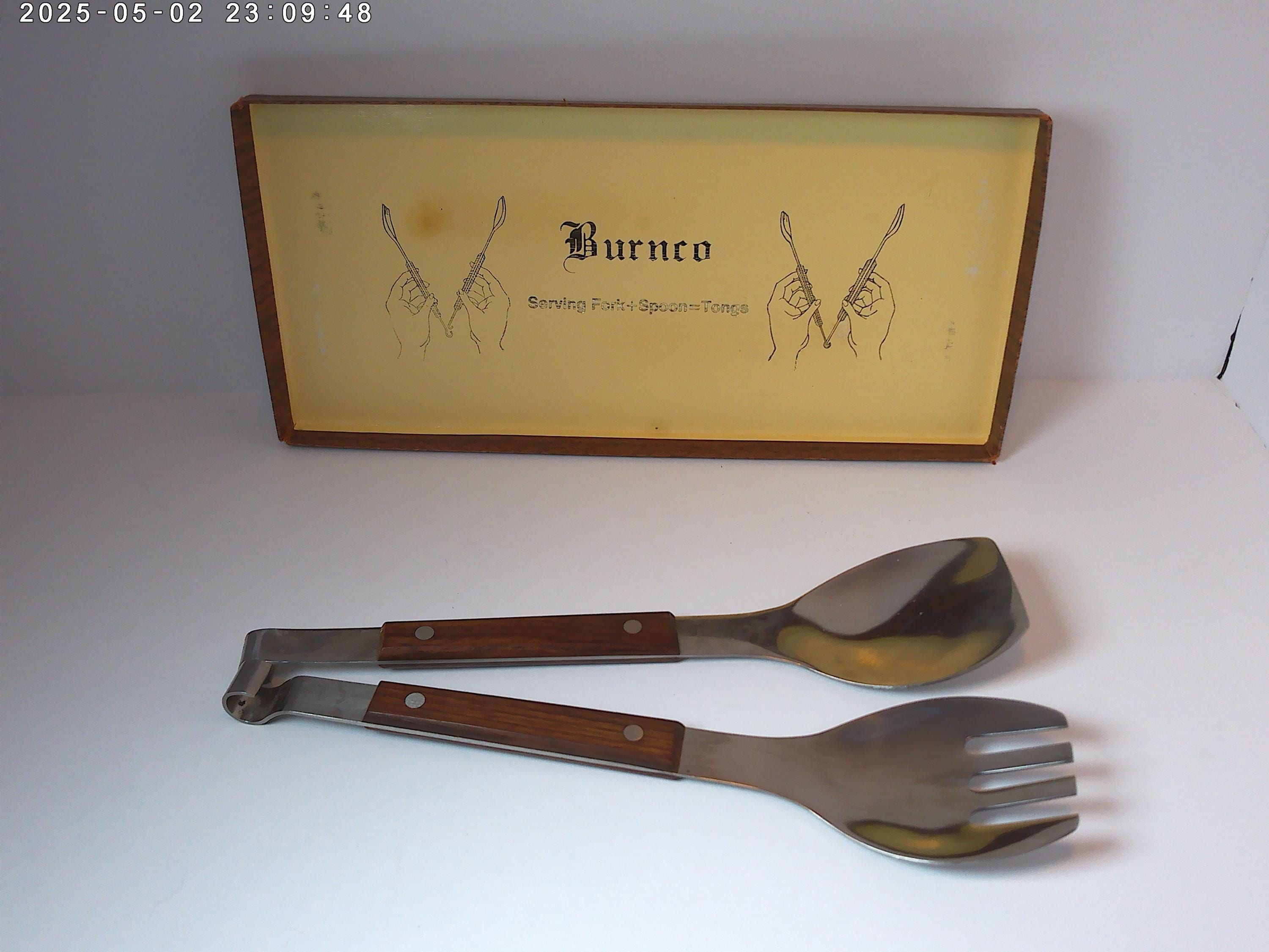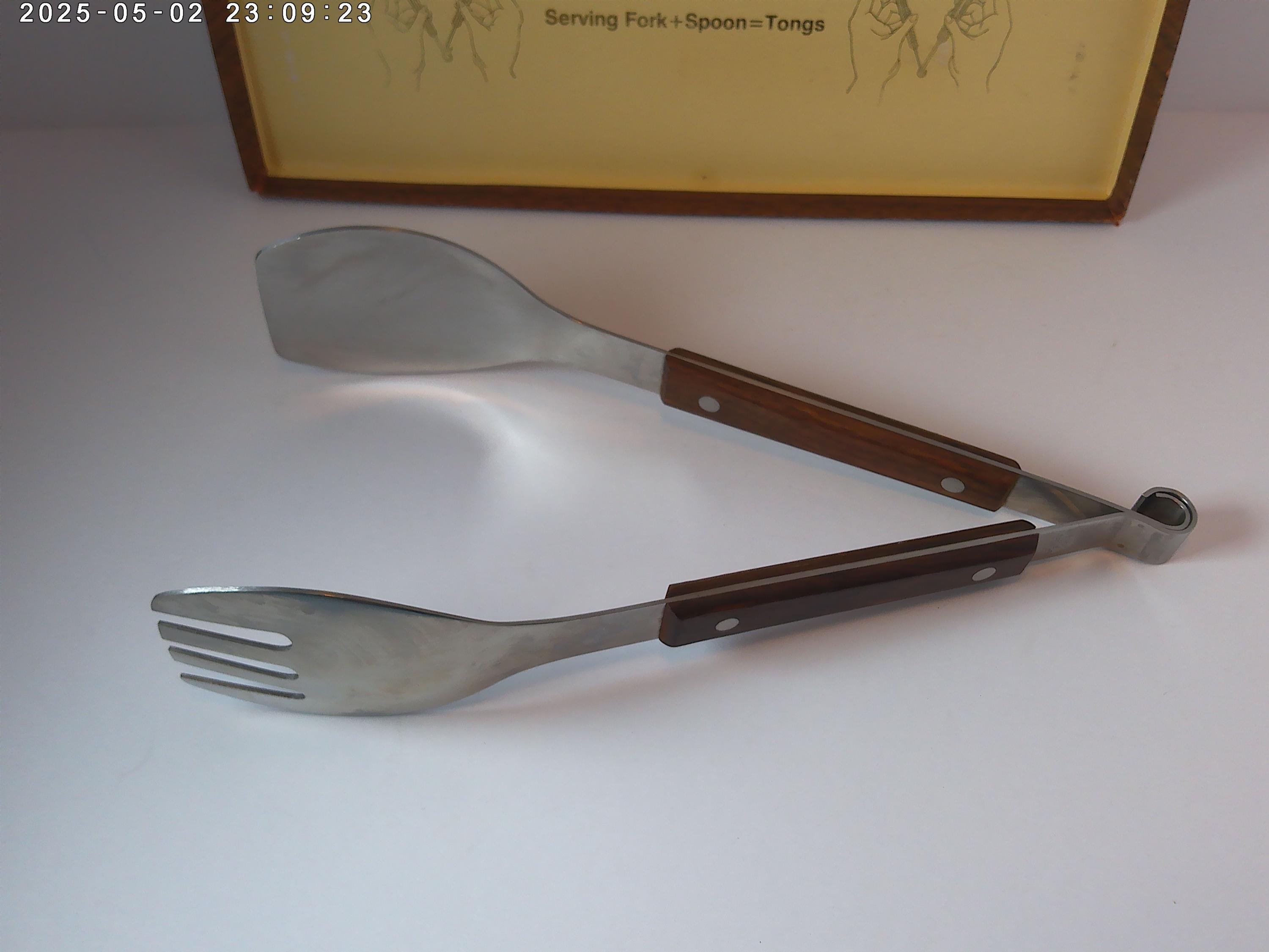 Vintage 60's-70's Mid-Century Modern serving tongs stainless and wood Never used with box