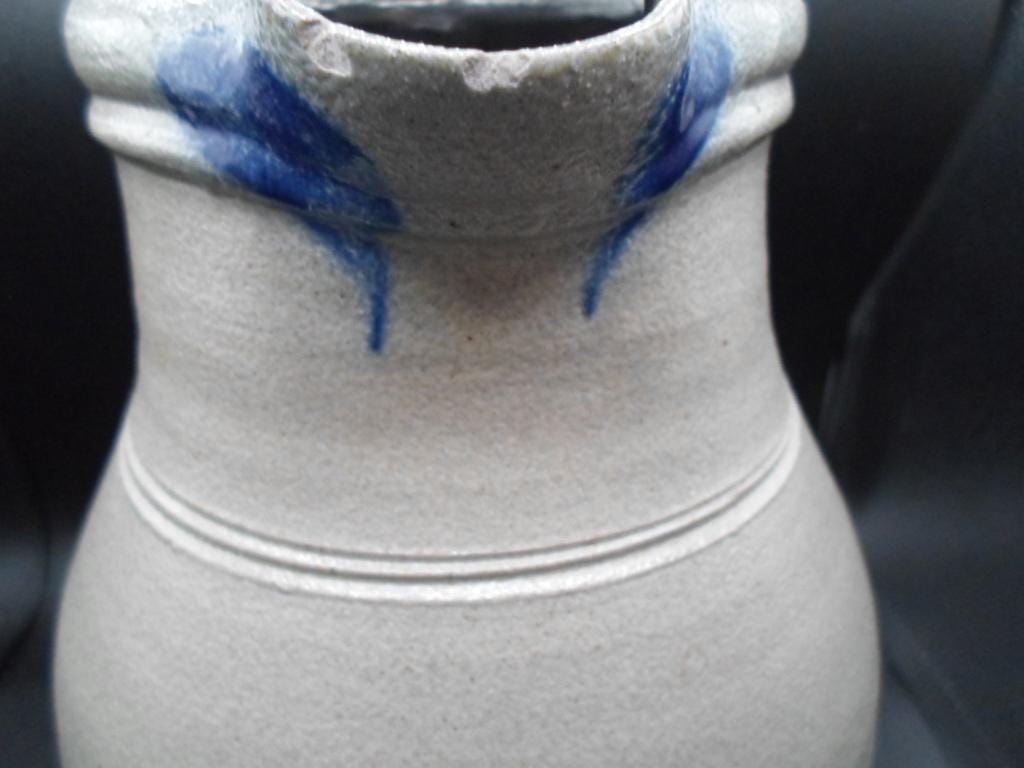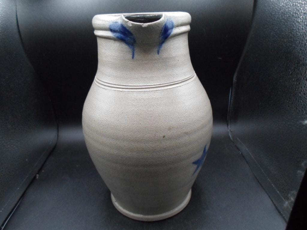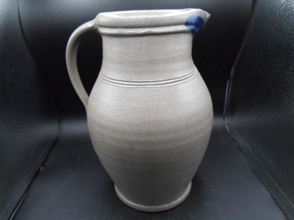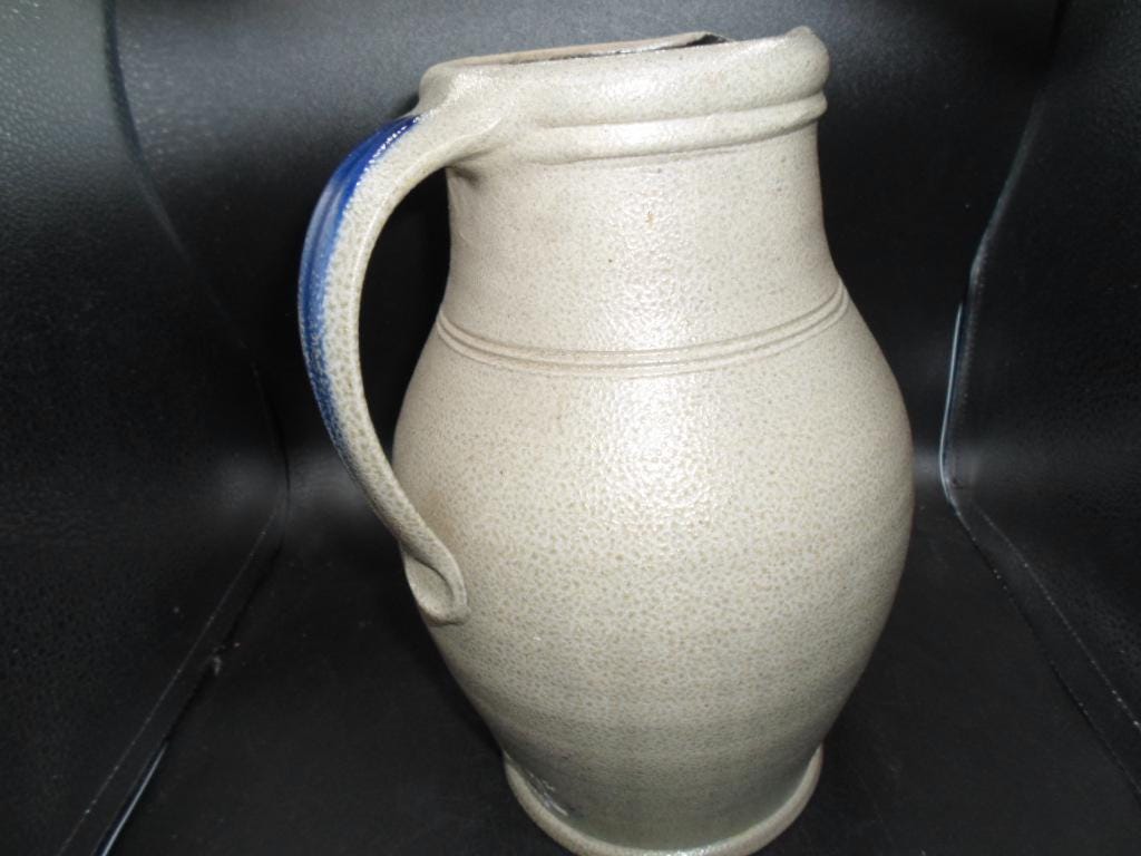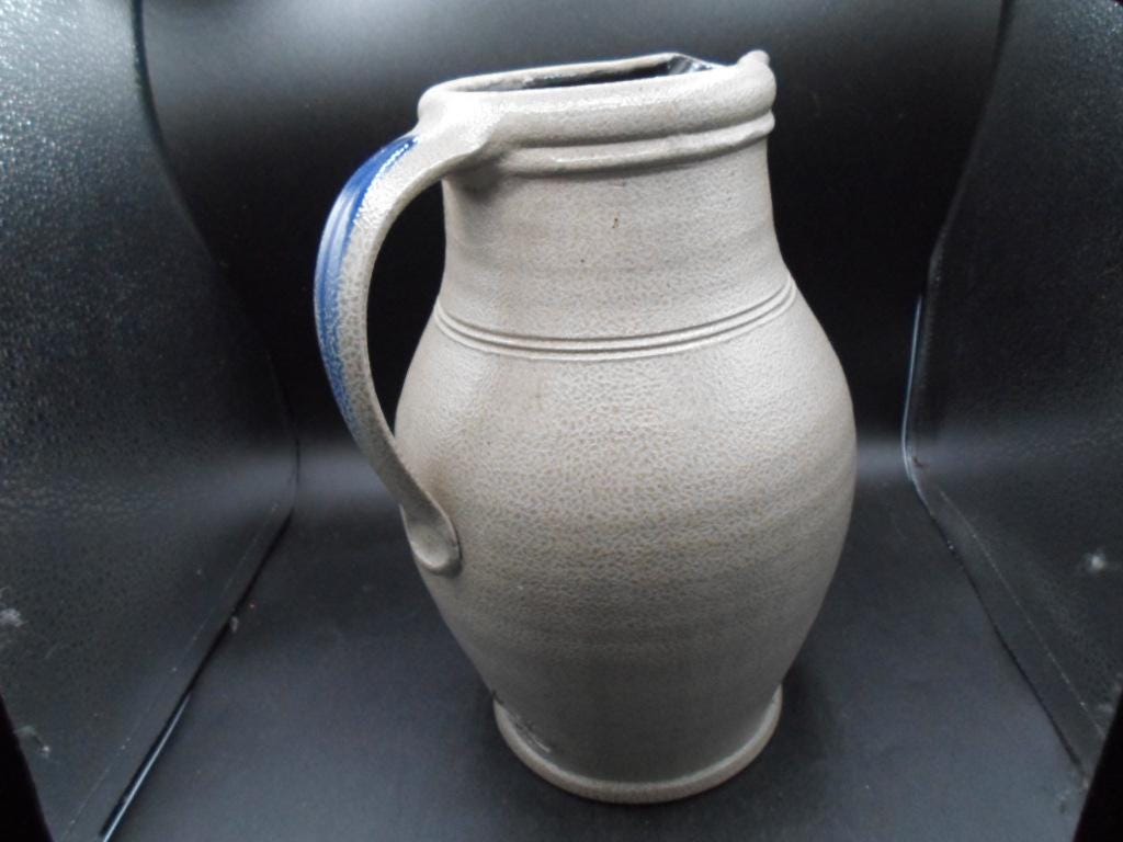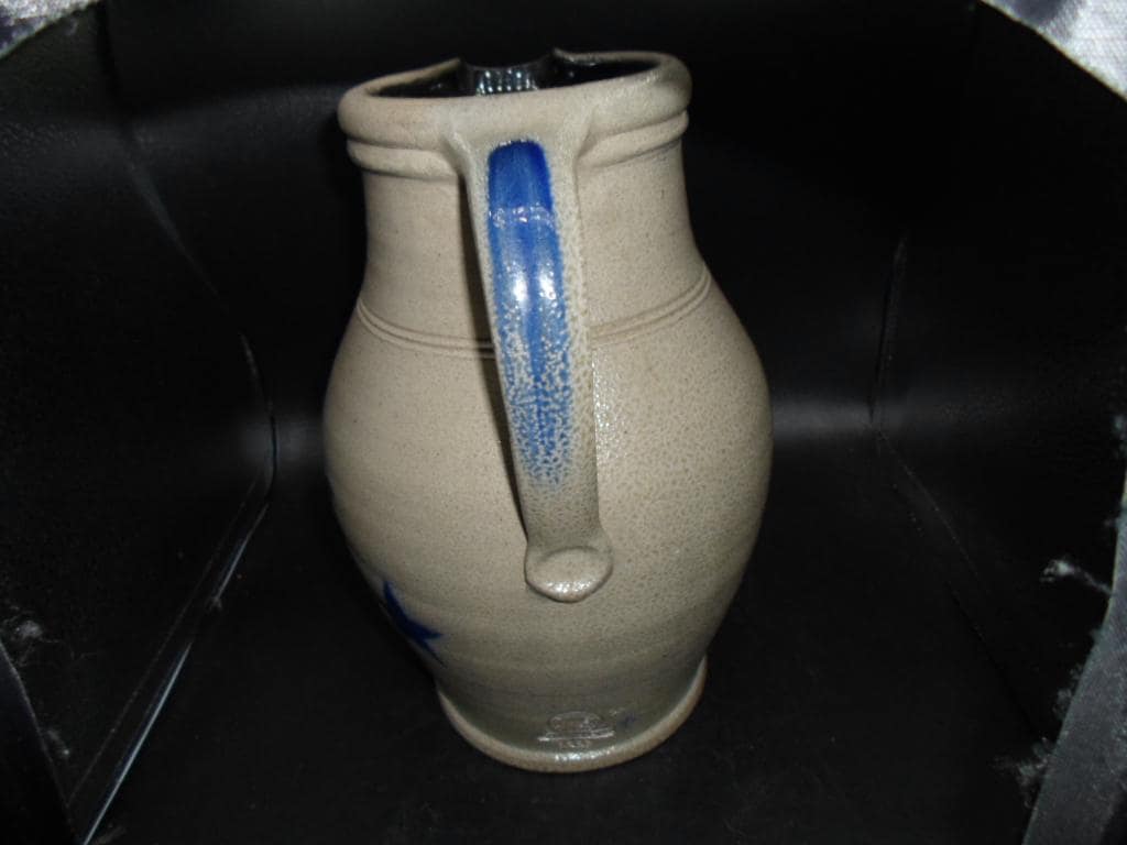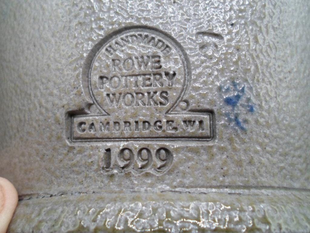 10"tall 7"wide at widest point Salt glazed Stoneware Pitcher. Rowe Pottery Works is a historic family owned pottery studio in Cambridge Wisconsin known for its handcrafted salt glazed stoneware and Ironware with traditional American designs. Marked with company stamp and artist mark. 1999. Couple small chips on spout note photo. Good Vintage condition.