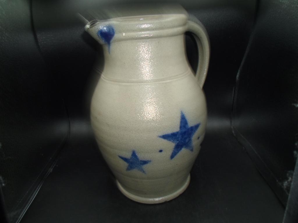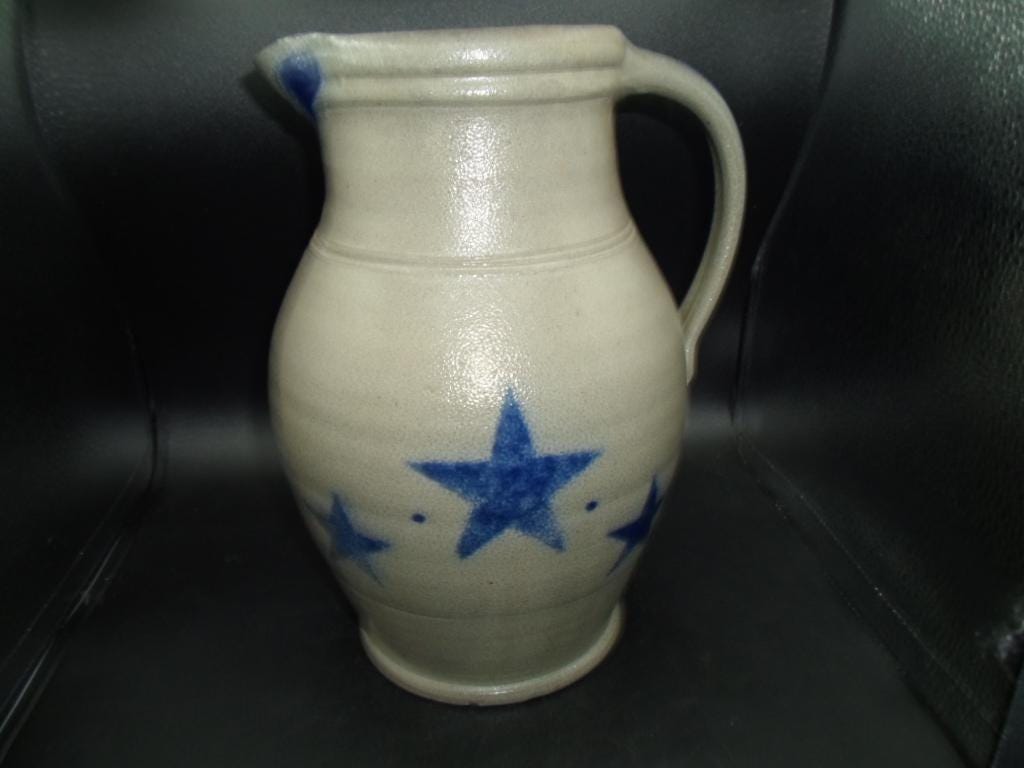 Rowe Pottery Works Stoneware Large Pitcher Star Pattern Salt Glazed 10" Signed obscure chips