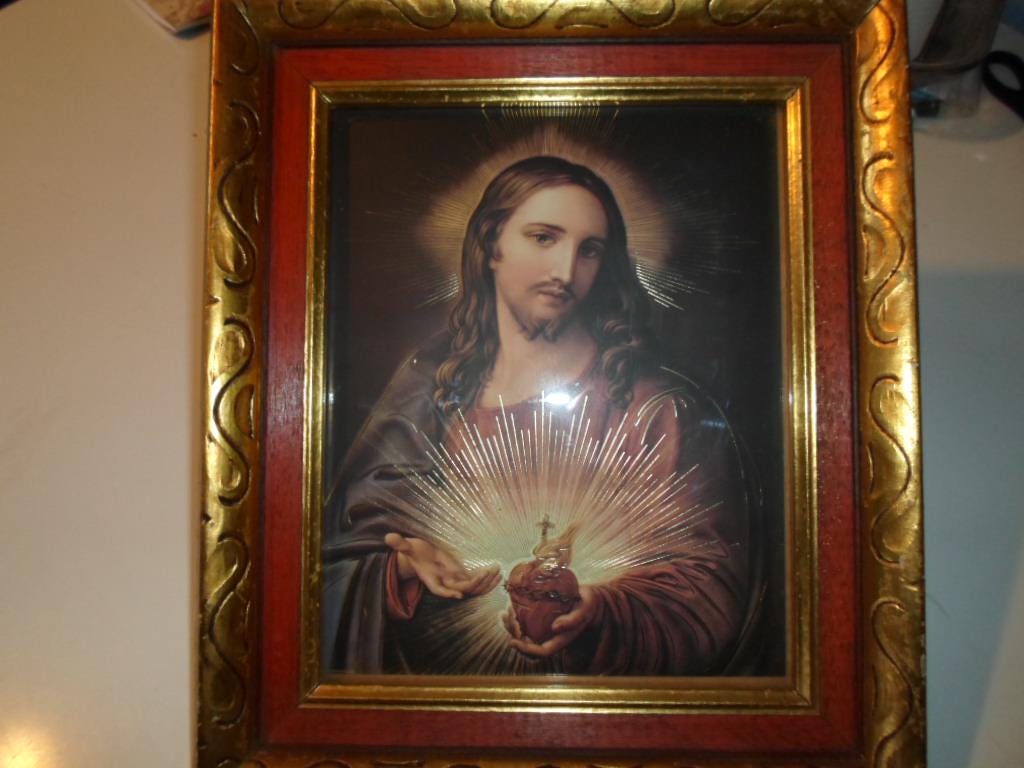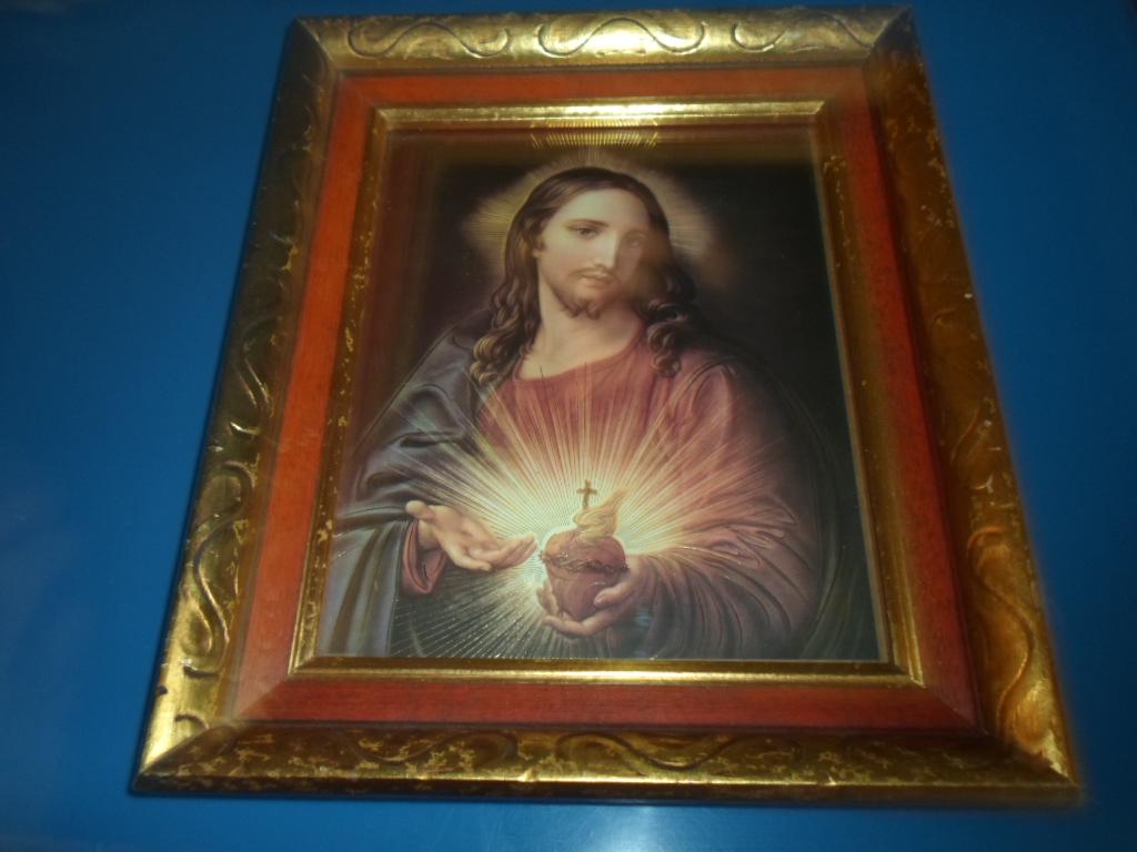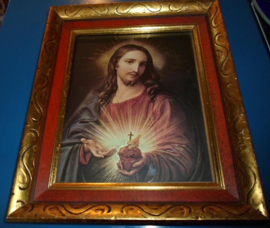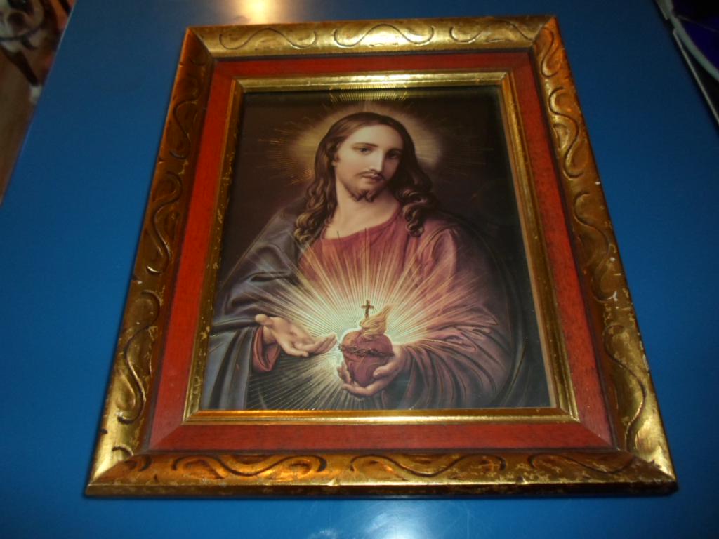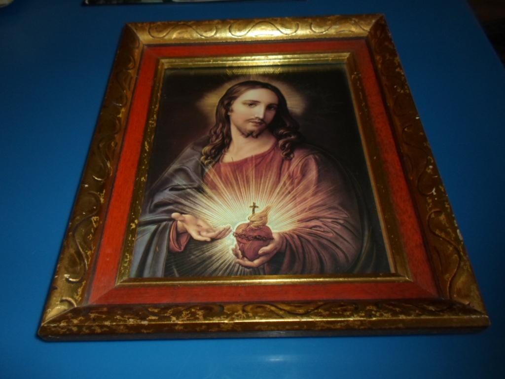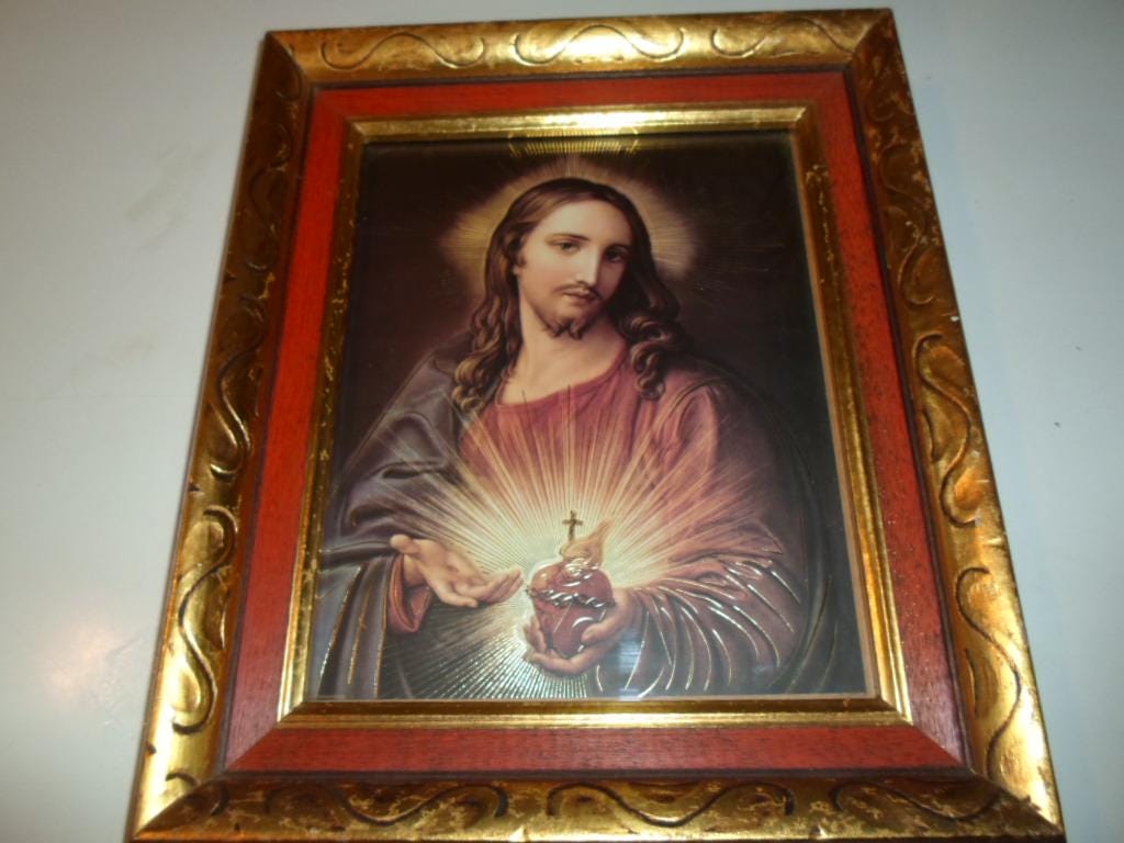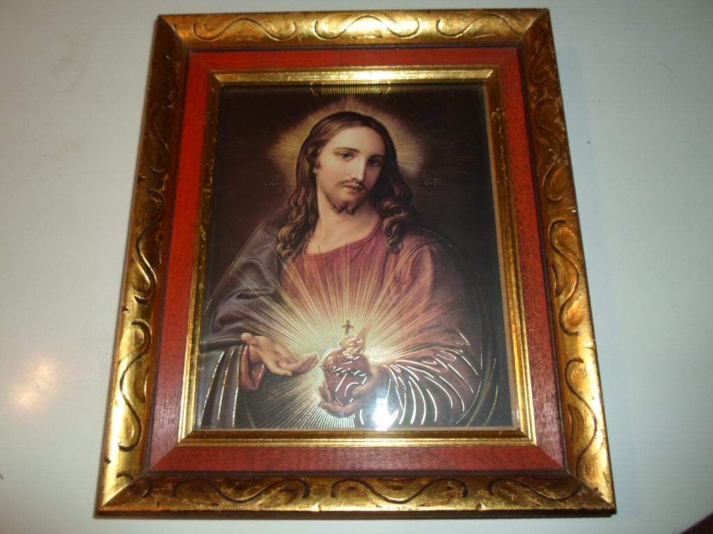 11"x`13"x 2" Heavy Thick Carved Wood Framed Compassionate Sacred Heart of Jesus. Truely one of the finest artist interpretation we have seen in a long time. The Gold Leaf highlighting on Jesus' body is unusual yet striking. Very Good Vintage Condition note photos.