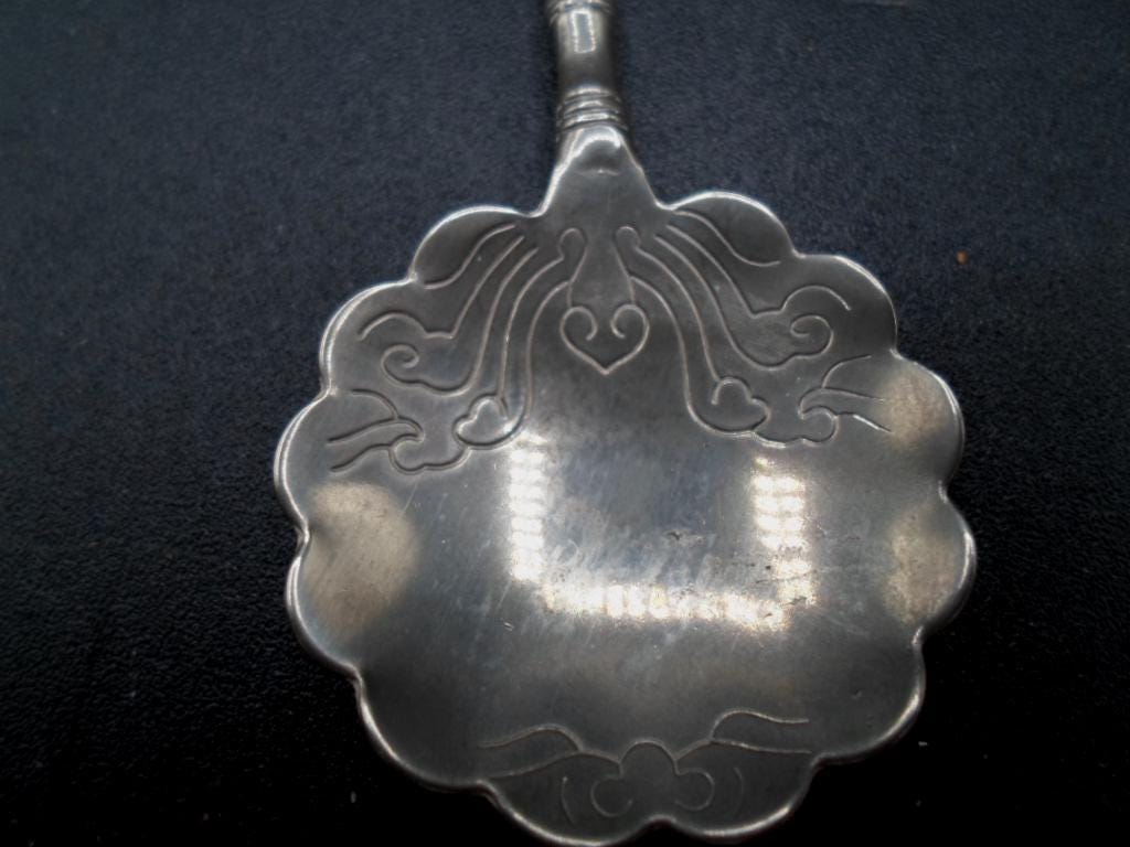 4"long Enamel top Signed Made in USA by Foat. The bowl of the spoon is 1"wide with etched details.