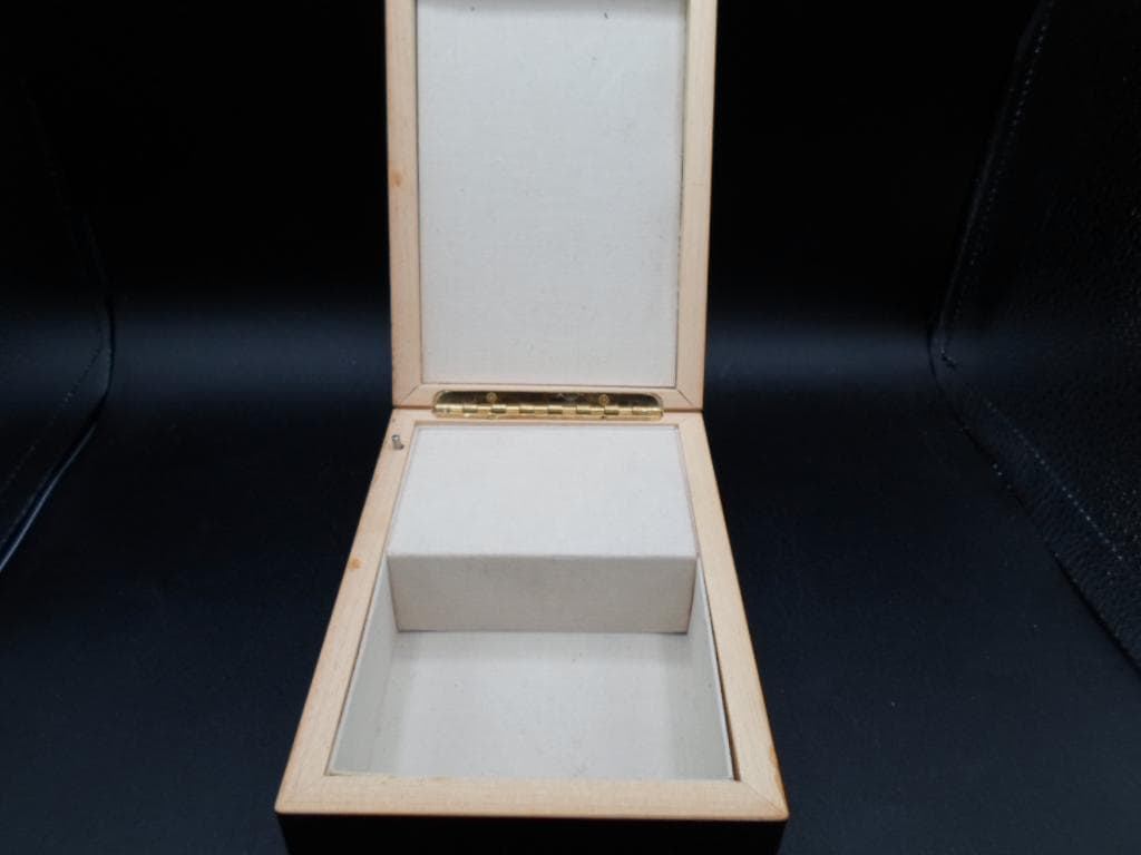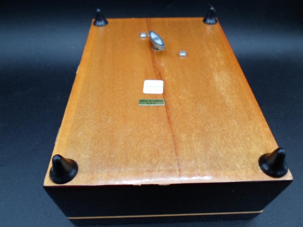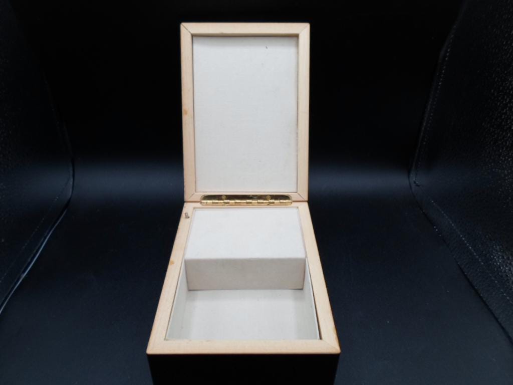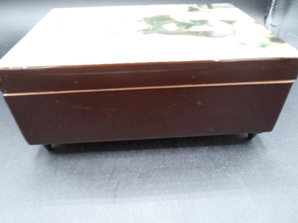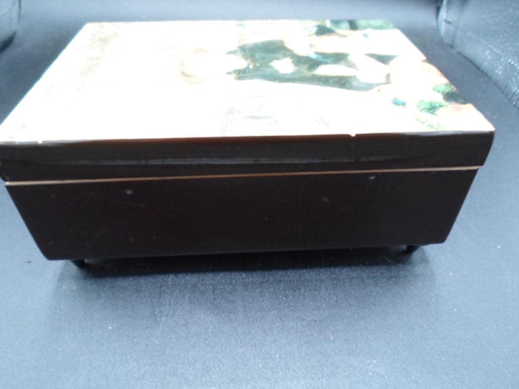 6"lx4.50"wx2"hi Beautiful Wood Lacquered Music Jewelry Trinket Box. Working Music Wind up plays the Infamous "Love Story". Very Good Vintage Condition note photos. A few very minor scratches on sides. Impressionist Elegance Pierre Auguste Renoir February 25,1841.