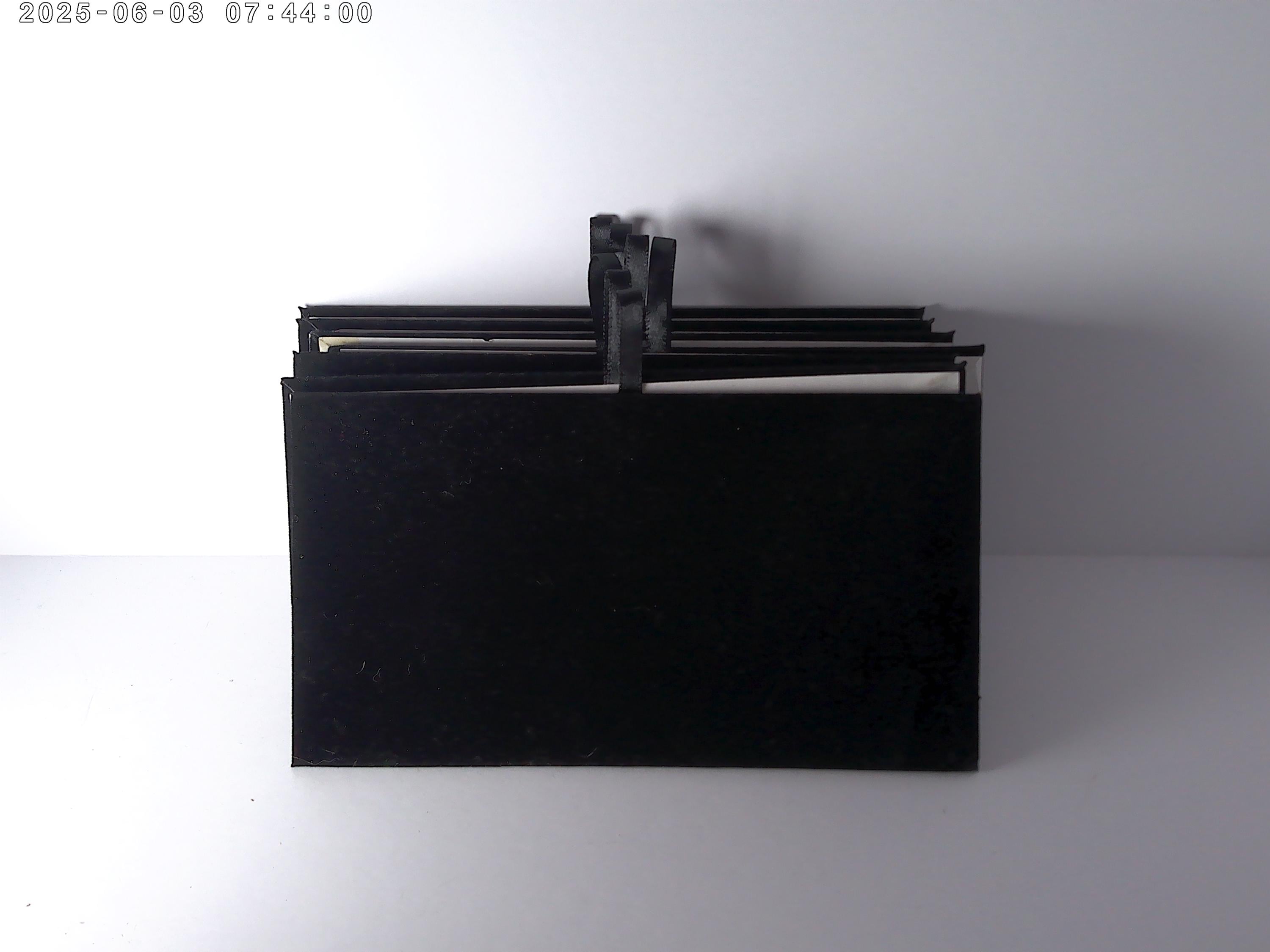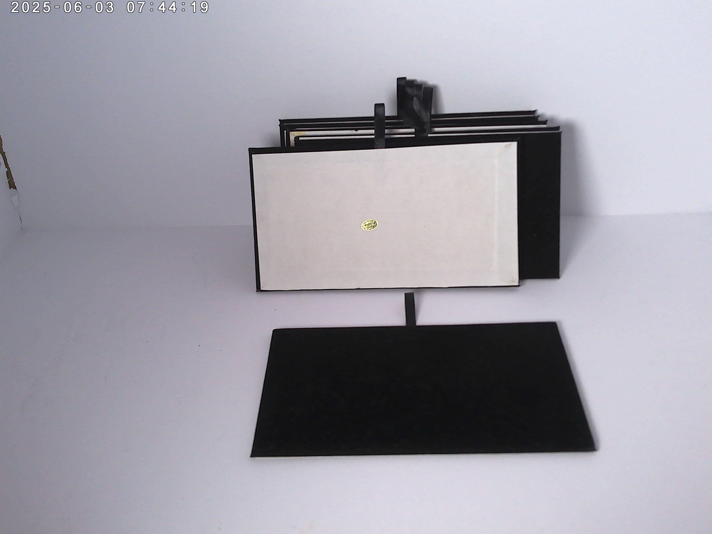 white board back, padded black velvet like top, satin pull for easy lift.