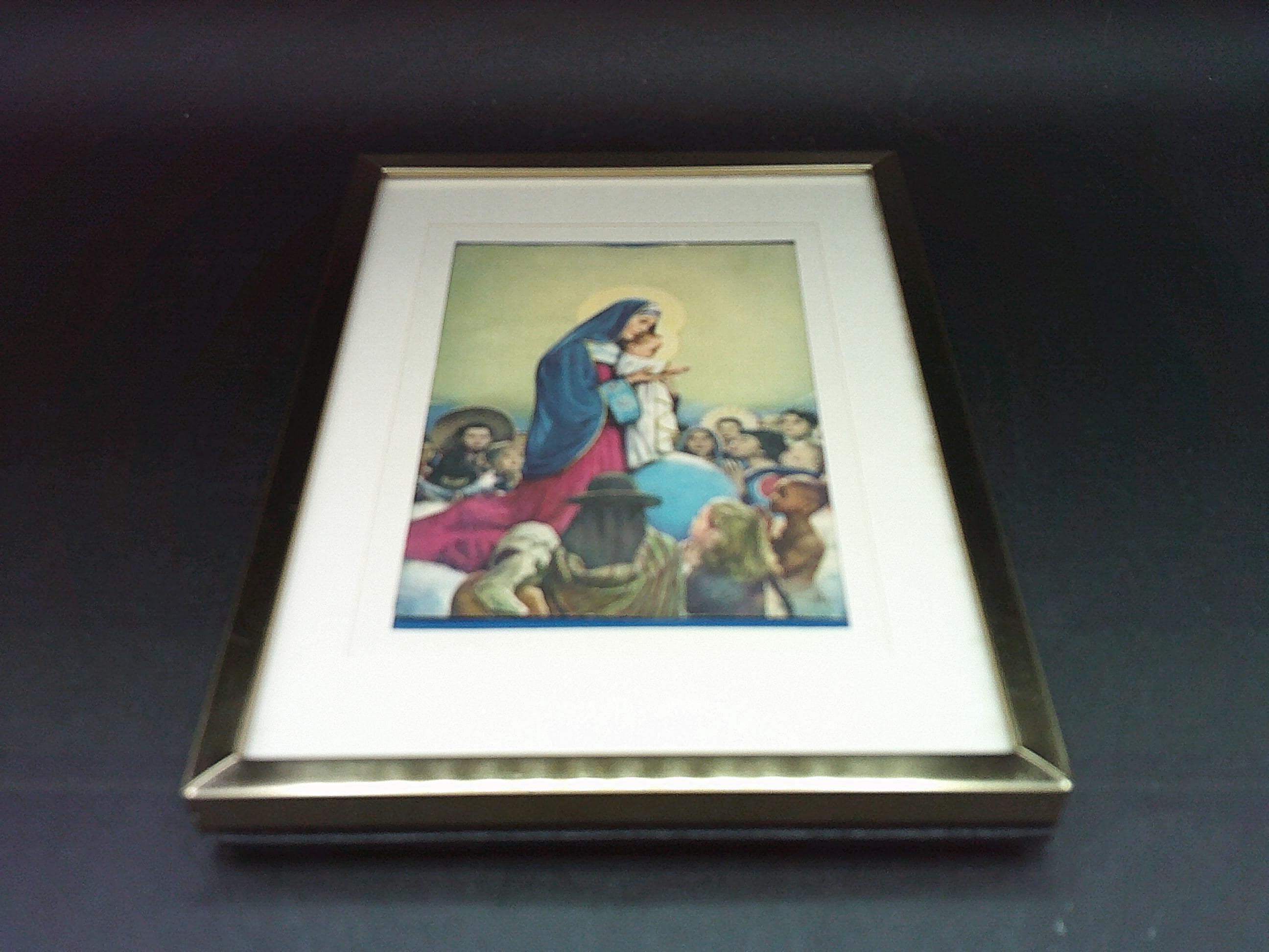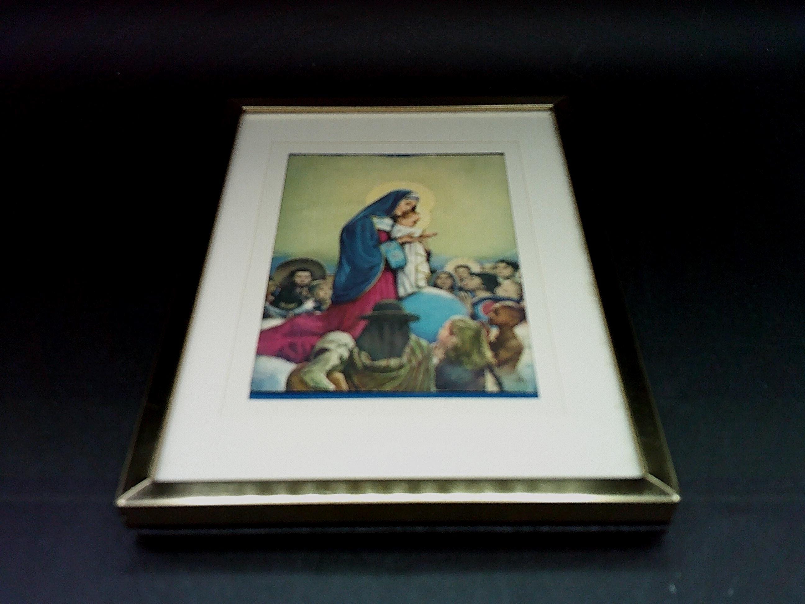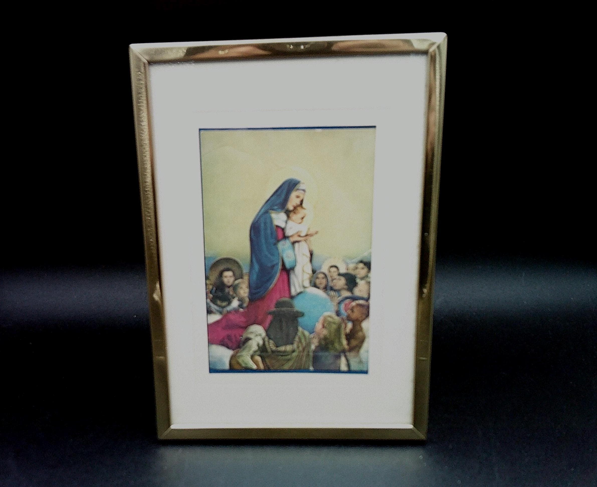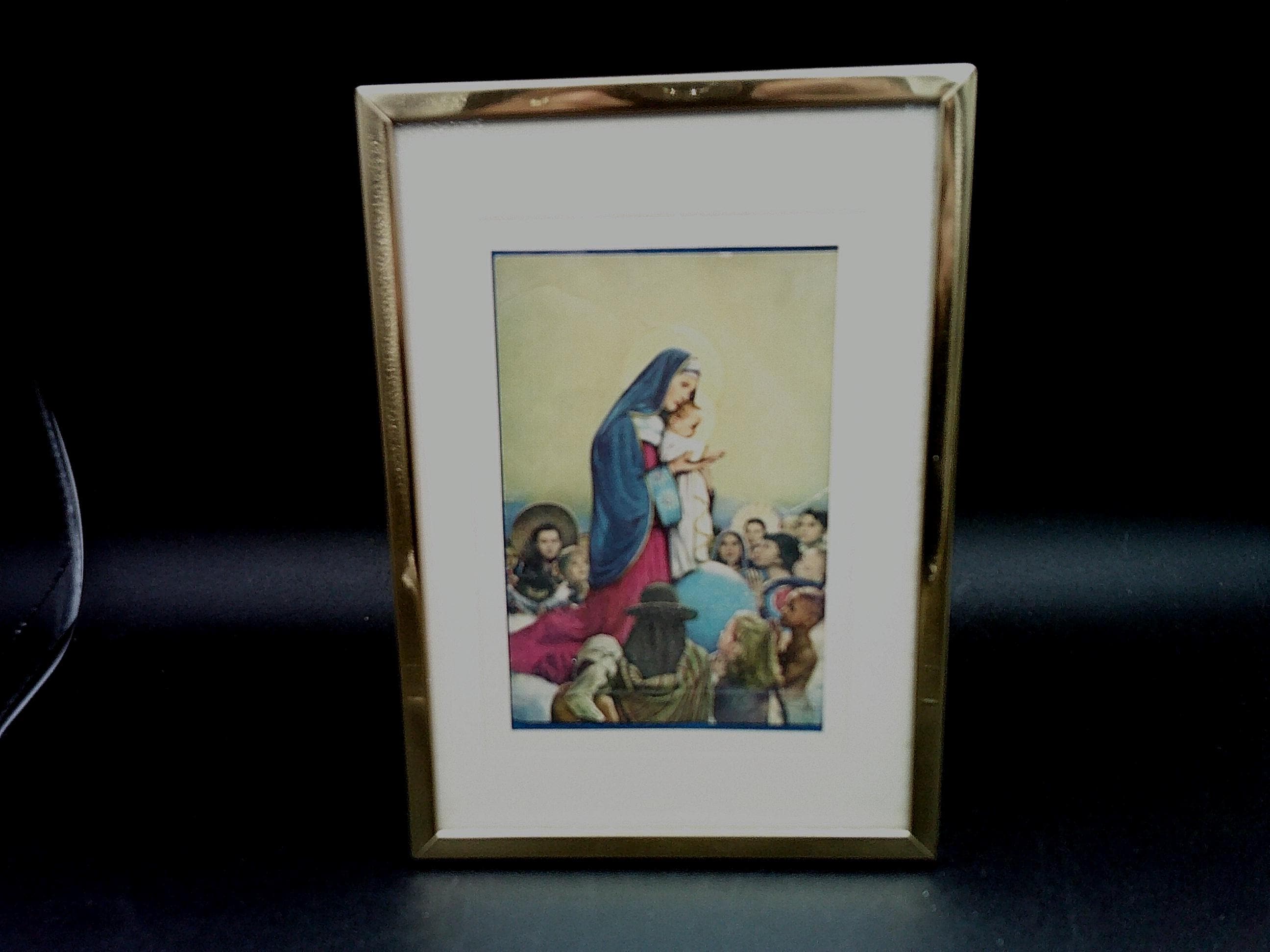 Vintage Art Deco Original Print Framed in Brass Virgin Mary Child Jesus People of many Cultures Brass Frame