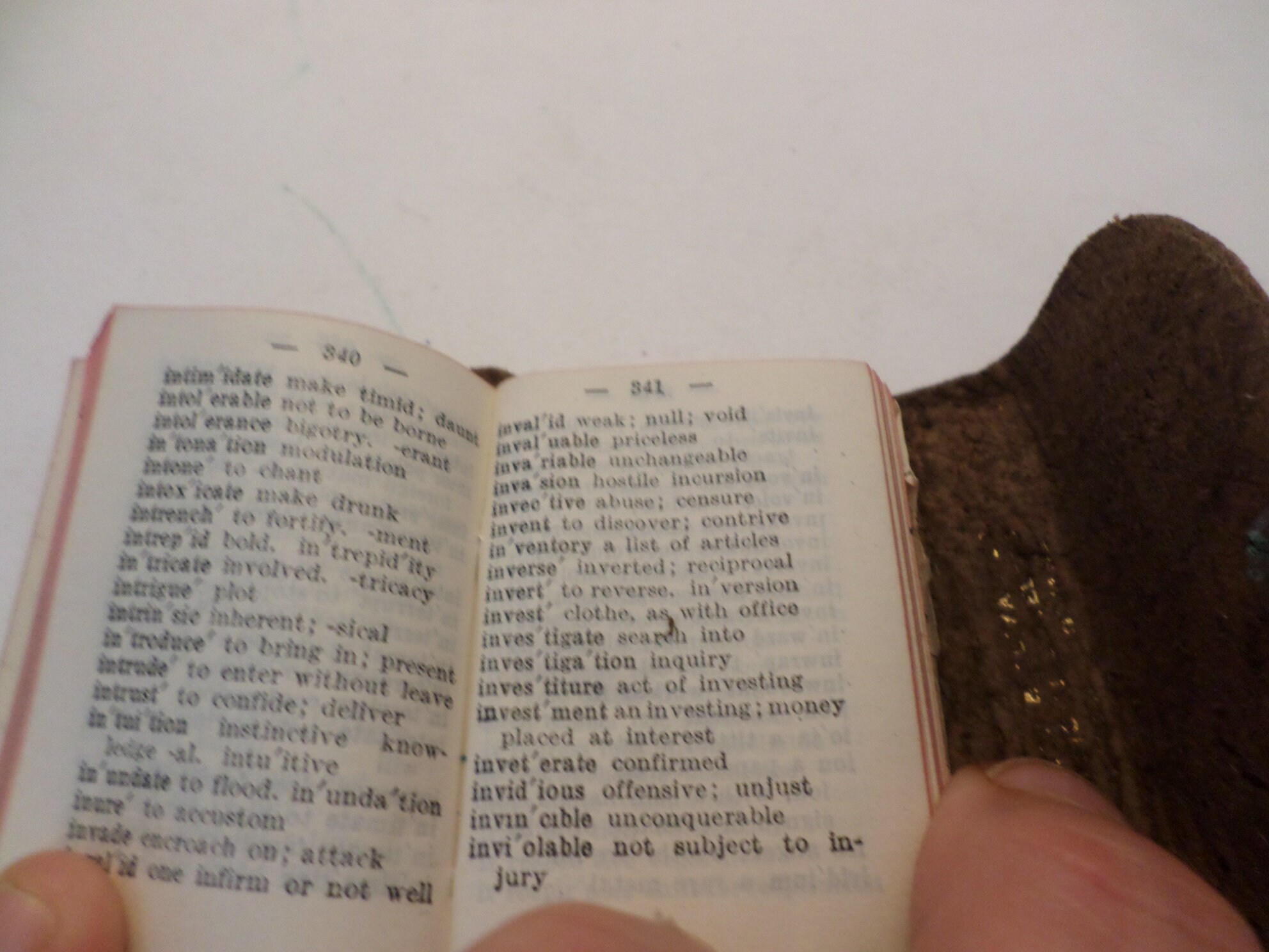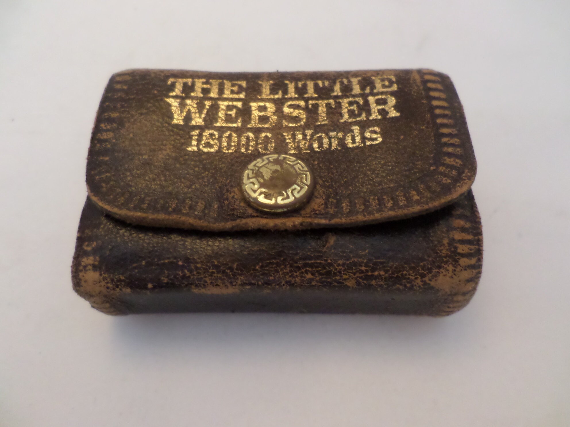 Vintage 1.5" by 2" leather wraped with snap front 1800 work dictionary, The Little Webster