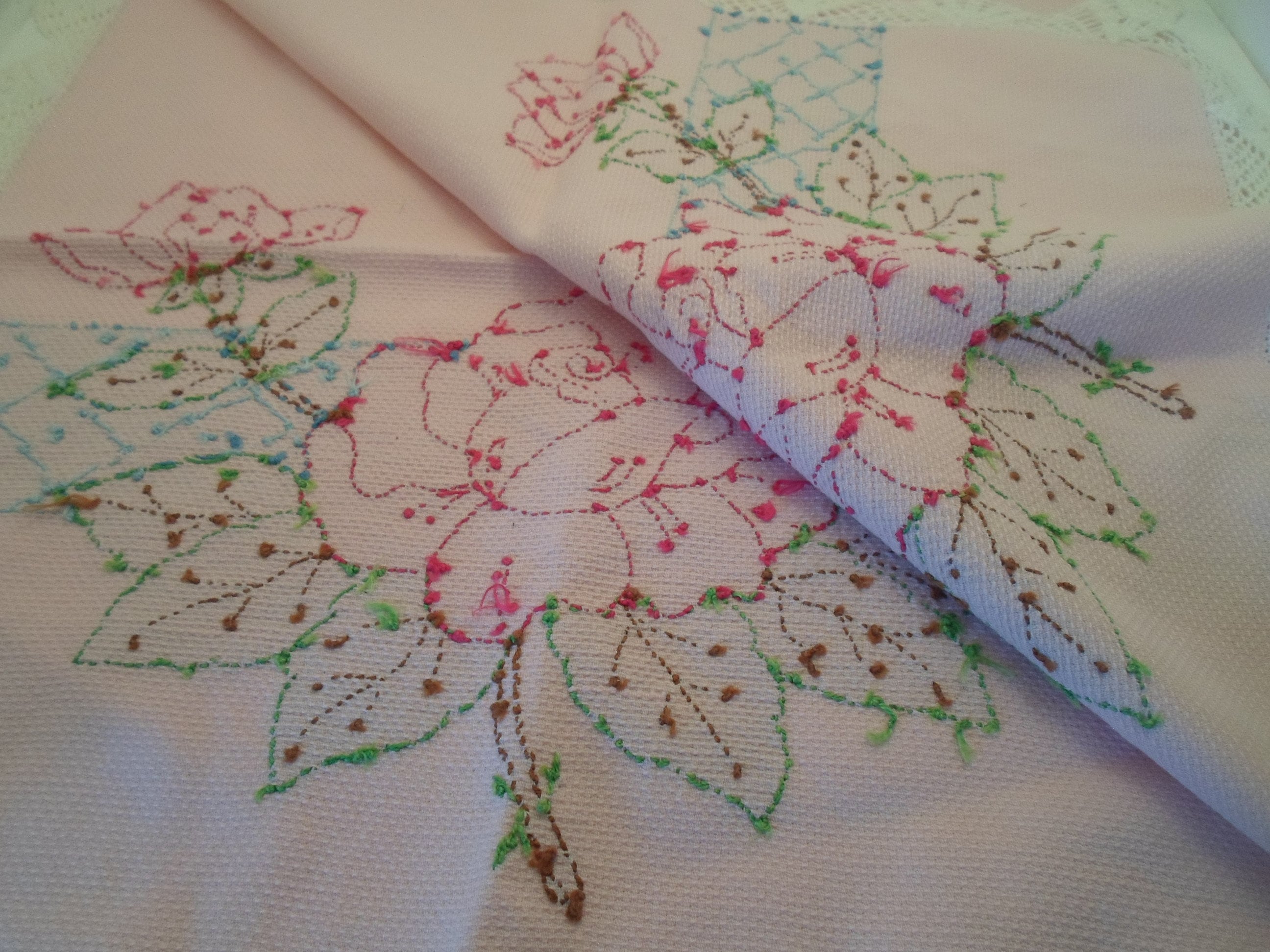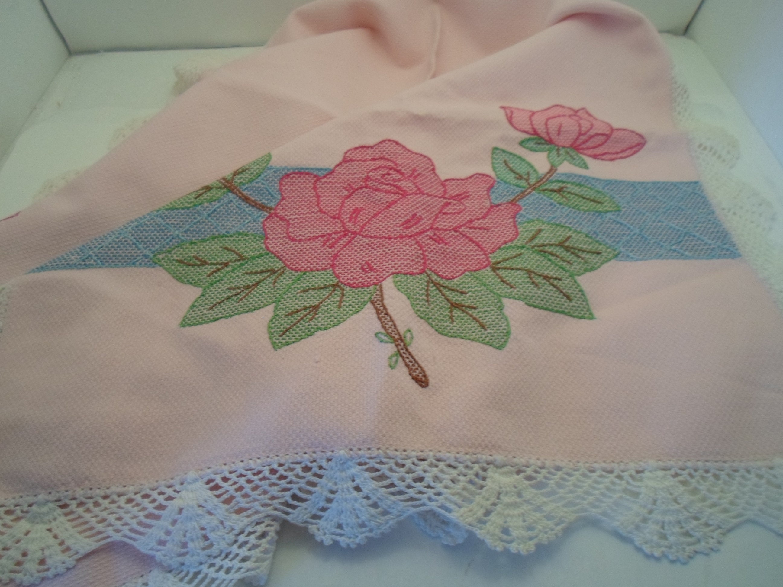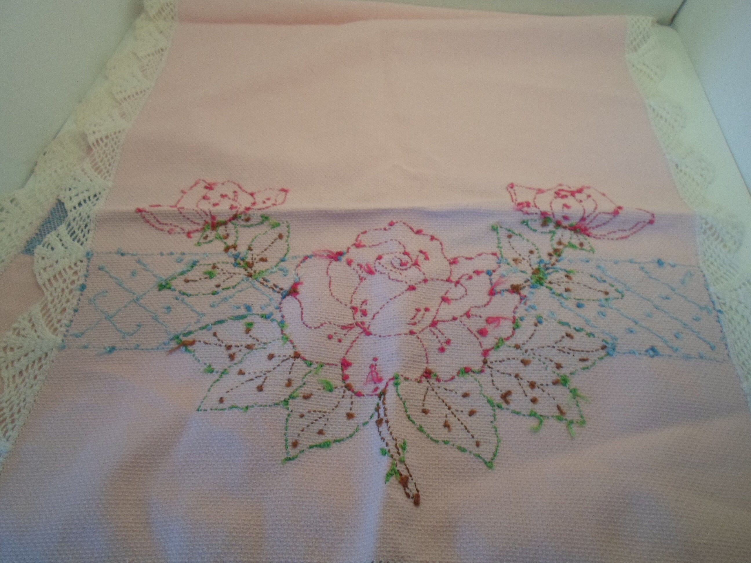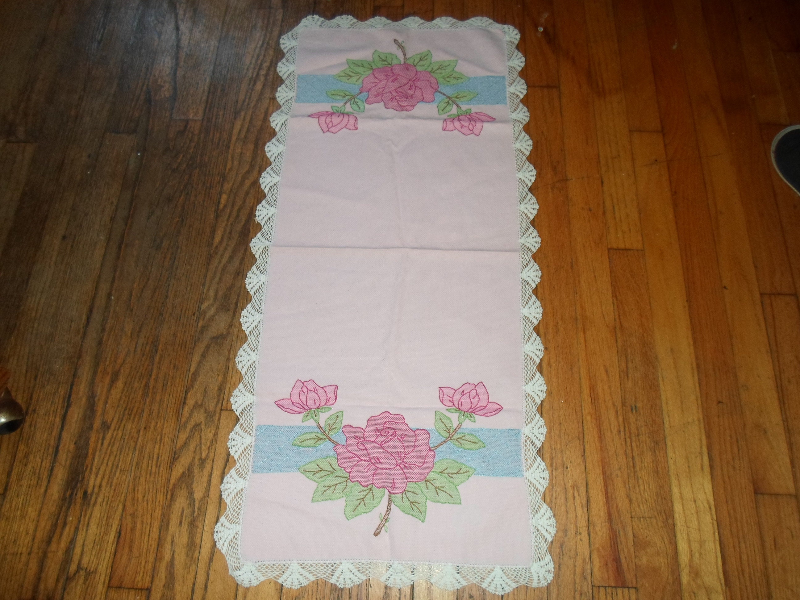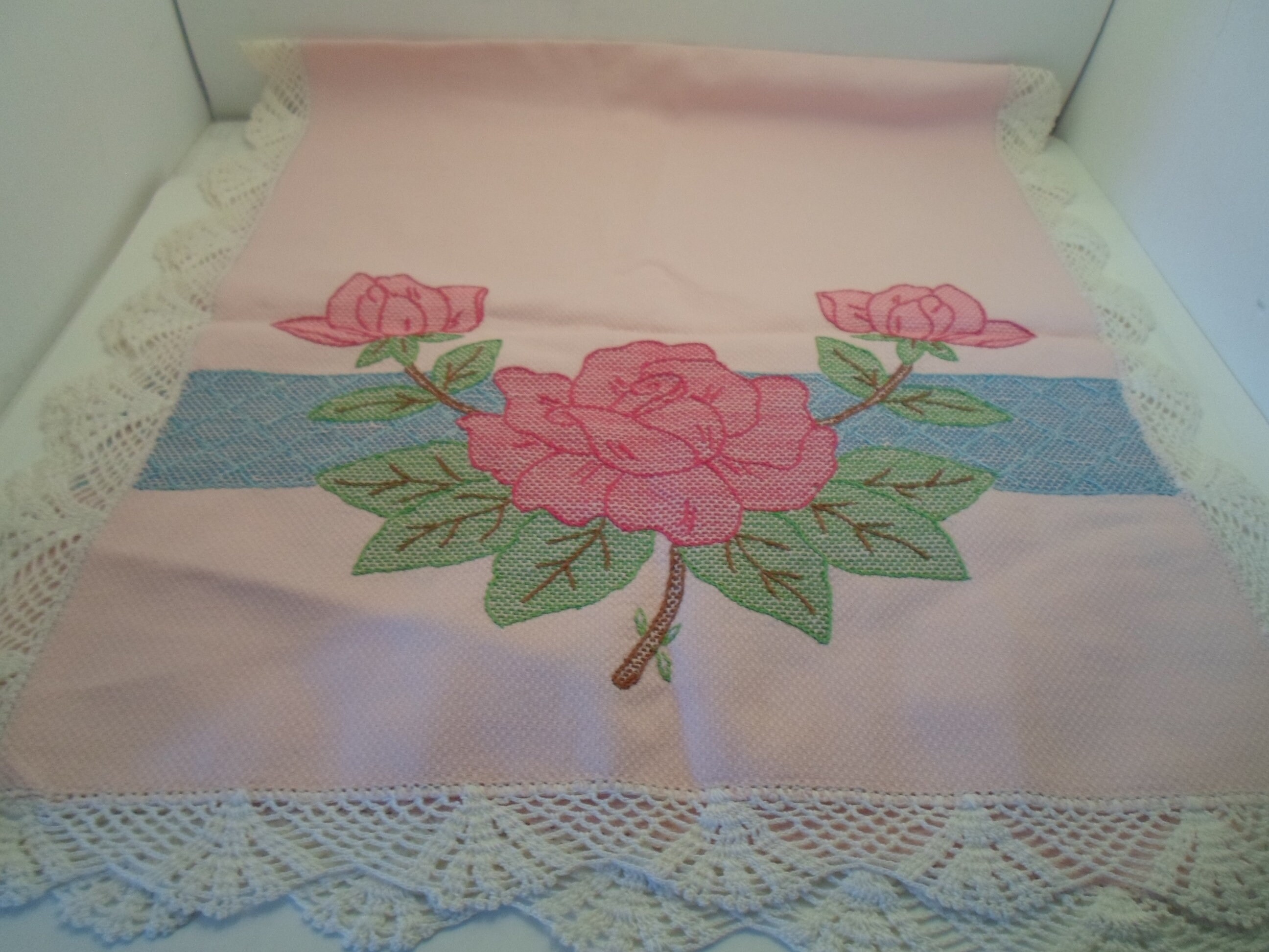 Art Deco Embroidered Table Runner Dresser Scarf Powder Pink Textured Cotton Large Roses Leaves Crocheted Edges