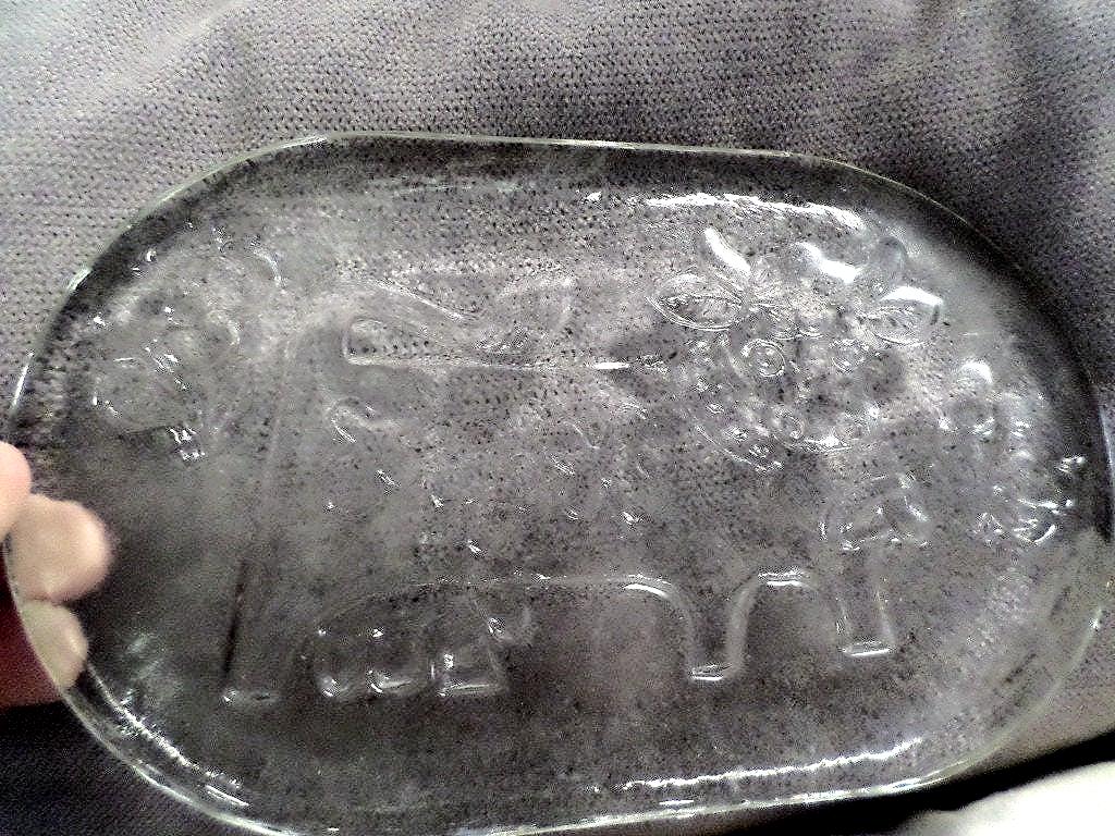 Vintage 60s Icy Glass Cow & Flowers Paperweight - Finland Trivet
