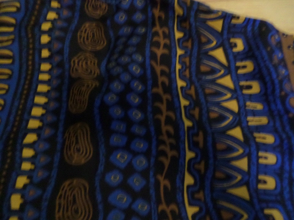 vibrant royal blue, gold, cigar brown and black tribal tiki like patterns
